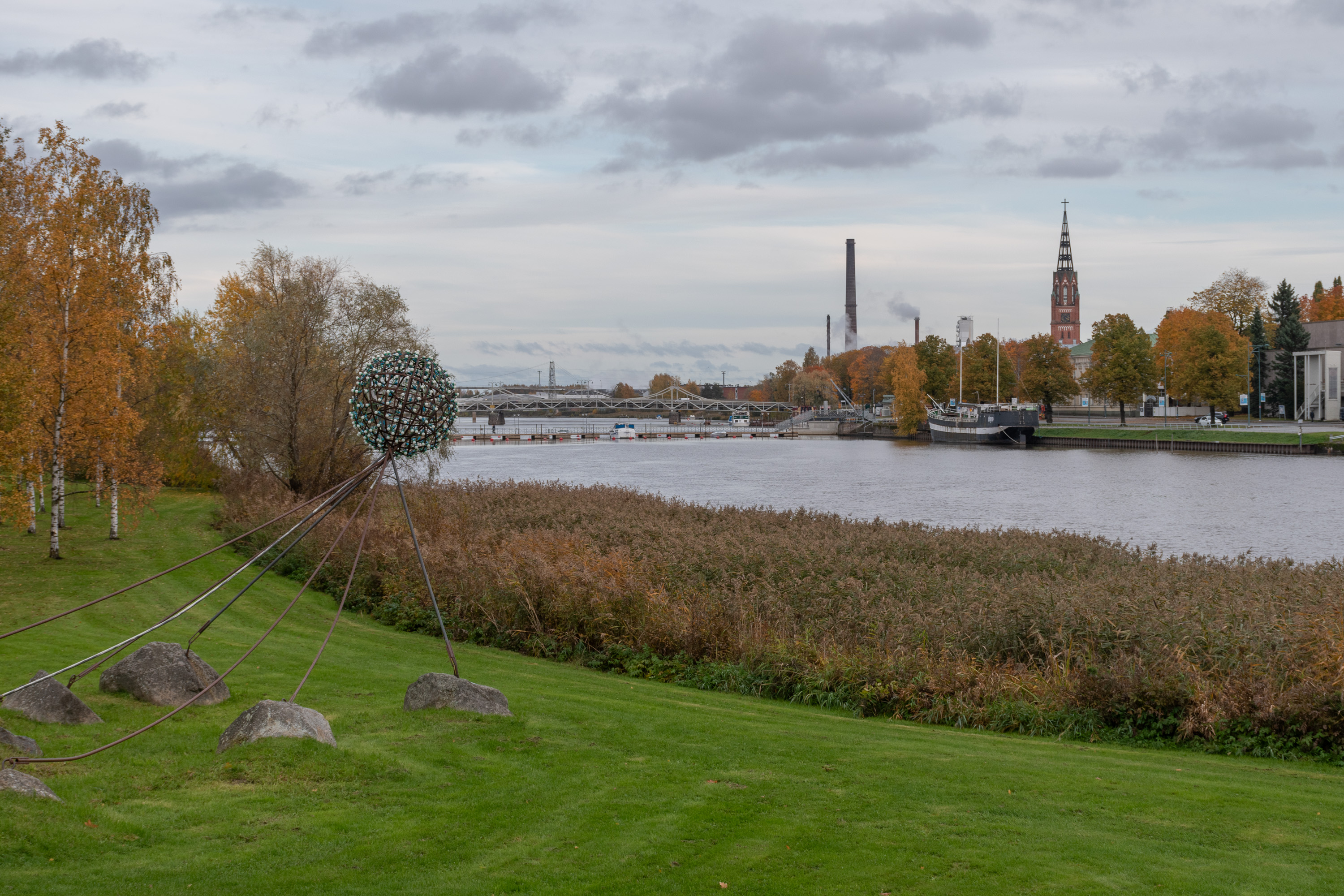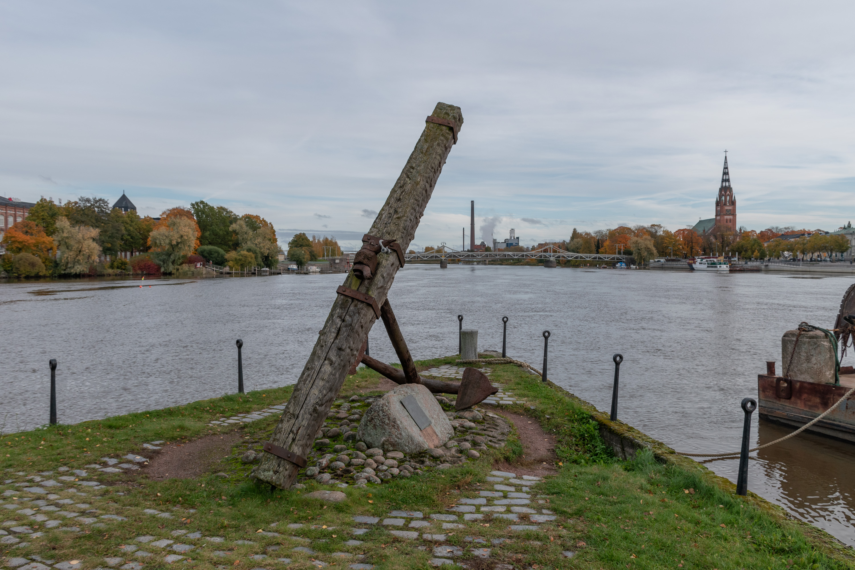 34. На стрелке Кирьюринлуото стоит якорь в честь поринских мореплавателей. Якорь, написано, настоящий, найден в 1991 в нескольких километрах от Репосаари, датируется второй половиной 18 века и изготовлен, скорее всего, либо в Петербурге, либо в Британии. За стрелкой как раз открывается вид на центр — хлопчатобумажный комбинат слева, церковь справа, Поринский мост в центре, ТЭЦ Айтталуото на заднем плане. Перед стрелкой летом работает посреди реки фонтан, но, видимо, в октябре уже все.