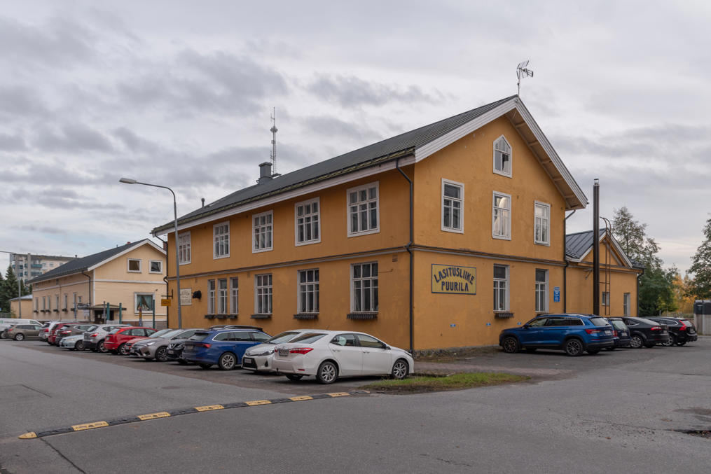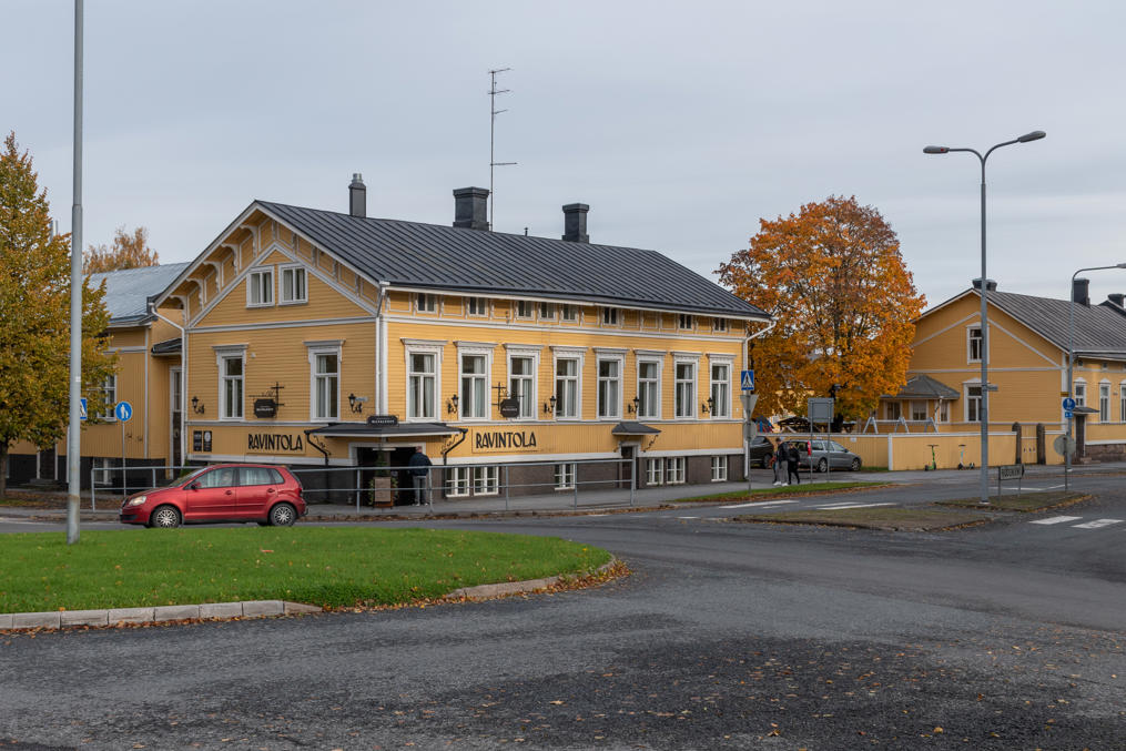 43. Несколько отдельных сохранившихся старых зданий в Карьяранте есть. Это бывшее главное здание скотобойни (а справа вывеска "Стекольная компания Пуурилы" — может, уже после скотобойни было); в доме слева на заднем плане сейчас хостел, как-то раз ночевал там — в ноябре — абсолютно никого в доме не было тогда, кроме меня.