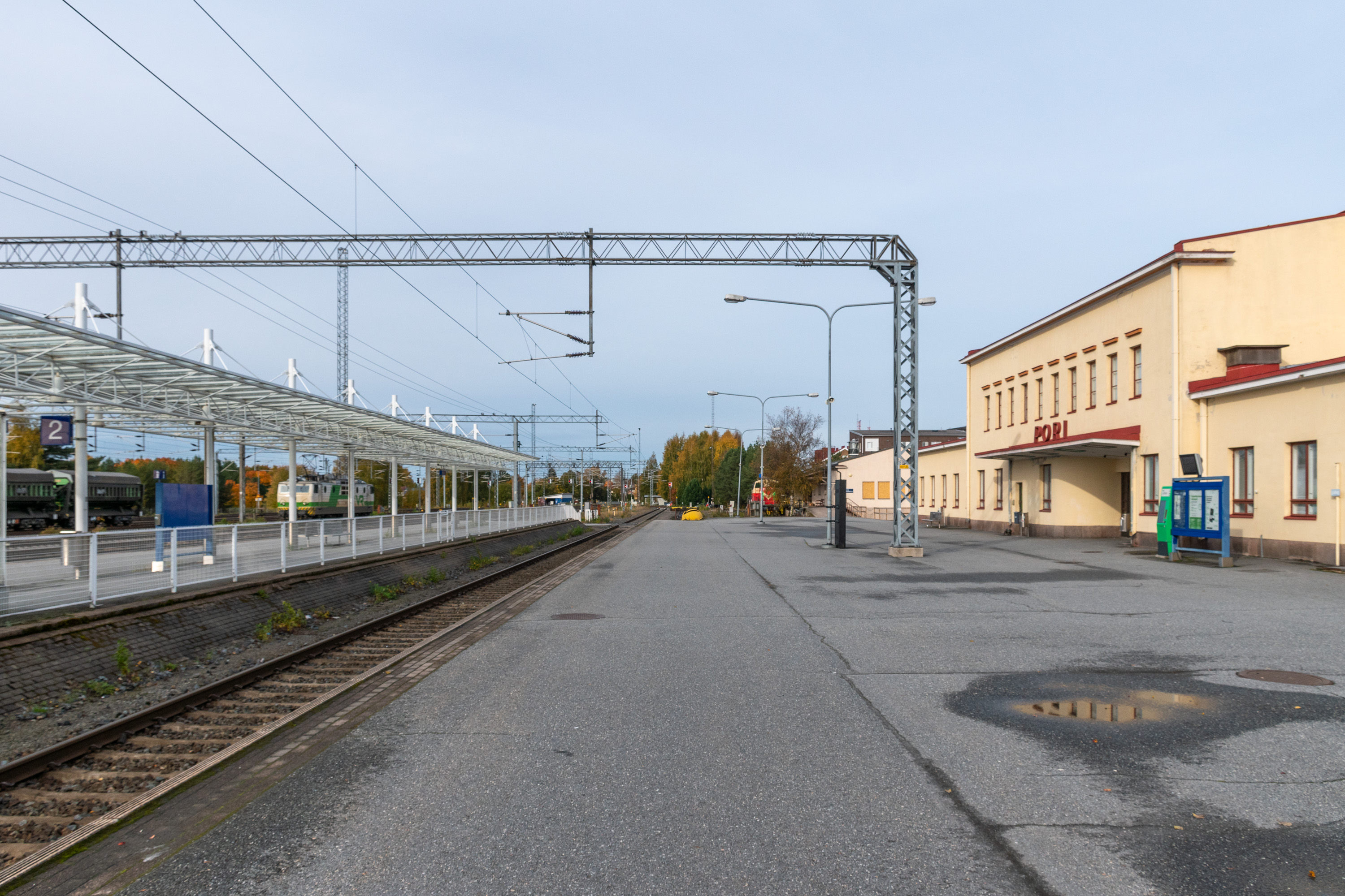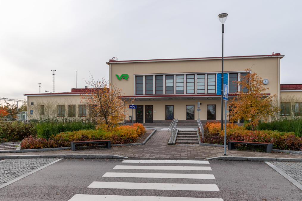 7. Сам же вокзал выглядит скучновато. Пори, как и Тампере, Турку, Куопио относится к городам с вокзалом в функционалистском стиле; как я писал в предыдущей части, вокзал был перенесен на это место с западного края центра в 1937; его архитектором, как и старого деревянного, стал Туре Хеллстрём (Thure Hellström). На мой взгляд, в данном случае получилось не очень выразительно. Ехать в Пори через Тампере с большинства направлений не очень удобно, так что в Пори чаще попадают автобусами — в сторону Хельсинки идет прямая дорога, Национальная трасса 2, а вдоль побережья, на юг во второй город региона Раума и в Турку и на север в Ваасу, тоже прямая Трасса 8. Вероятно, поэтому ж/д Тампере-Пори и не пытались реконструировать для более скоростного движения, здесь ограничение составляет 140 км/ч (на главных ж/д магистралях Финляндии до 200 км/ч). Но поездов ходит довольно много, движение по этой линии субсидируется государством (на главных ходах, например, Хельсинки-Оулу, оно на самоокупаемости), и благодаря более низкой скорости они по крайней мере делают больше остановок в небольших населенных пунктах, например, в Ваммале и Каркку. Грузовое движение, в основном в порты, сохраняется достаточно активное.