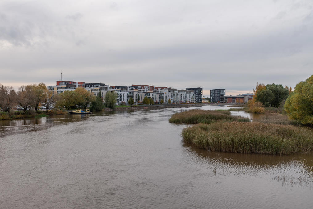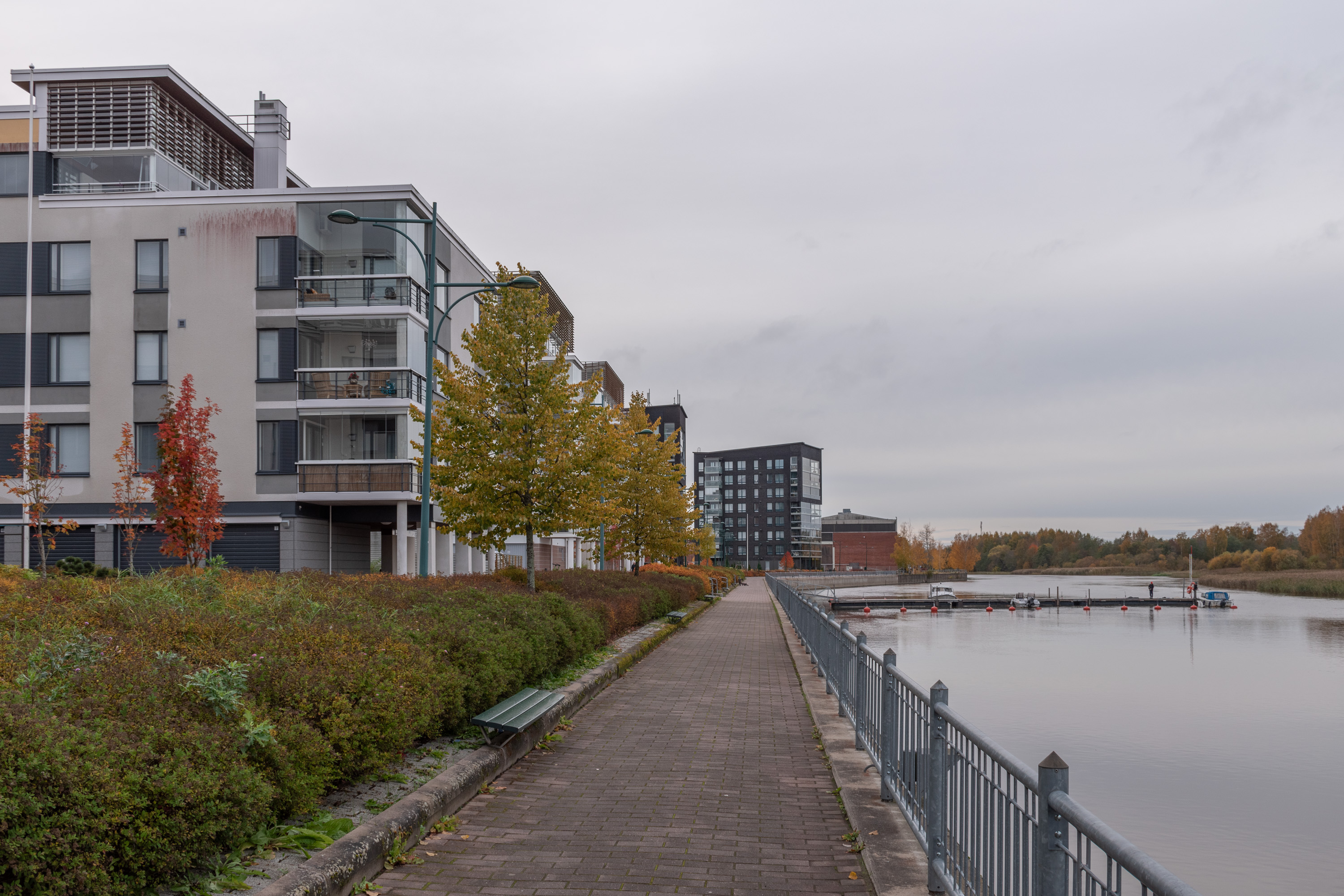 41. Набережная Рауманъюопы. Очередное неудобоваримо звучащее по-русски название, да. Большое красное здание вдали относится к промзоне, а за ней начинается еще несколько кварталов новостроек, уже в основном малоэтажных.