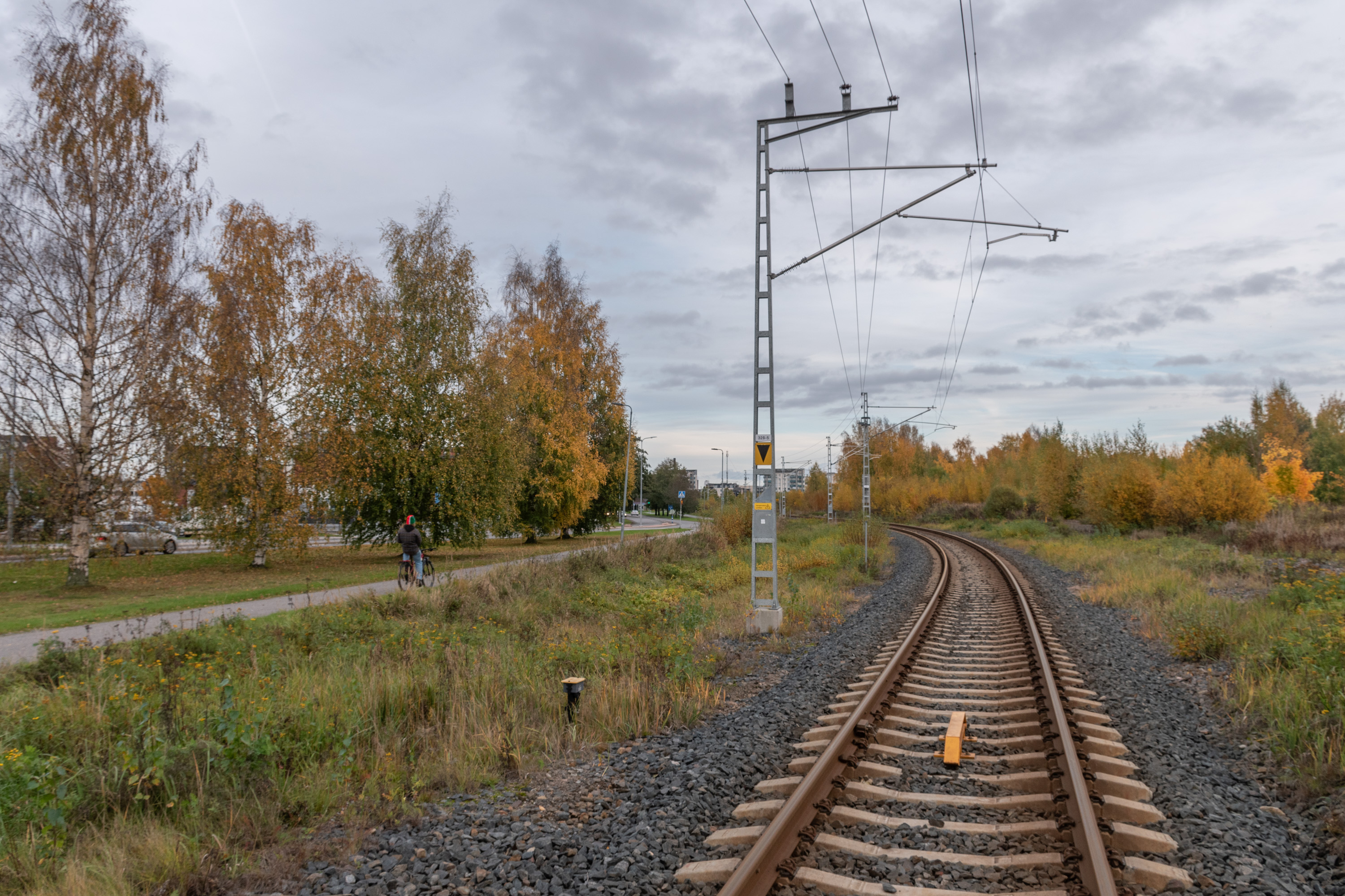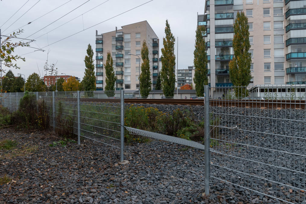 48. Народная тропка — проход в центр, в район бывшего старого вокзала — иногда и в Финляндии приходится людям выламывать секции забора вдоль ж/д — иначе жителями пары мелких кварталов за кладбищем действительно пришлось бы идти довольно далеко в обход. На заднем плане новые многоэтажки, построенные к северу от старого вокзала — это те карьярантские, на месте упомянутого выше Hankkija.