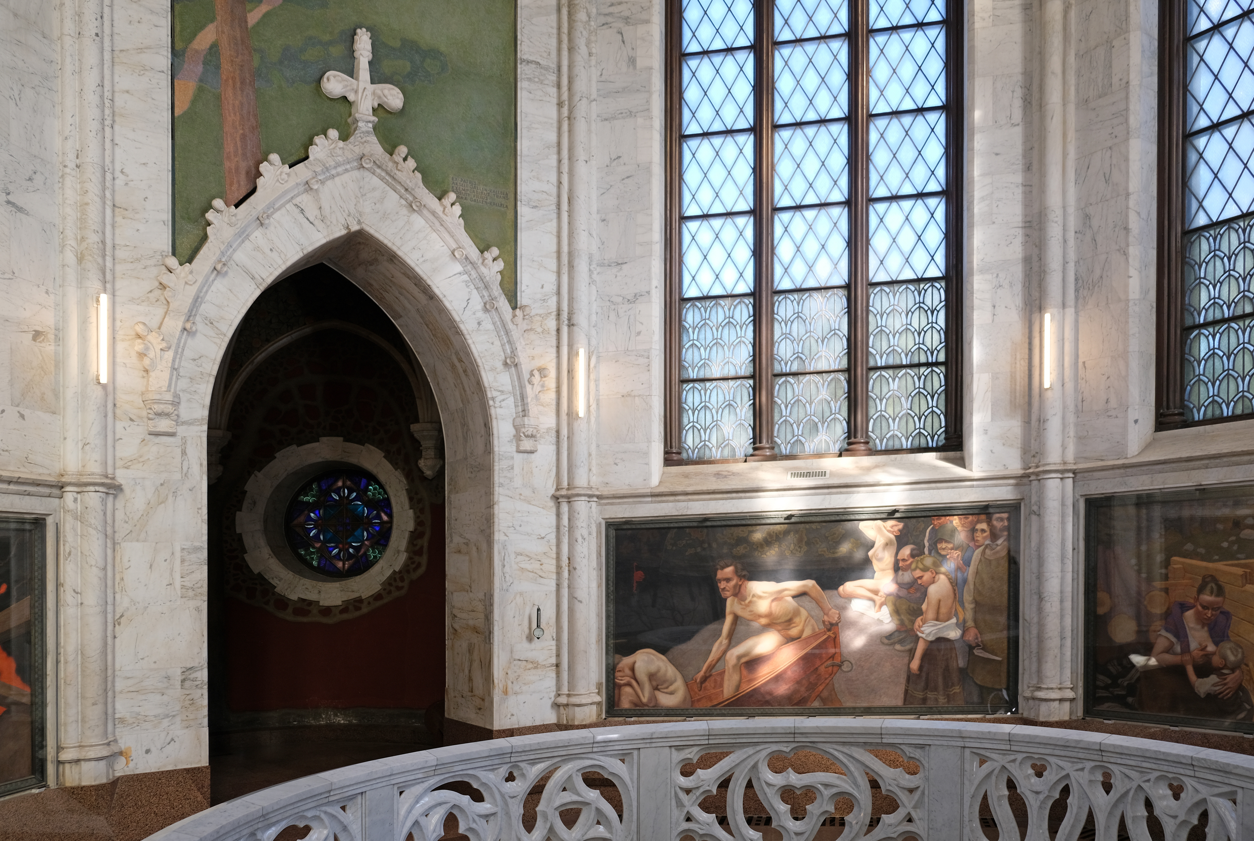 70. Юзелиус помер сам в 1930 и был похоронен в боковой крипте мавзолея. Наверное, в каком-то смысле хорошо, что и Юзелиус, и Галлен-Каллела уже умерли к тому времени, как в 1931 в ходе ремонта, предпринятого свежеоснованным фондом Сигрид Юзелиус, мавзолей сгорел, и интерьер был почти полностью уничтожен. Восстановить мавзолей полностью смогли к 1941. Копии фресок сумел перерисовать сын Галлен-Каллелы, Йорма Галлен-Каллела (Jorma Gallen-Kallela, 1898-1939), успел до того, как на Зимней войне погиб в первый же день; Йорма тоже был художником, но и близко не столь знаменитым, как отец. После этого пожара ничего катастрофичного с мавзолеем больше пока не происходило.