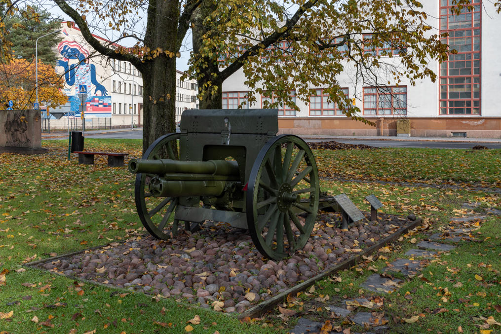 3. Полевая 76 мм пушка Путиловского завода, 76 K 02 по финской номенклатуре. Пара сотен таких пушек остались в Финляндии от российских гарнизонов после отделения от России. В Зимнюю войну они были наиболее многочисленной моделью артиллерии Финляндии, и, как следует из таблички, в частности ими был вооружена 3-я батарея 9-го полевого артиллерийского полка (III/KTR 9), состоявшего из выходцев из Пори и сражавшегося под Толваярви-Ягляярви-Айттойоки (Корписелькя, Северное Приладожье), а в Войну-Продолжение потом 1-я батарея 12-го полевого артиллерийского полка (I/KTR 12).