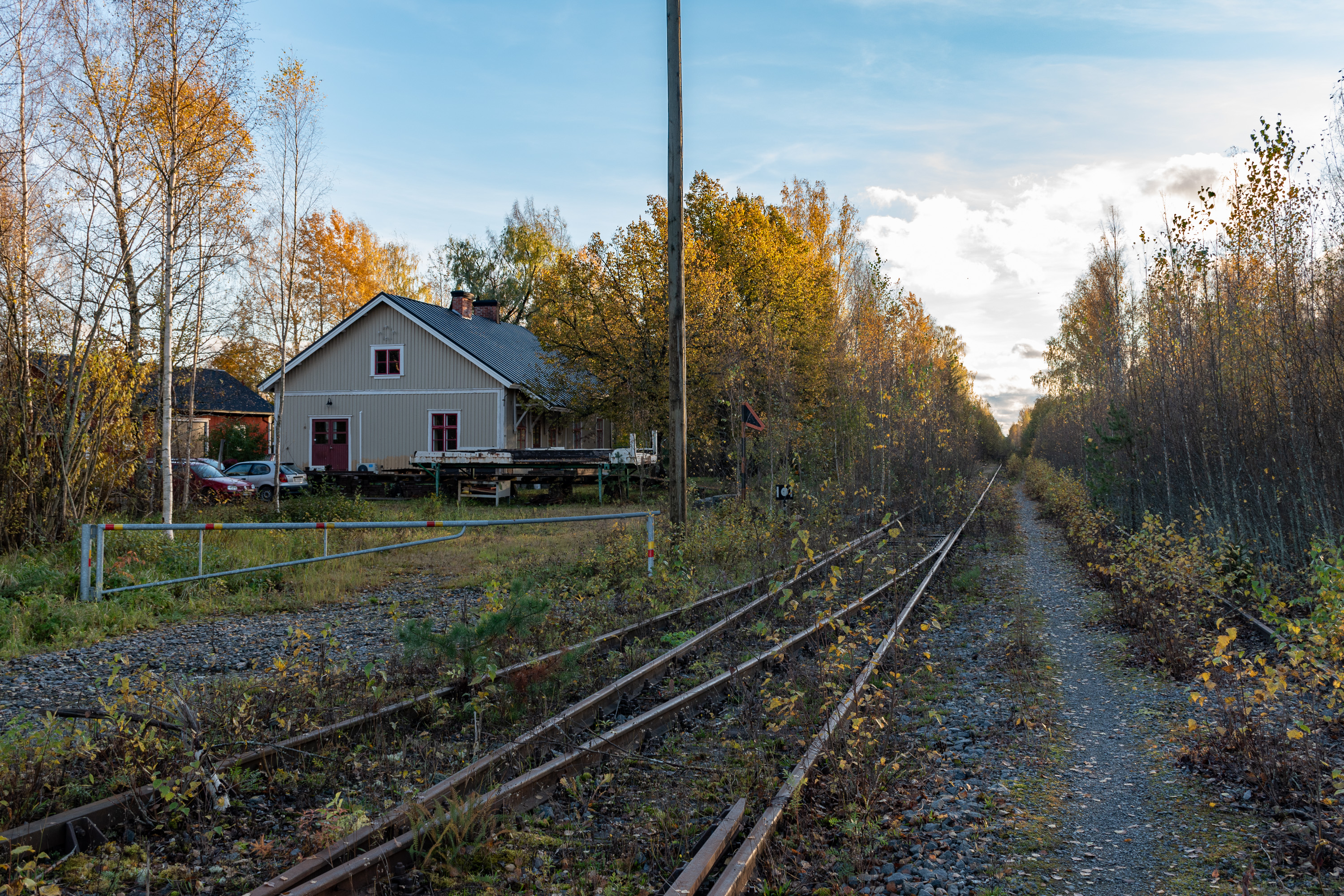 34. Западной границей этого района служит железнодорожная станция Айтталуото (Aittaluoto, фин. Сарайный риф). Она расположена на железной дороге Пори-Хаапамяки, почти двухсоткилометровой и почти полностью заброшенной в наши дни. Я совсем недавно писал про нее в посте про Помаркку, где по заброшенному ее участку дают покататься на прокатных дрезинах, так что сейчас повторяться не буду. Со стороны Пори на данный момент действует только совсем короткий участок до этой станции, километра четыре — через эту станцию возят лес на лесопилку Сейкку в промзоне Айтталуото. Из строений на станции единственный крошечный домик, заброшеный и со всех сторон полностью плотно заросший леском.