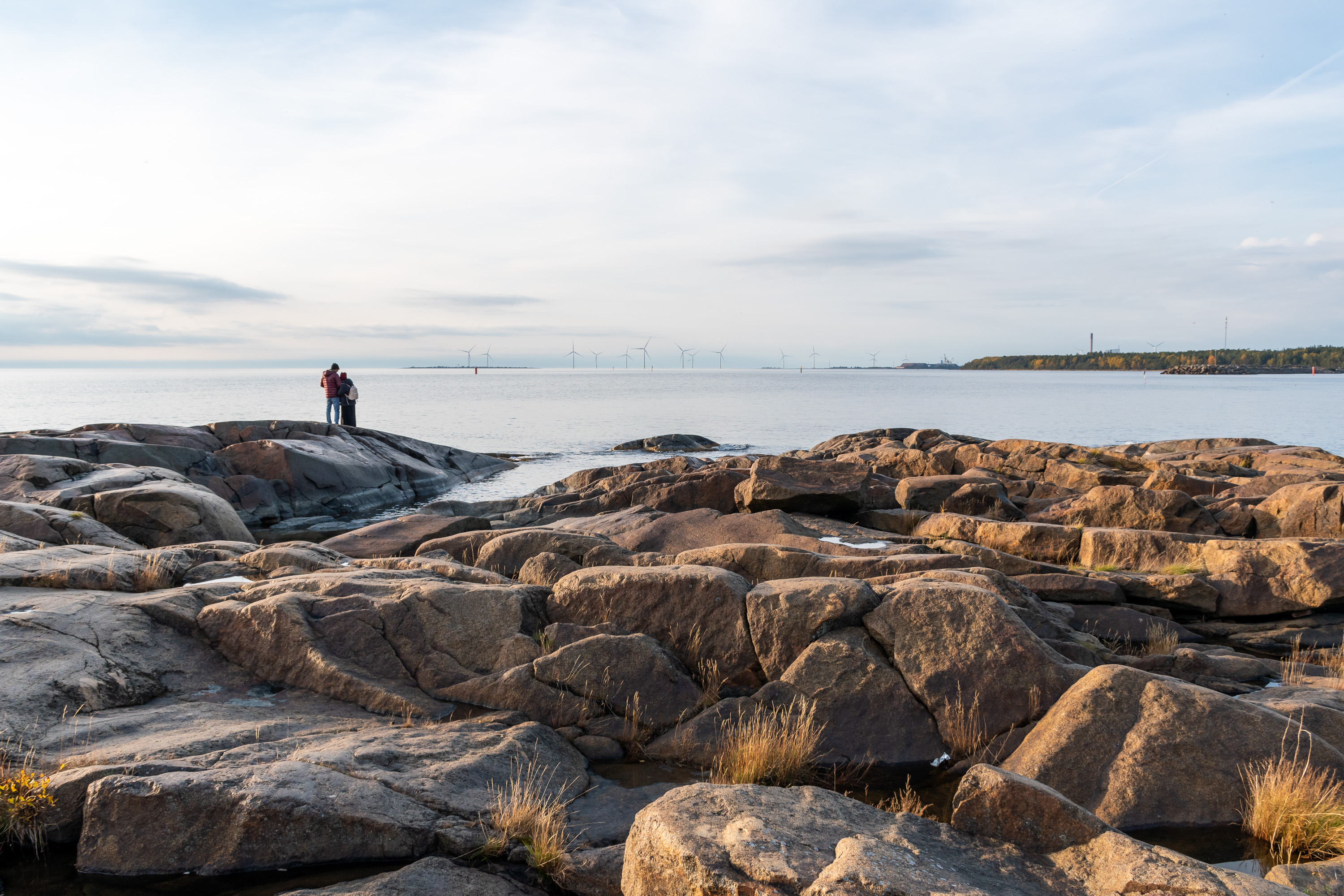 26. Ну а если проехать еще дальше за Унилуото, то за короткой дамбой дорога наконец кончается на маленьком, 700x250 м (не считая мола), острове под пиратским названием Калло (Kallo) — "Череп" — не знаю, не нашел про этимологию, может, тут от слова kallio, "скала", пошло, потому что остров, действительно, очень скалистый; в пользу этого говорит то, что также его зовут Mäntykallo, буквально "Сосновый череп" тогда :) И скалы у воды здесь очень красивые. С них виден остров Репосаари, справа, и ветровая электростанция Тахколуото в море.