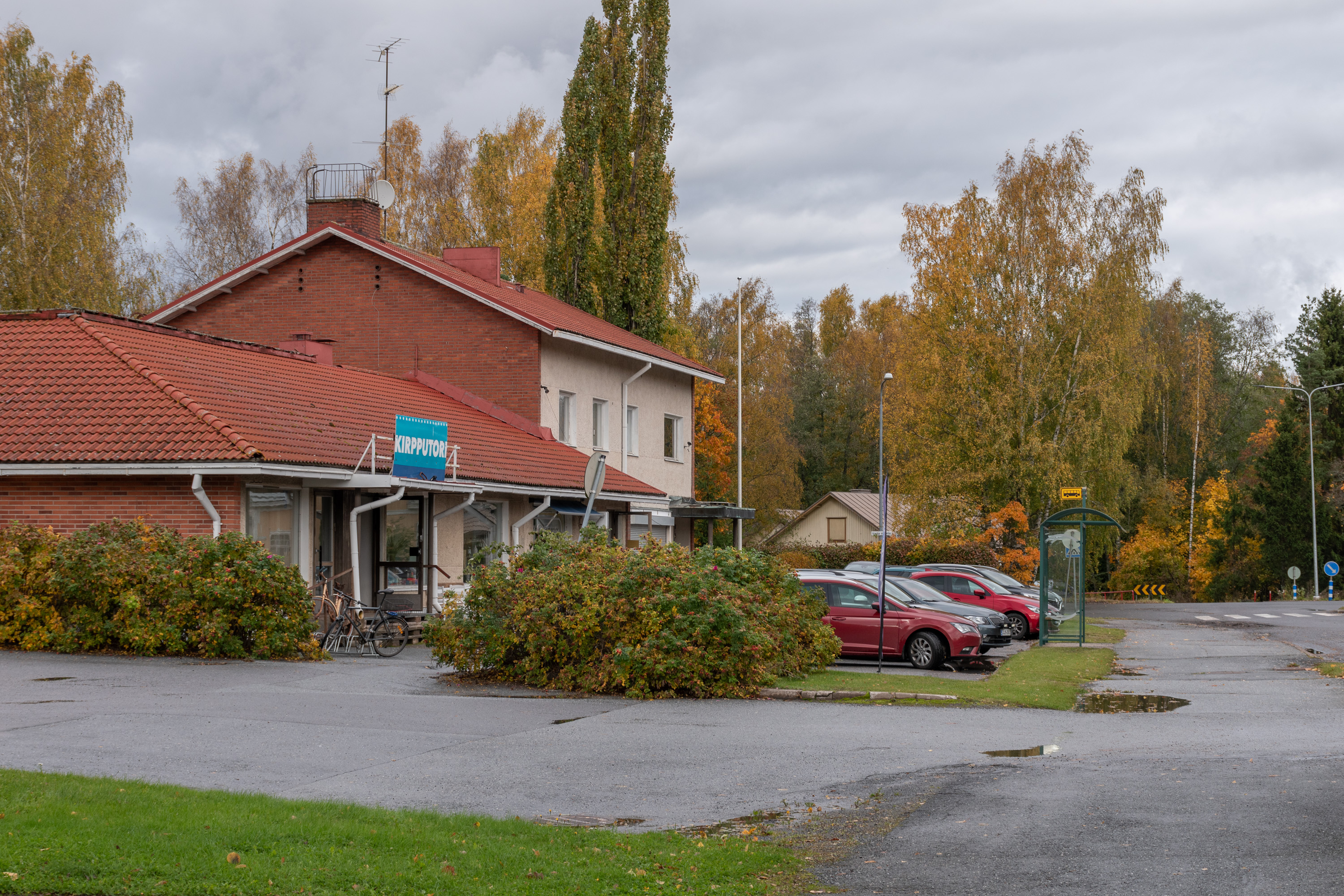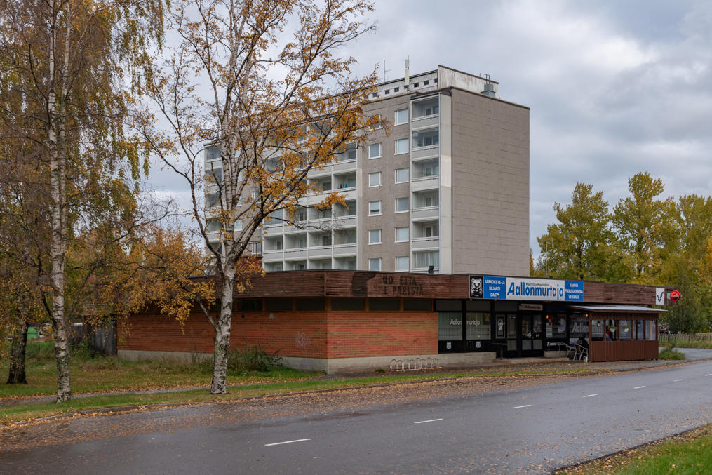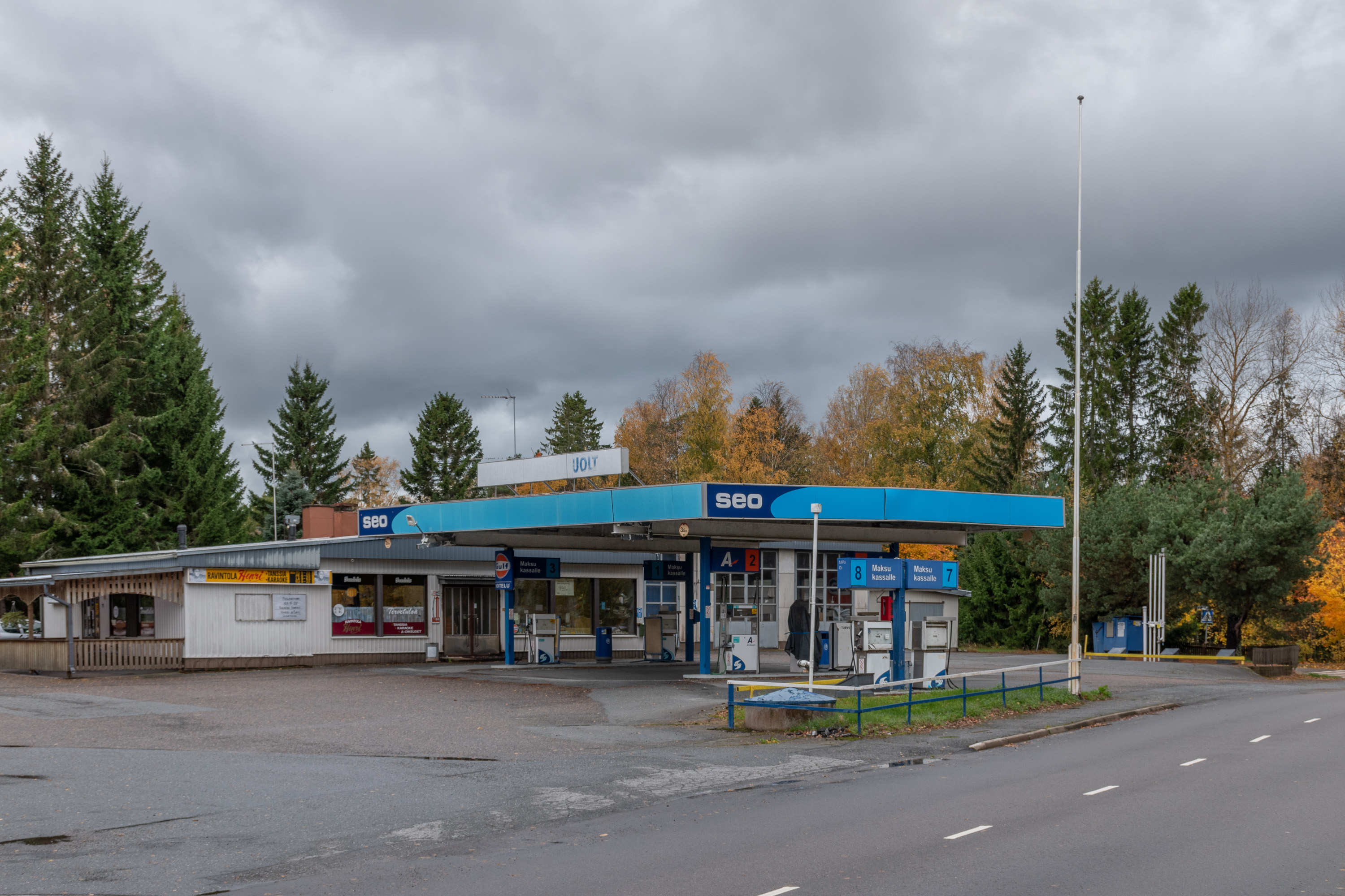 36. Заправка старая, хотя и с действующим при ней баром; колонка с автоматом для оплаты картой одна всего, и то не уверен, что работает. Должен признаться, что за все мои путешествия по Финляндии и Северным Странам мне ни разу не доводилось заправляться с оплатой в кассе — к тому моменту, когда я начал такими путешествиями заниматься, а именно с 2015, почти ровно десять лет назад, автоматы уже были если не повсеместны, то очень широко распространены, ну а в наши дни и вовсе раритетом стали заправки без них.