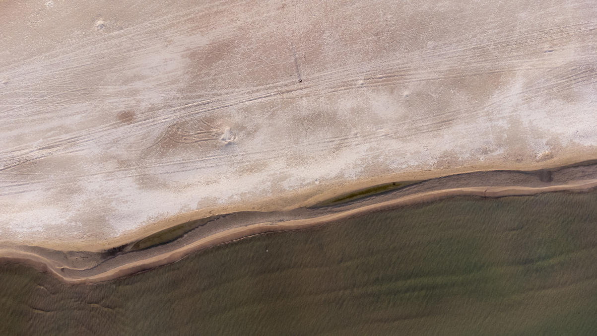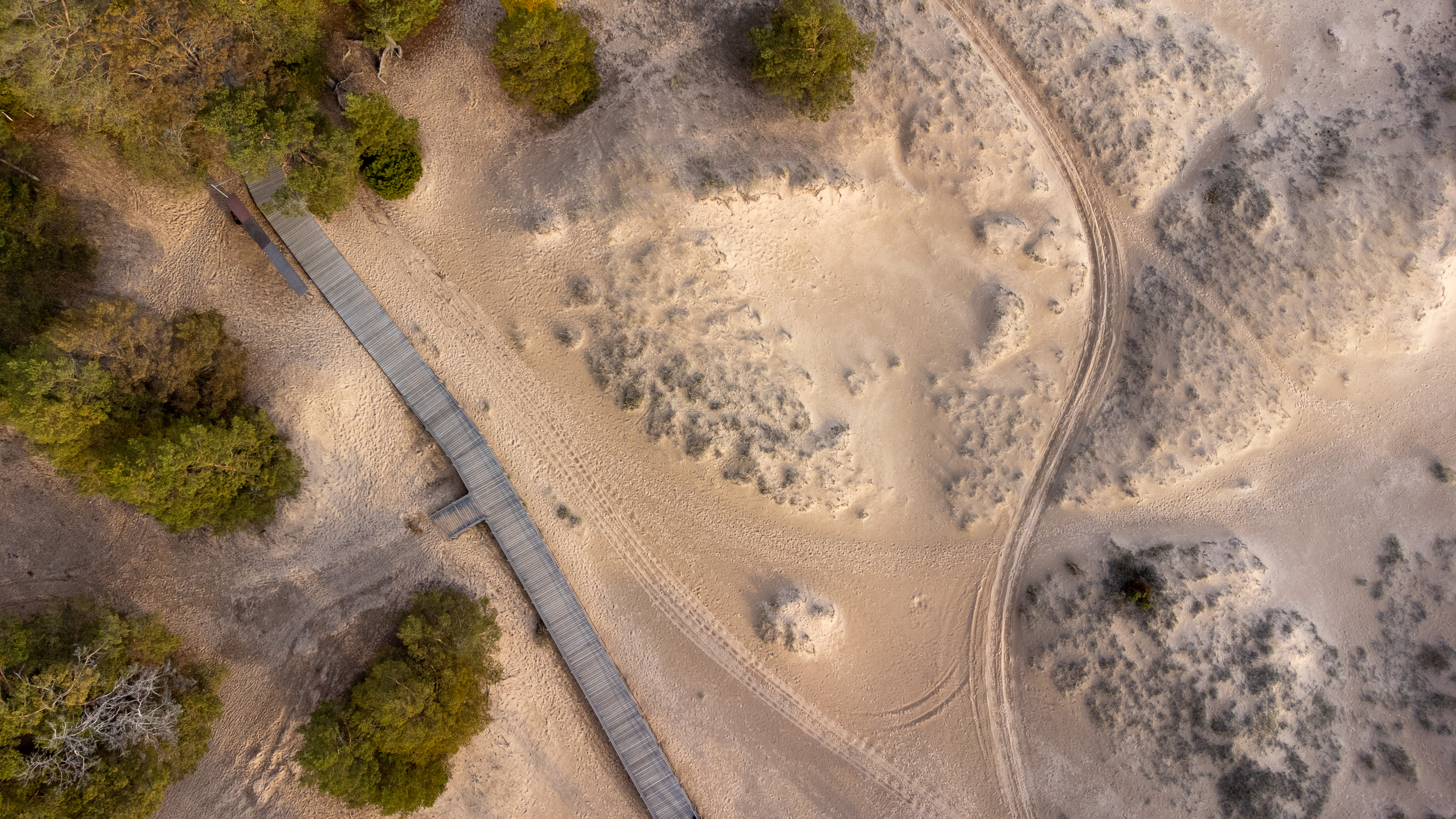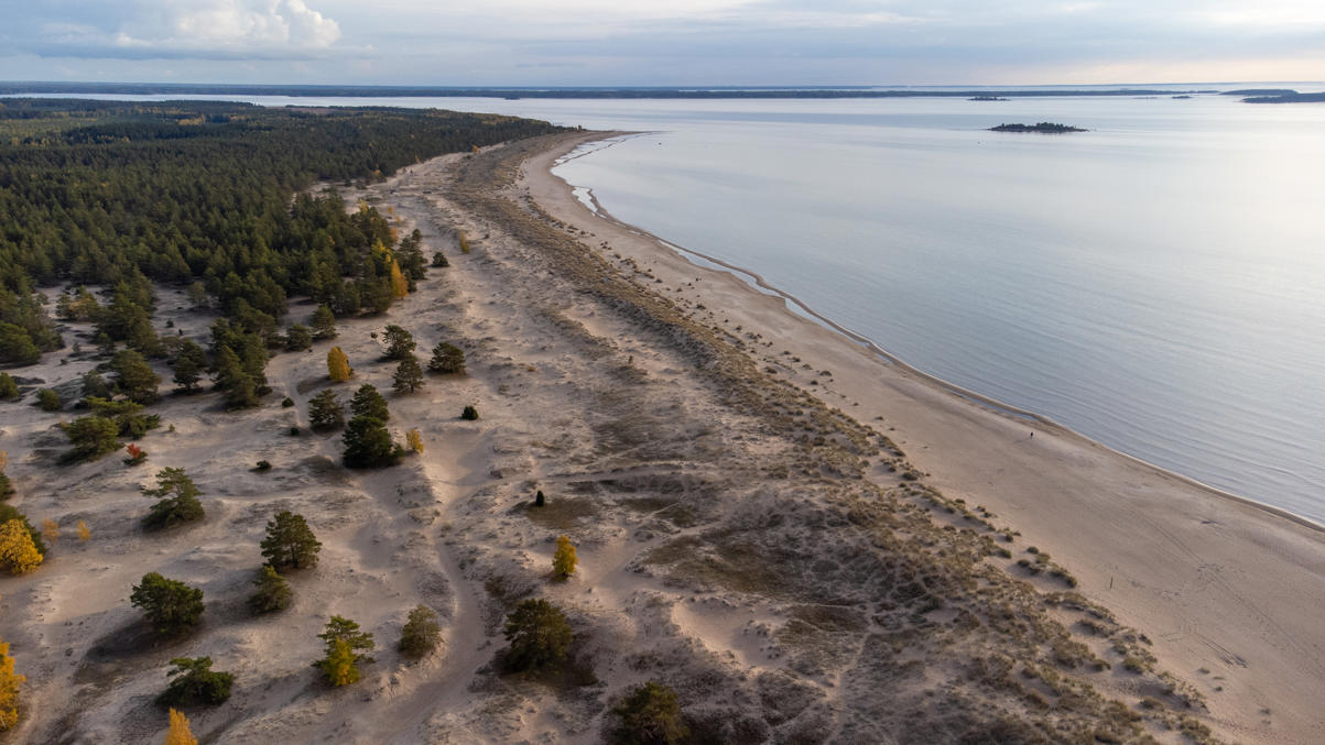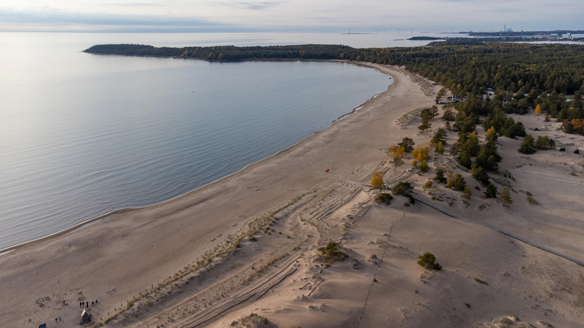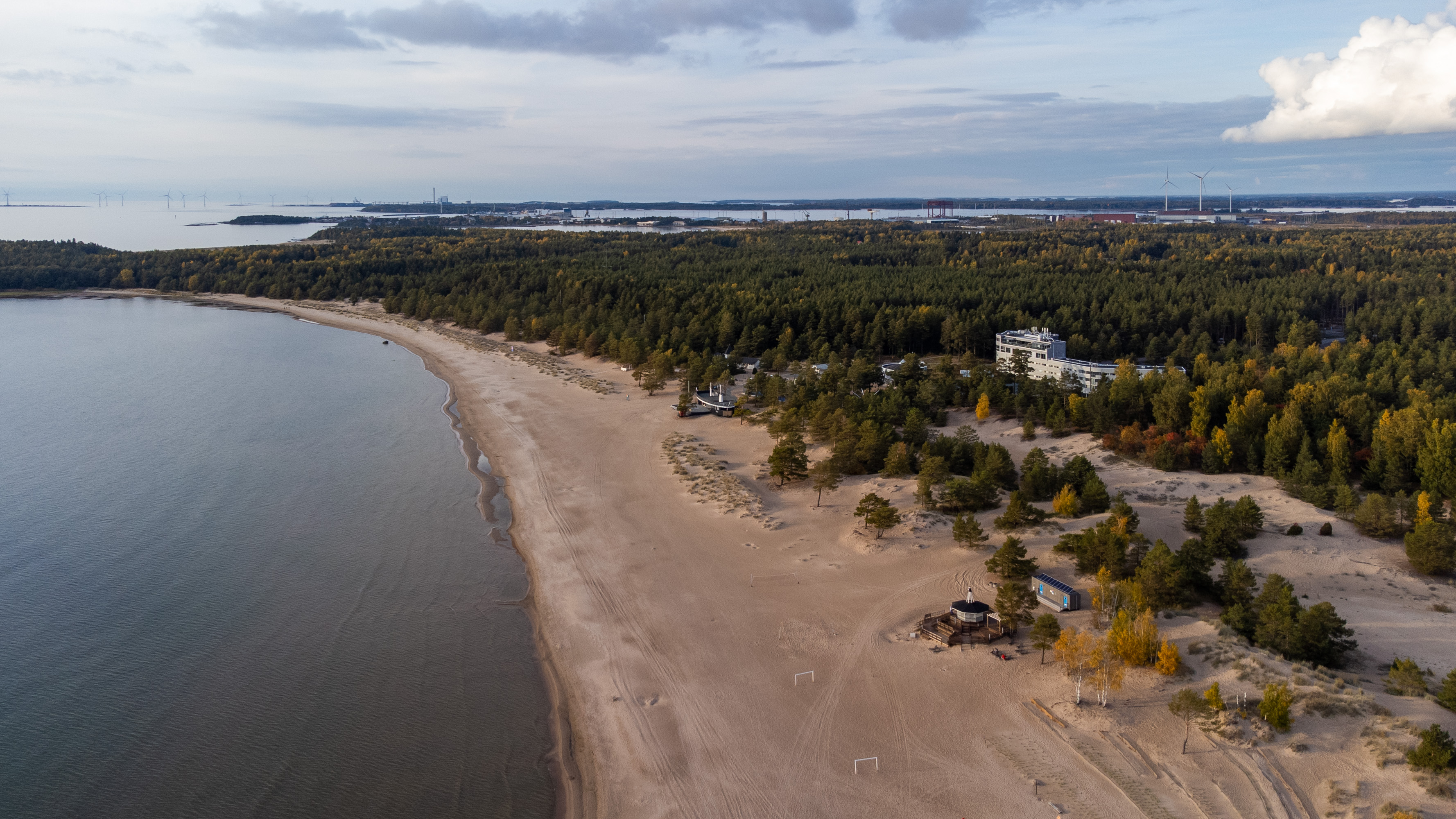 6. С воздуха хорошо видны более молодые и близкие к морю дюны, покрытые мелкой растительностью, а за ним более старая и самая мощная дюна — Императорская банка (Keisarinpankki), отделяющая пляж от парковок и кемпингов.