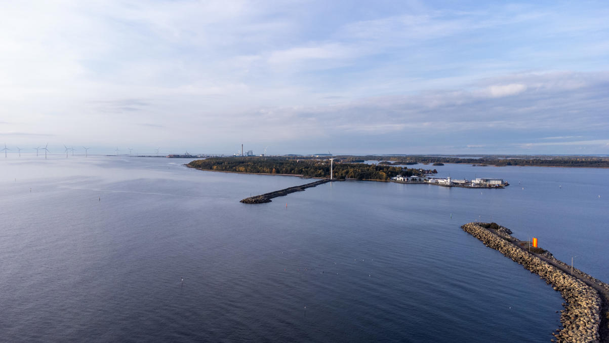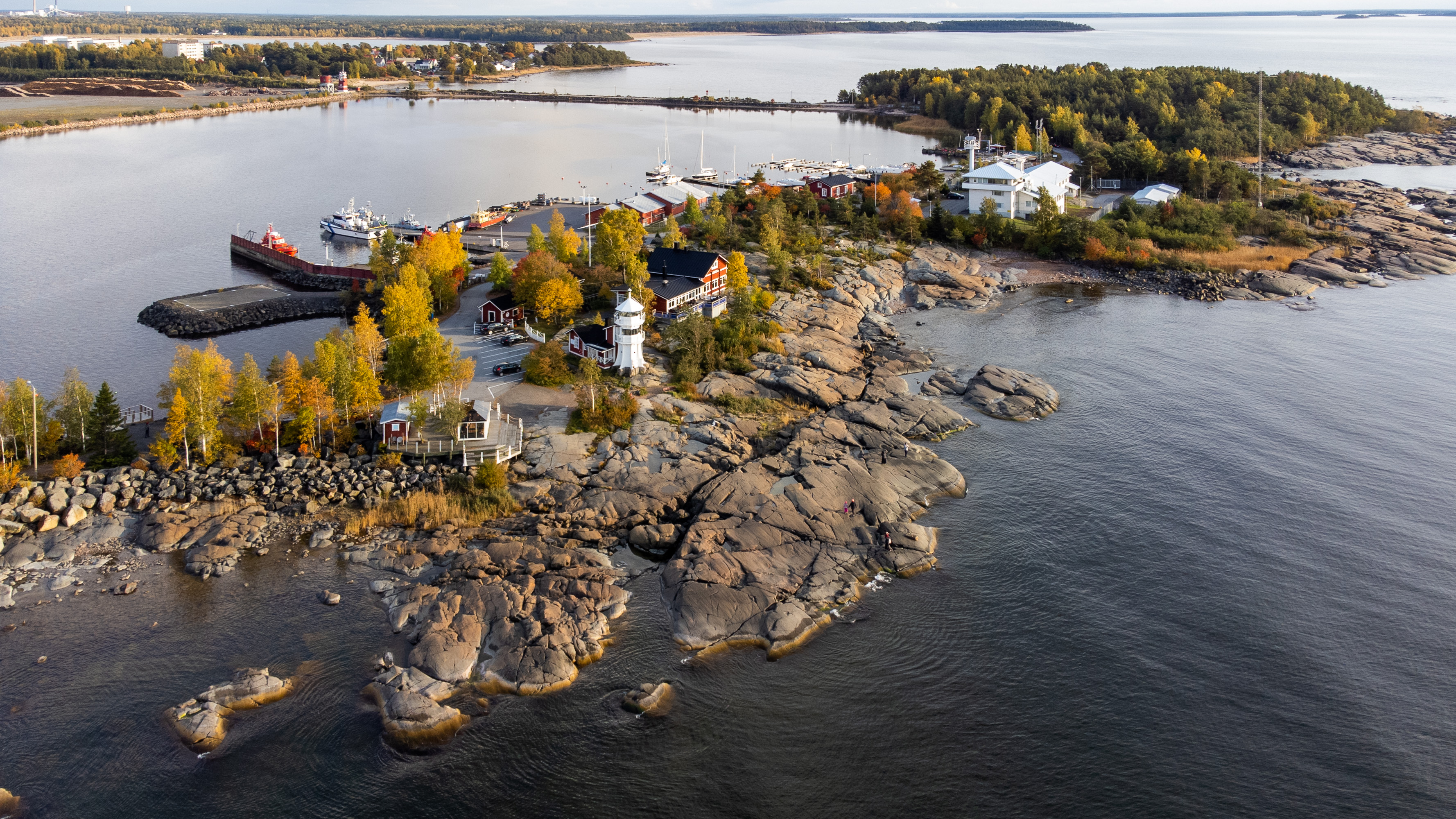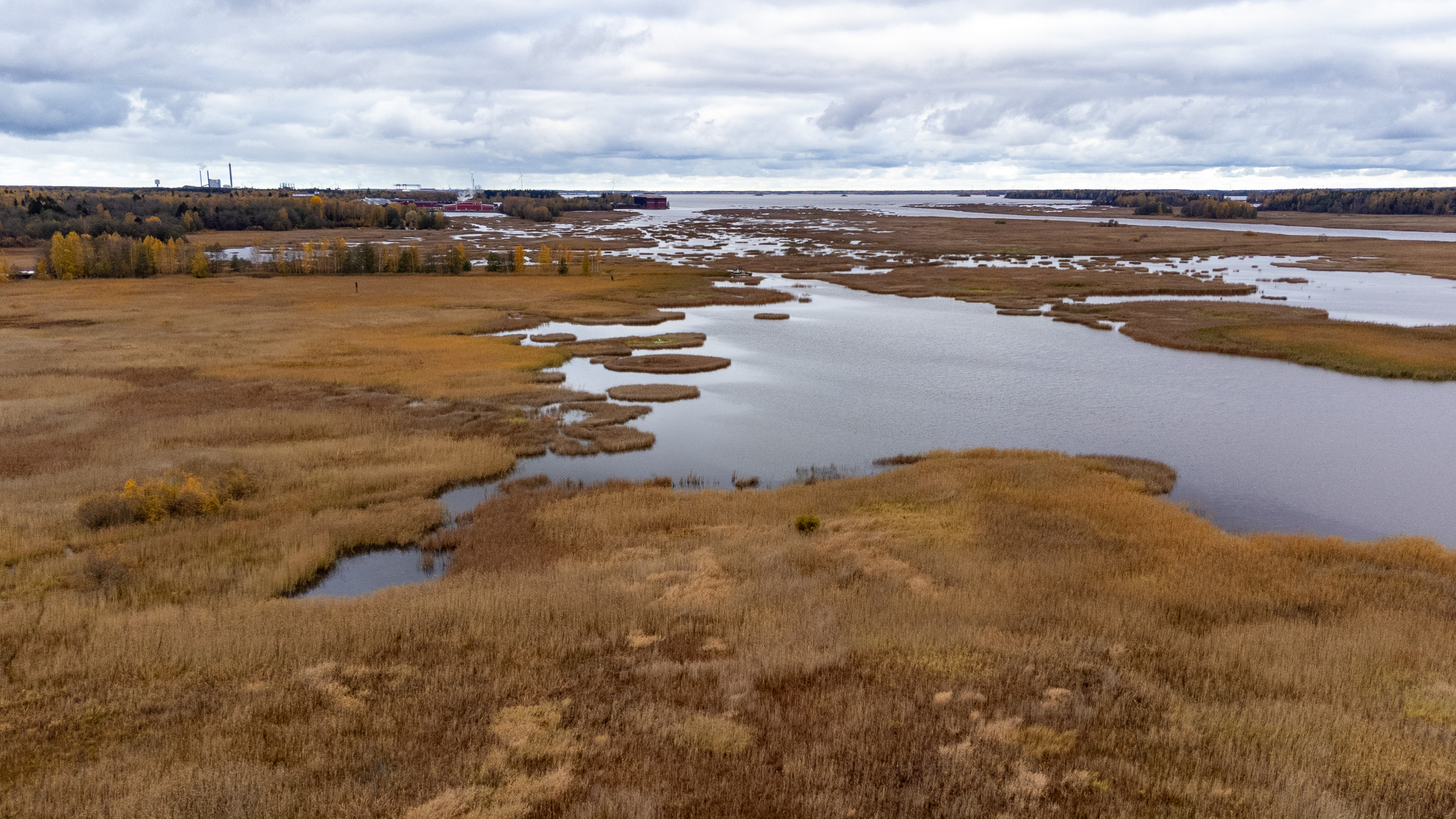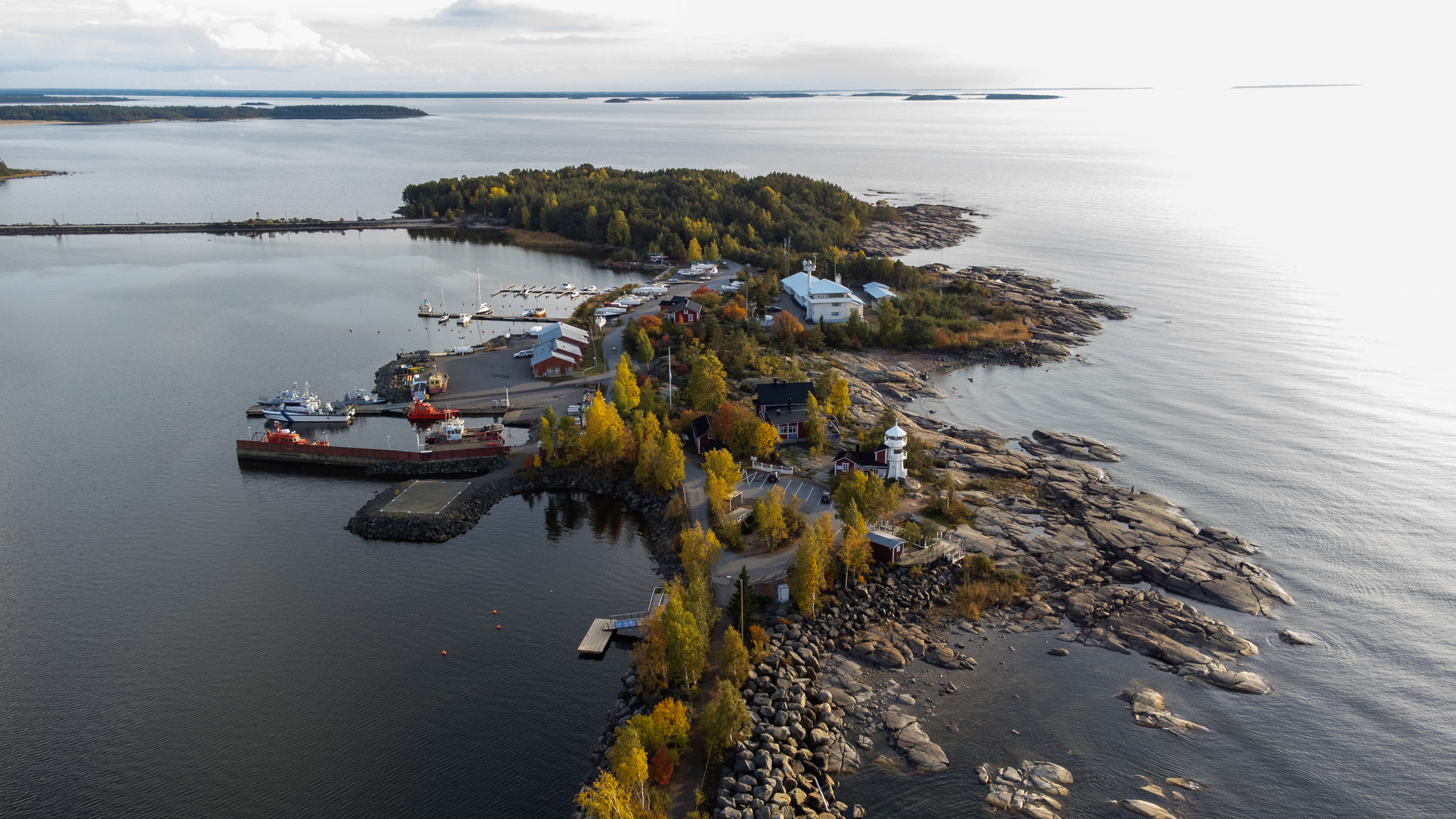 47. А в сторону моря тут виден лабиринт островков, который на карте уже не разглядишь. На заднем же плане так и видна вся местная промышленность: левее середины, красные здания — лесопилка (правее на берегу также ее огромный склад), прямо за ней вдалеке выглядывает завод диоксида титана, а чуть левее — кран верфи; а еще левее и еще дальше — дымит ТЭС Мери-Пори. Открытого же моря в эту сторону не увидеть даже с дрона.
