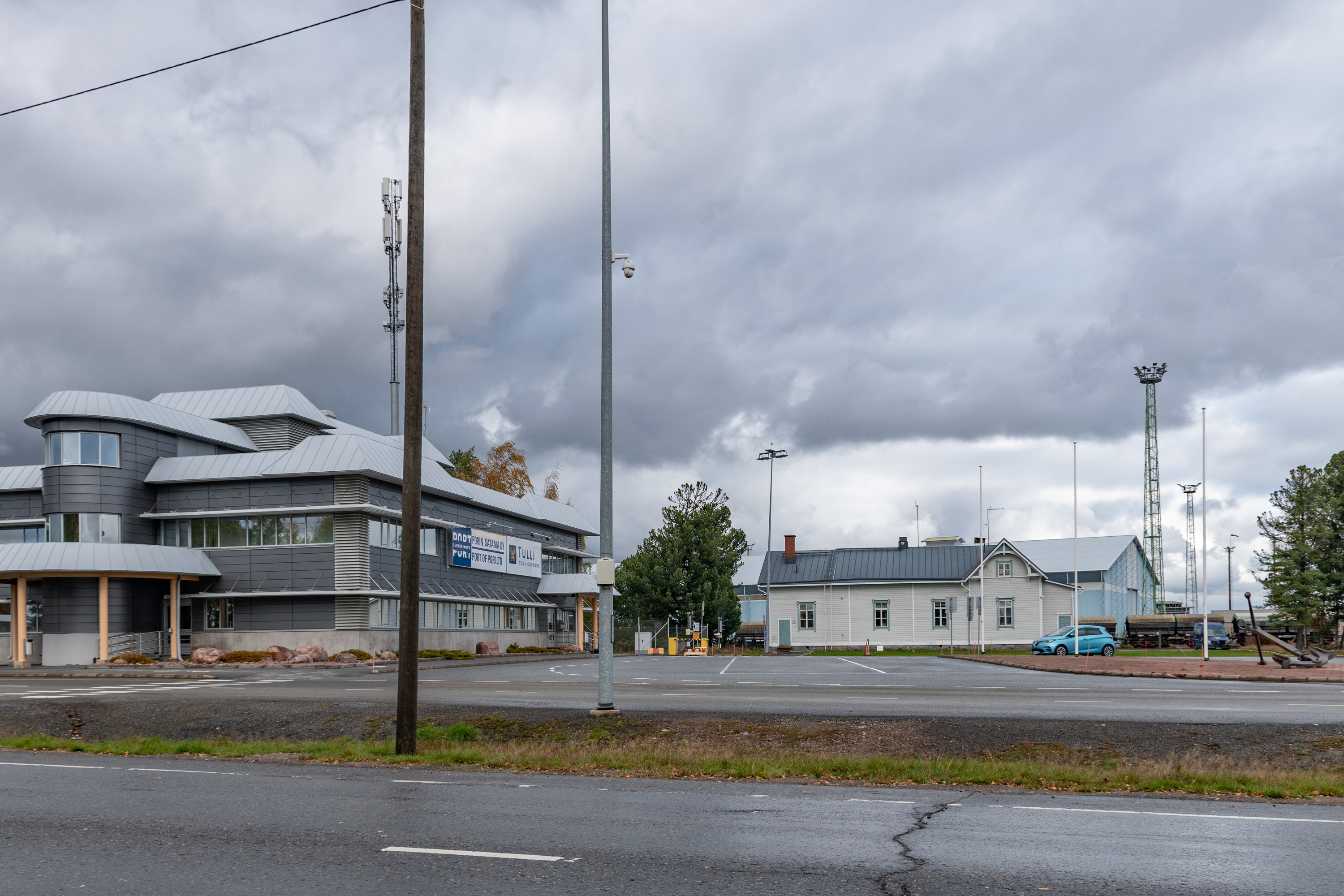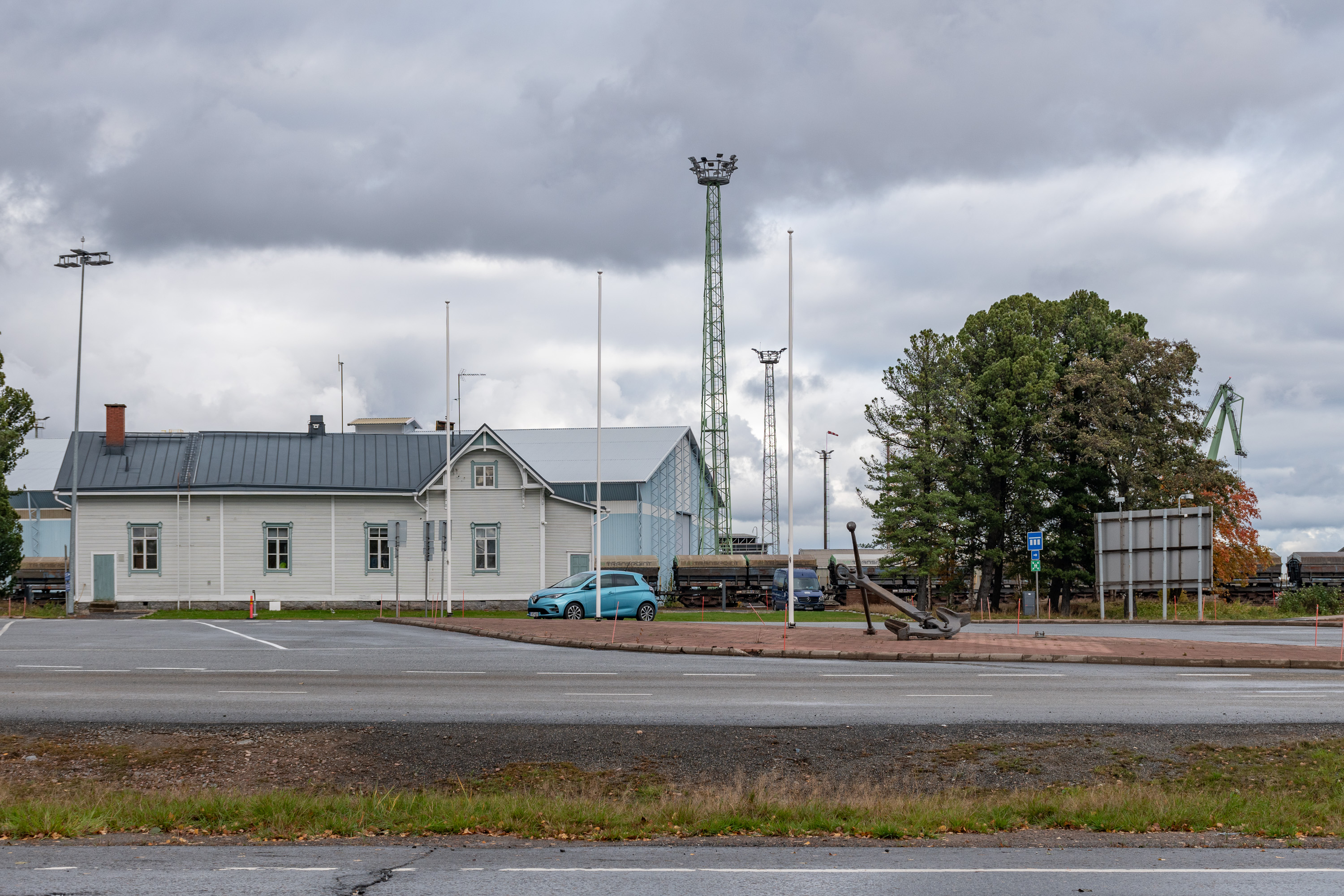 13. С суши же, помимо ворот и административного здания порта, из интересного виден еще старый деревянный вокзал станции Мянтюлуото. Пассажирское движение до Мянтюлуото существовало в 1900-1953, пытались восстановить в 1975, но не взлетело. Станция Мянтюлуото с тех пор была отнесена отсюда чуть подальше от порта, на километр в сторону Пори, и там даже построено новое (скучное кирпичное) здание в 1984, что для чисто товарных станций в те времена уже было редкостью. Железные дороги на Мянтюлуото и Тахколуото электрифицированы в последнее десятилетие, но тут уже контактной сети все равно нет, видимо, за подъездные пути считается.