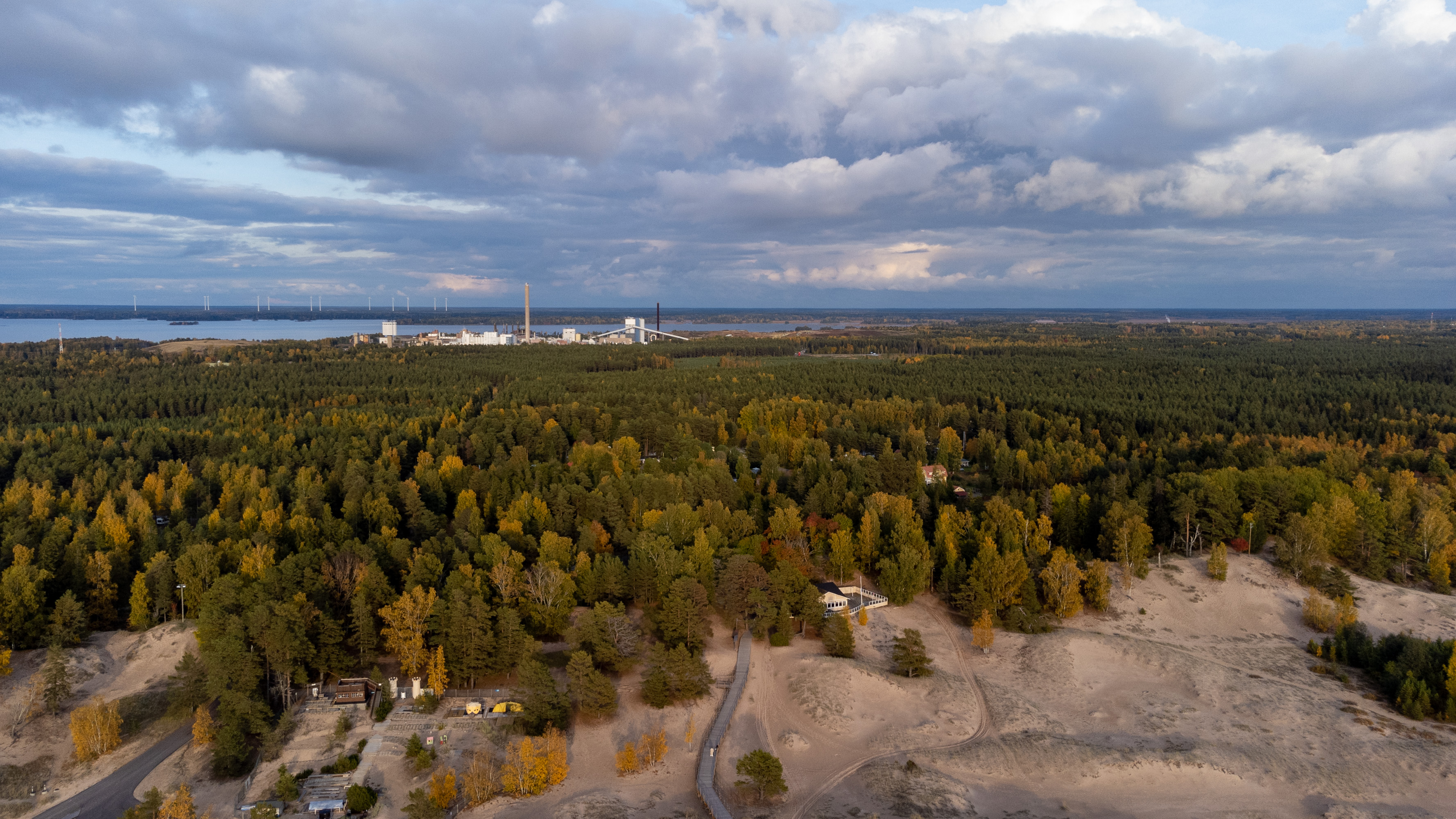 7. На еще более старых дюнах вглубь суши уже растет лес. На заднем плане по другую сторону полуострова виден бывший завод диоксида титана — материала для производства красок — основан в 1957, в американской собственности (Venator) с 2013, сильно горел в 2017, закрыт с 2022.