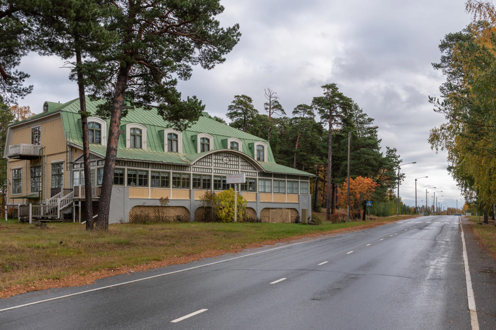 14. Национальная трасса 2 Хельсинки-Пори тоже на самом деле официально продолжается дальше за Пори и кончается где-то тут. Помимо порта, у дороги еще стоит здание отеля Мянтюлуото (Mäntyluodon hotelli) — роскошной деревянной, в югендстиле, гостиницы и ресторана, 1917 года и действует до сих пор. С другой стороны тут берег совсем рядом, из отеля видно море.