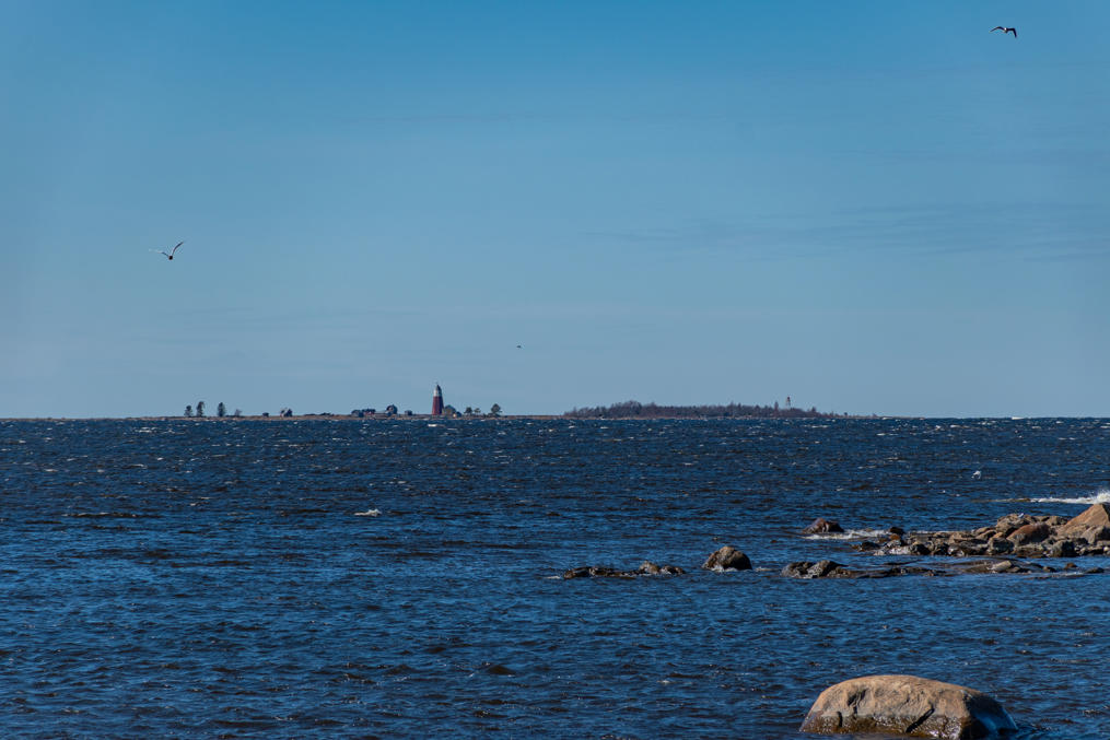 65. На горизонте хорошо виден лежащий в 4-5 км отсюда остров Соклотхеллан (Soklothällan), с большим деревянным дневным знаком 1824 года постройки, наподобие того, что я поближе снимал на Месшере под Якобстадом — Месшер лежит всего в 12 км на северо-восток от Соклотхеллана. На острове видно несколько домиков, один из которых был когда-то лоцманской станцией. Правее, на более лесистом и сросшемся с Соклотхелланом Хеллгрундете (Hällgrundet), виден также небольшой маяк.