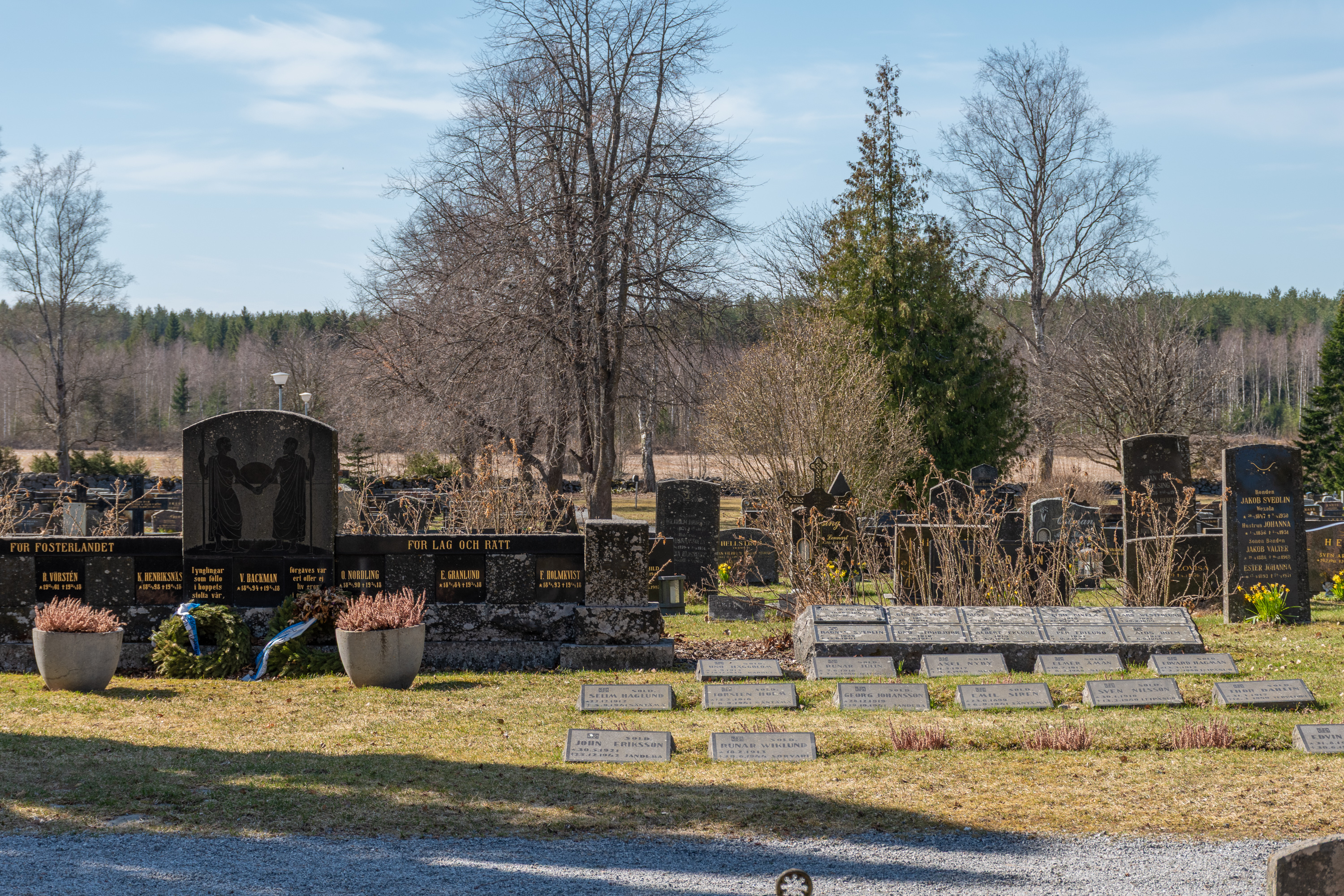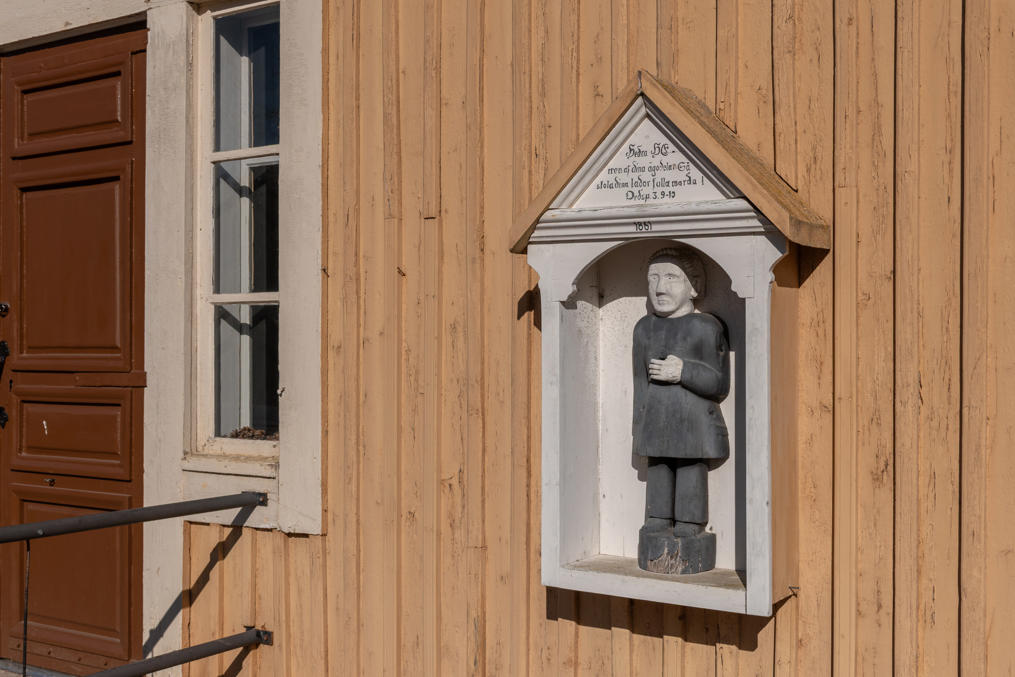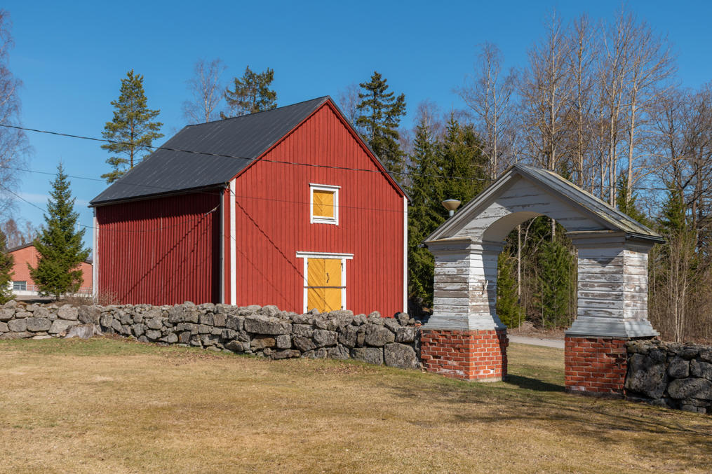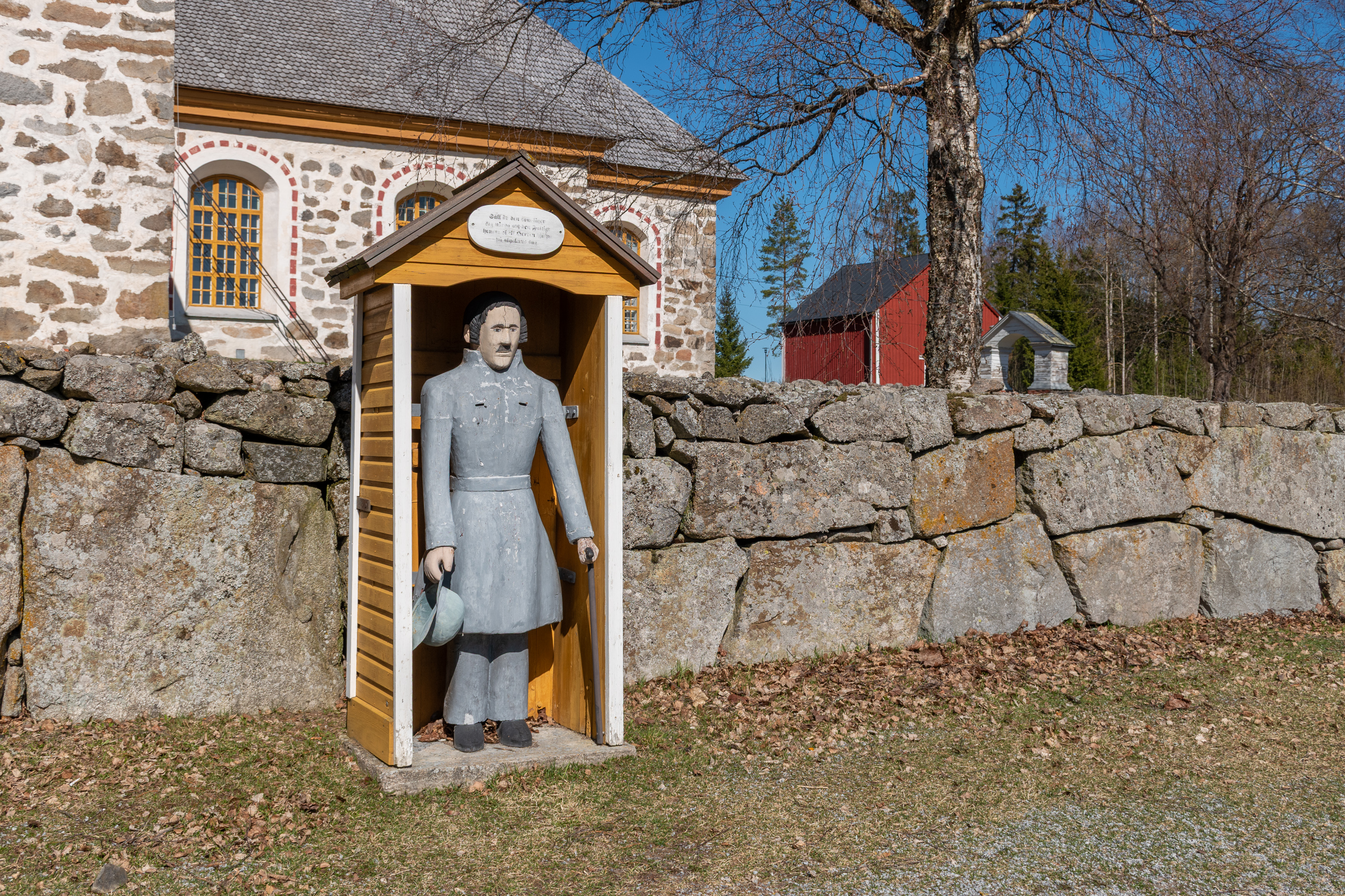 75. Обычные атрибуты сельской церкви — амбар, использовавшийся для запасов зерна на черный день, воинское кладбище и традиционная для Остроботнии статуя солдата-инвалида для сбора пожертвований (vaivaisukko).