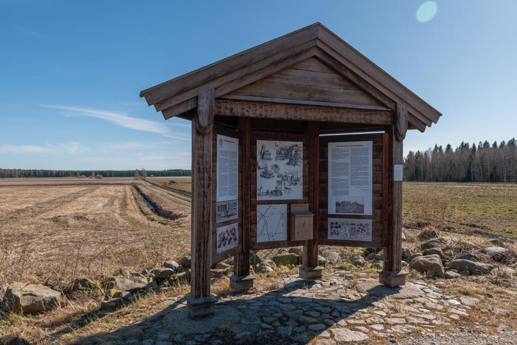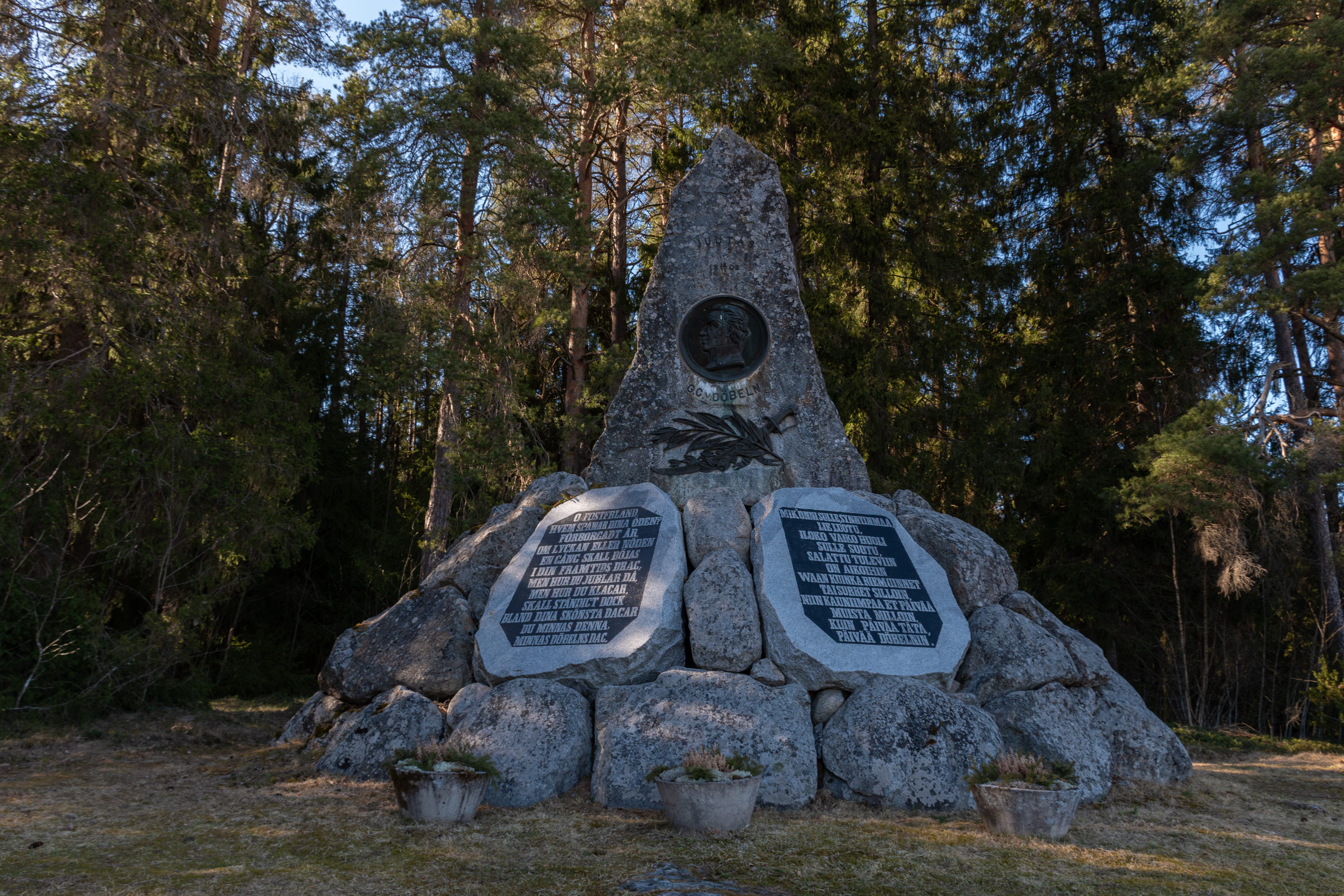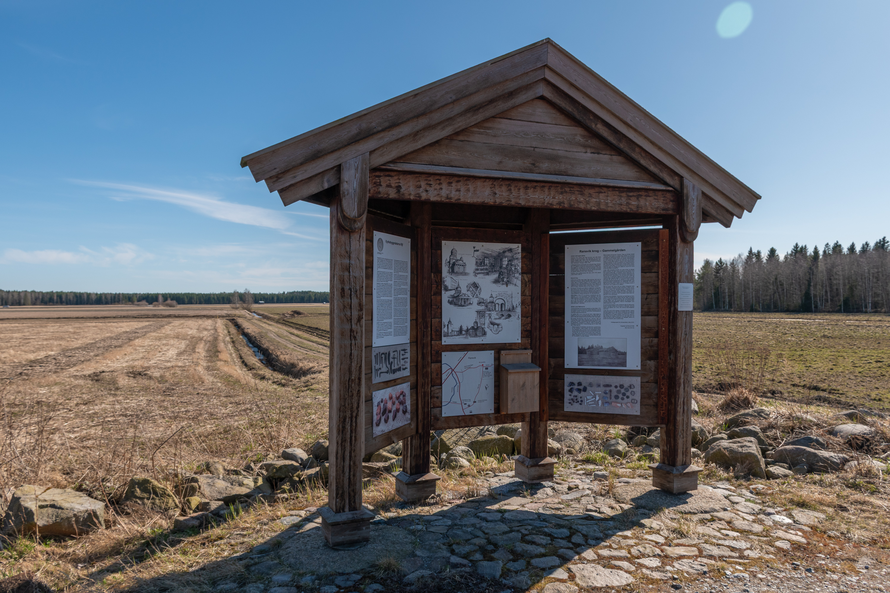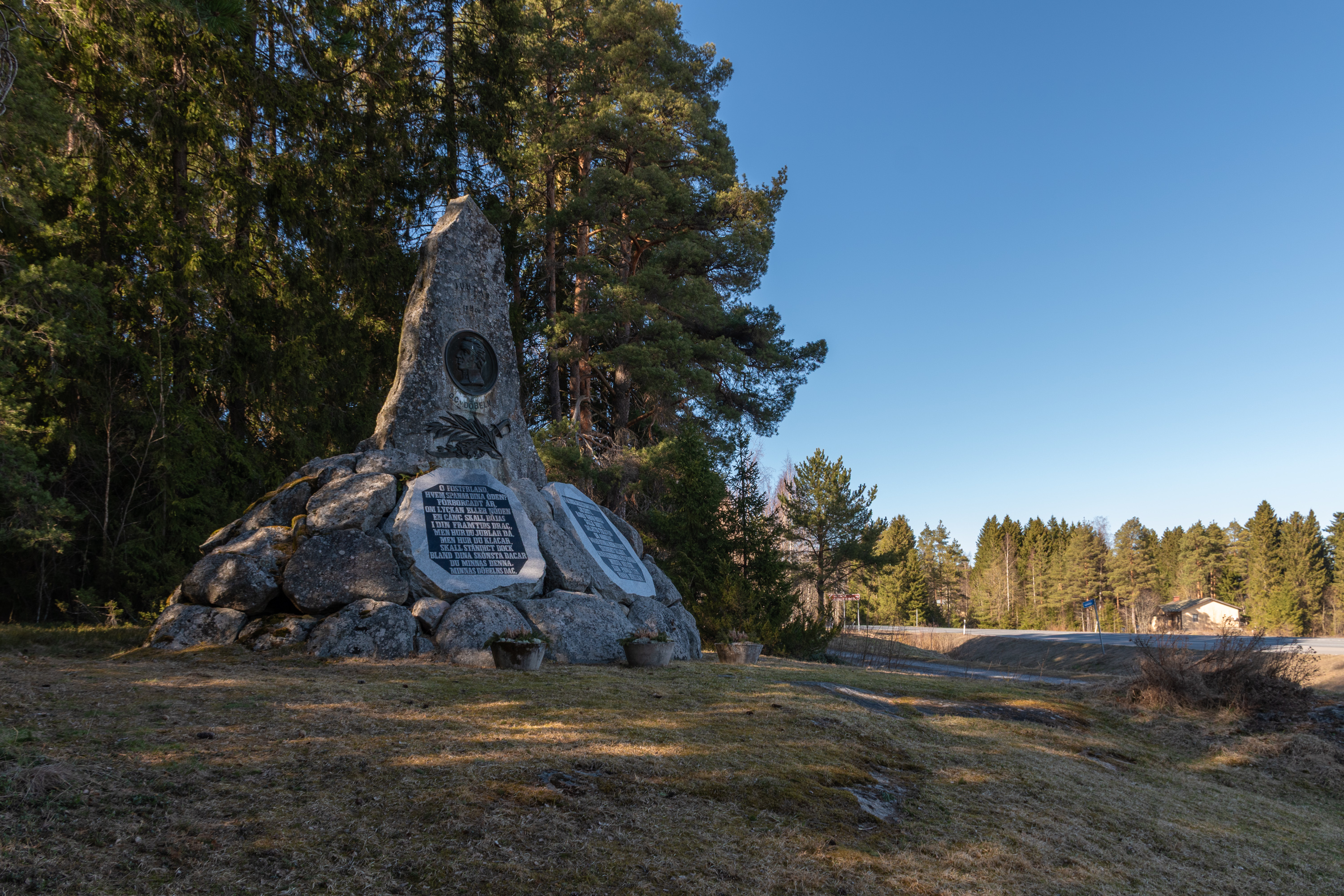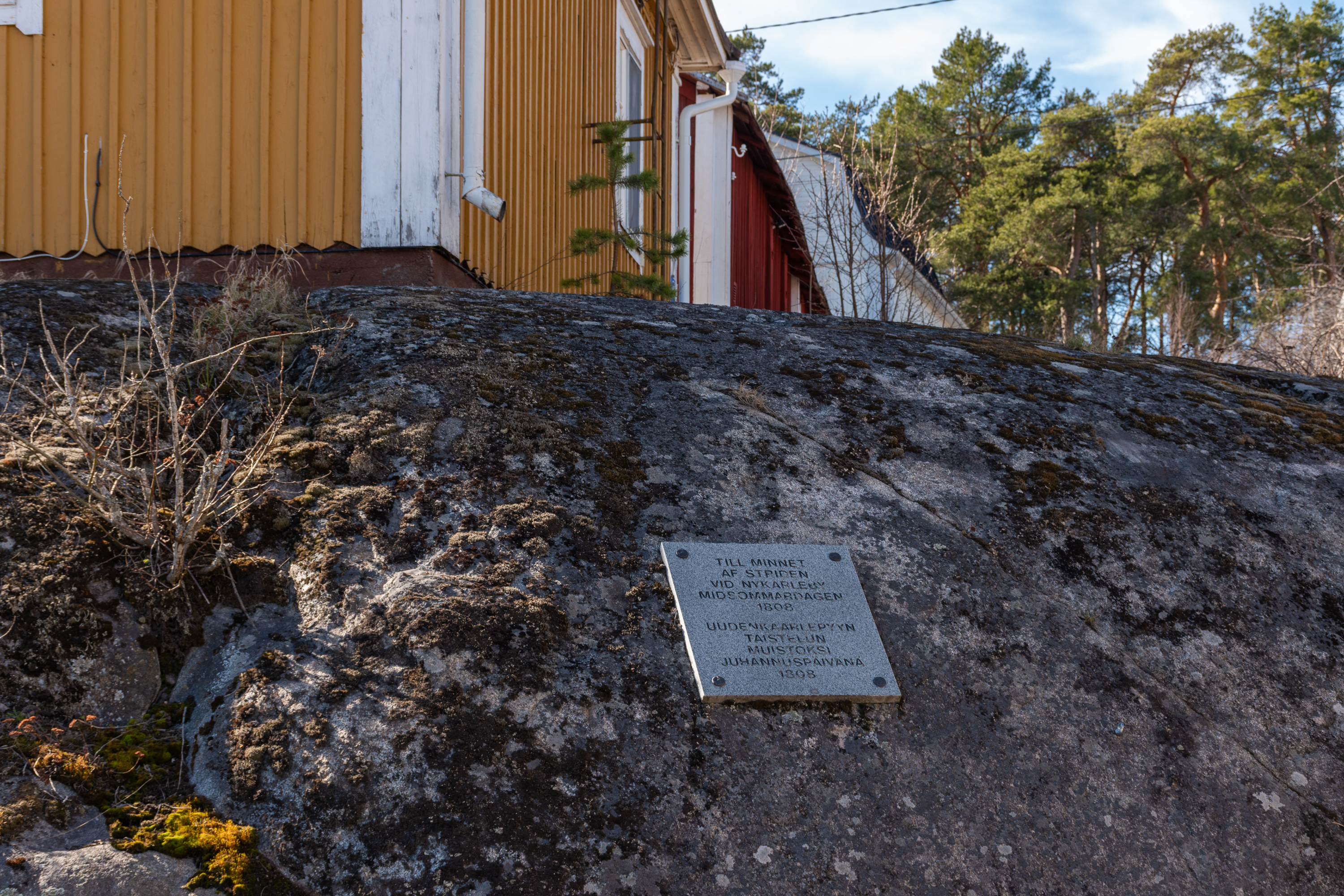 50. На скалу у избушки прикреплена памятная доска о Нюкарлебюсском сражении Финляндской войны 24.6.1808. Это мелкая битва, о которой почти ничего даже не нагуглить, гораздо менее известная, чем случившаяся спустя несколько месяцев битва при Ютасе, до которой скоро дойдем.