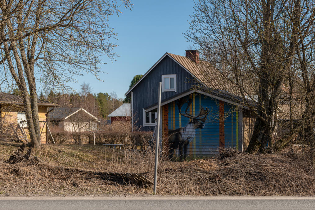 56. Какой-то, видимо, любитель Лапландии, себе на выходящем к дороге сарае нарисовал роскошного северного оленя.