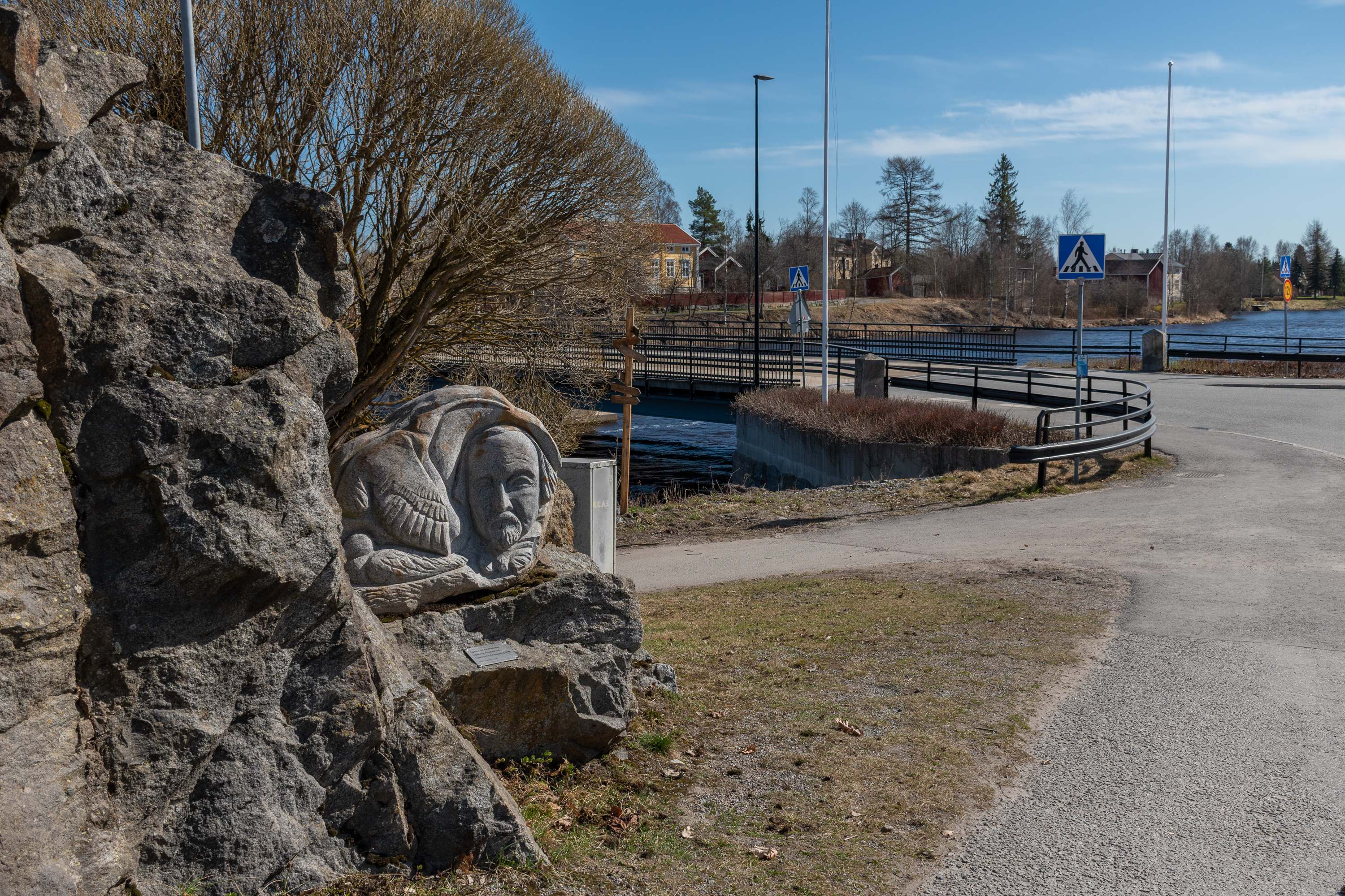 48. У Церковного моста — небольшая скульптура "Топелиус и перелетные птицы". Не знаю точно, почему именно перелетные птицы, но Топелиус и учебник по естествознанию писал в свое время (Naturens bok), где перелетных и других птиц упоминал. Скульптура 2018 года, авторства живущего в Нюкарлебю украинского художника и скульптора Андрея Коцяка (Andrii Kotsiak).
