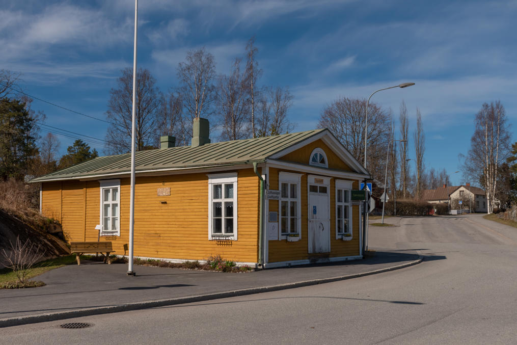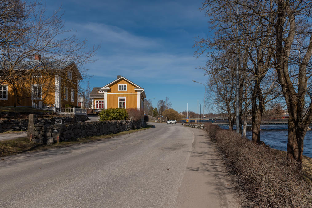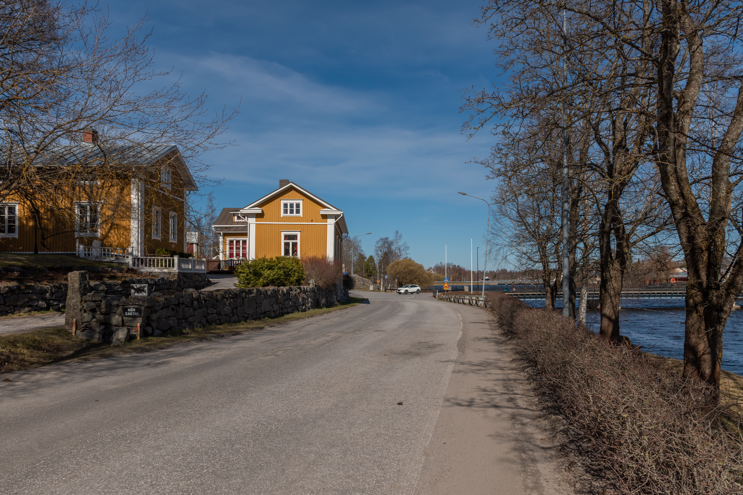 49. А прямо в торце моста стоит маленький желтый домик, Мостовая избушка (Brostugan), построенный в 1817 одновременно с первым капитальным мостом дом стражника, бравшего плату за проход по мосту с тех, кто не жил в городе. Позже в ней был зал ожидания парохода, ходившего когда-то до центра города, до строительства ГЭС. Ну а когда и парохода не стало, здесь, еще с 1930-х и до сих пор, разместилось самое, наверное, известное кафе Нюкарлебю.