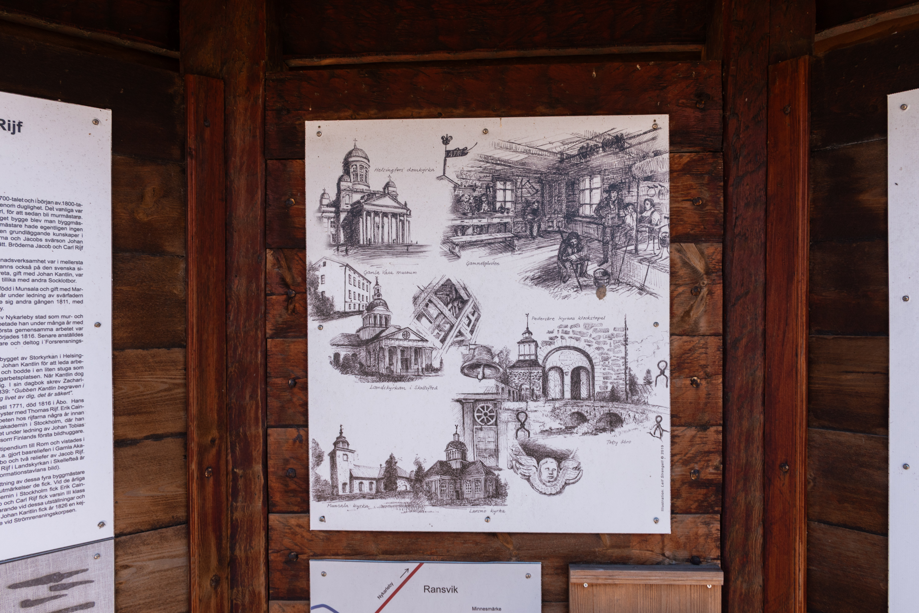 76. Церковь была одной из остроботнийских (и вестроботнийских) церквей, к строительству которой приложил руку мастер Якоб Рийф (Jacob Rijf, 1753-1808). Он был из известного рода церковных мастеров, родился в деревне Лепплакс под Якобстадом и имел дом в Соклоте под Нюкарлебю — я случайно наткнулся на посвященный ему информационный щит почти что посреди полей. Рийф стал первым финном, выучившимся на архитектора в Стокгольмской академии искусств, и сделал хорошую карьеру; из тех его церквей, которые мне довелось в этом блоге уже показать — церкви Алаторнио и Вимпели. Последней его работой стала реконструкция Кунгсхольмской церкви в Стокгольме.