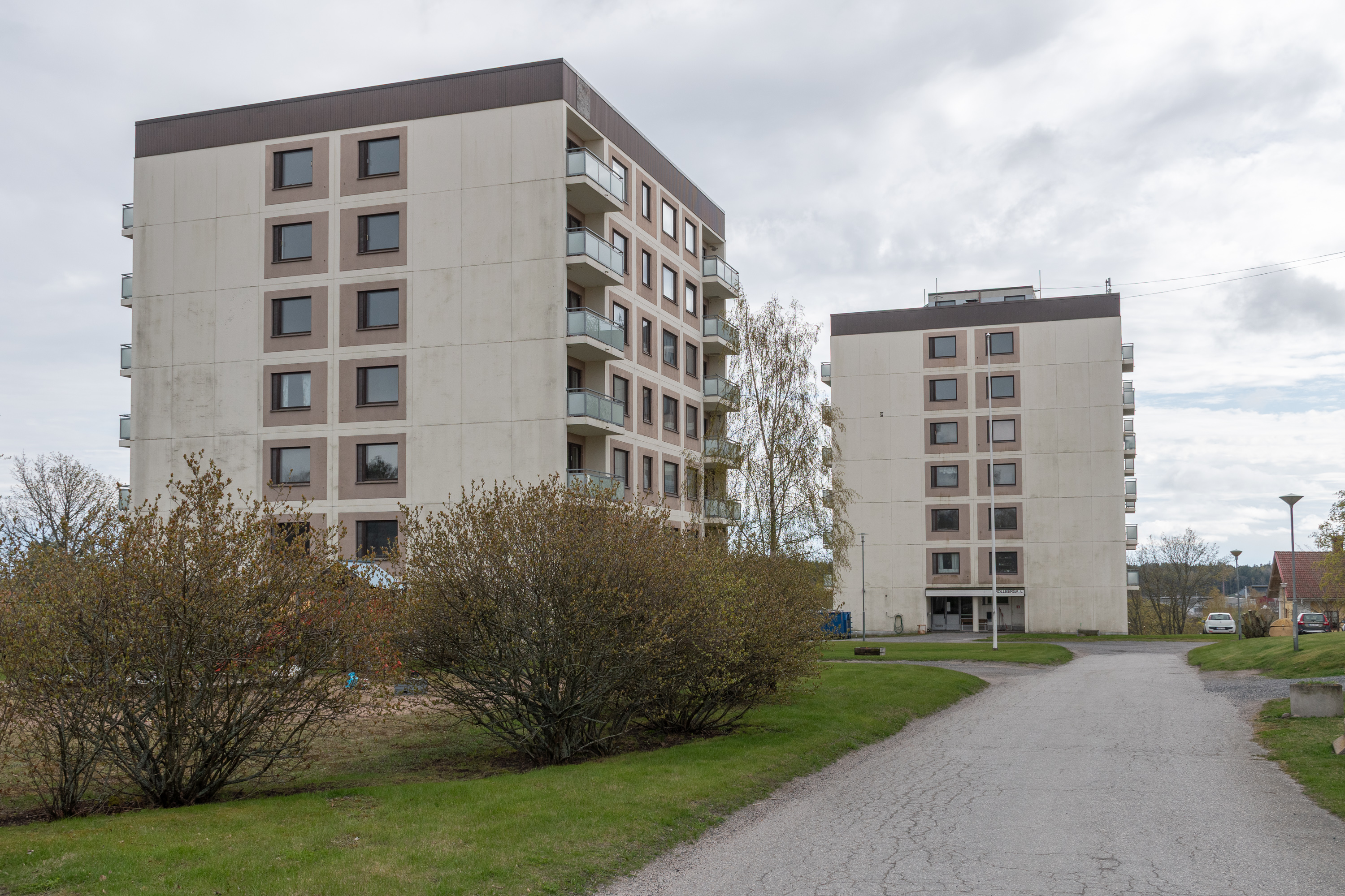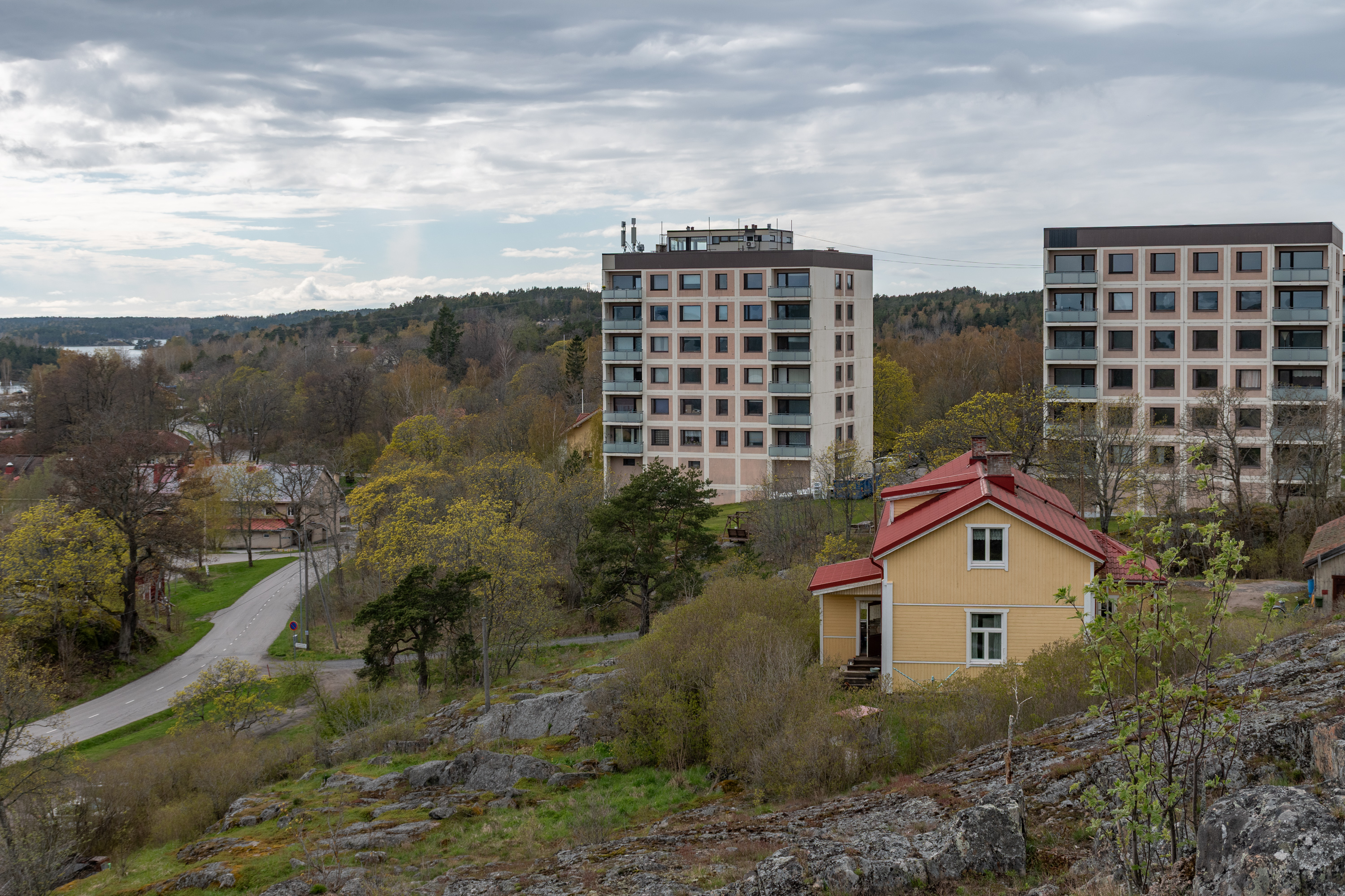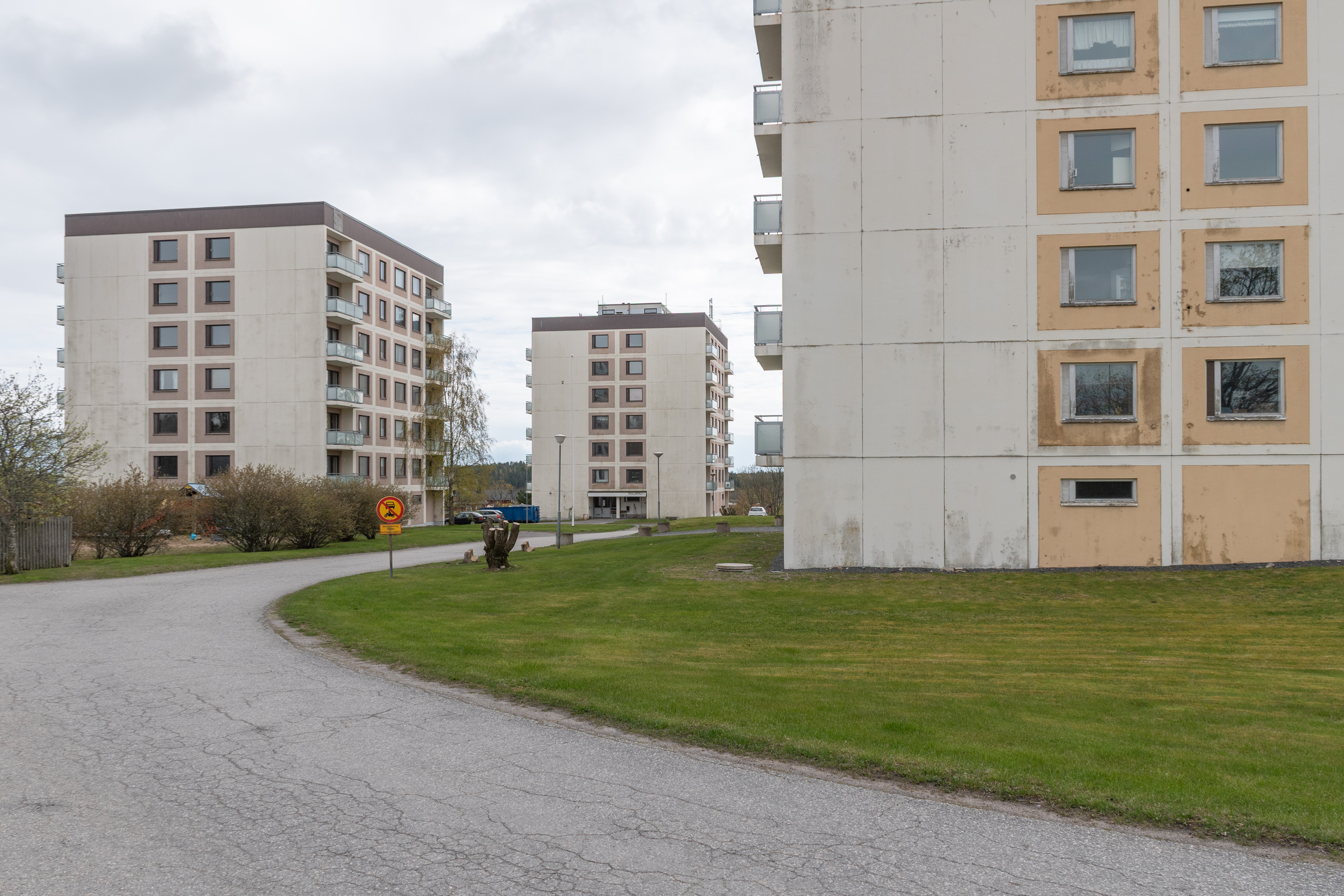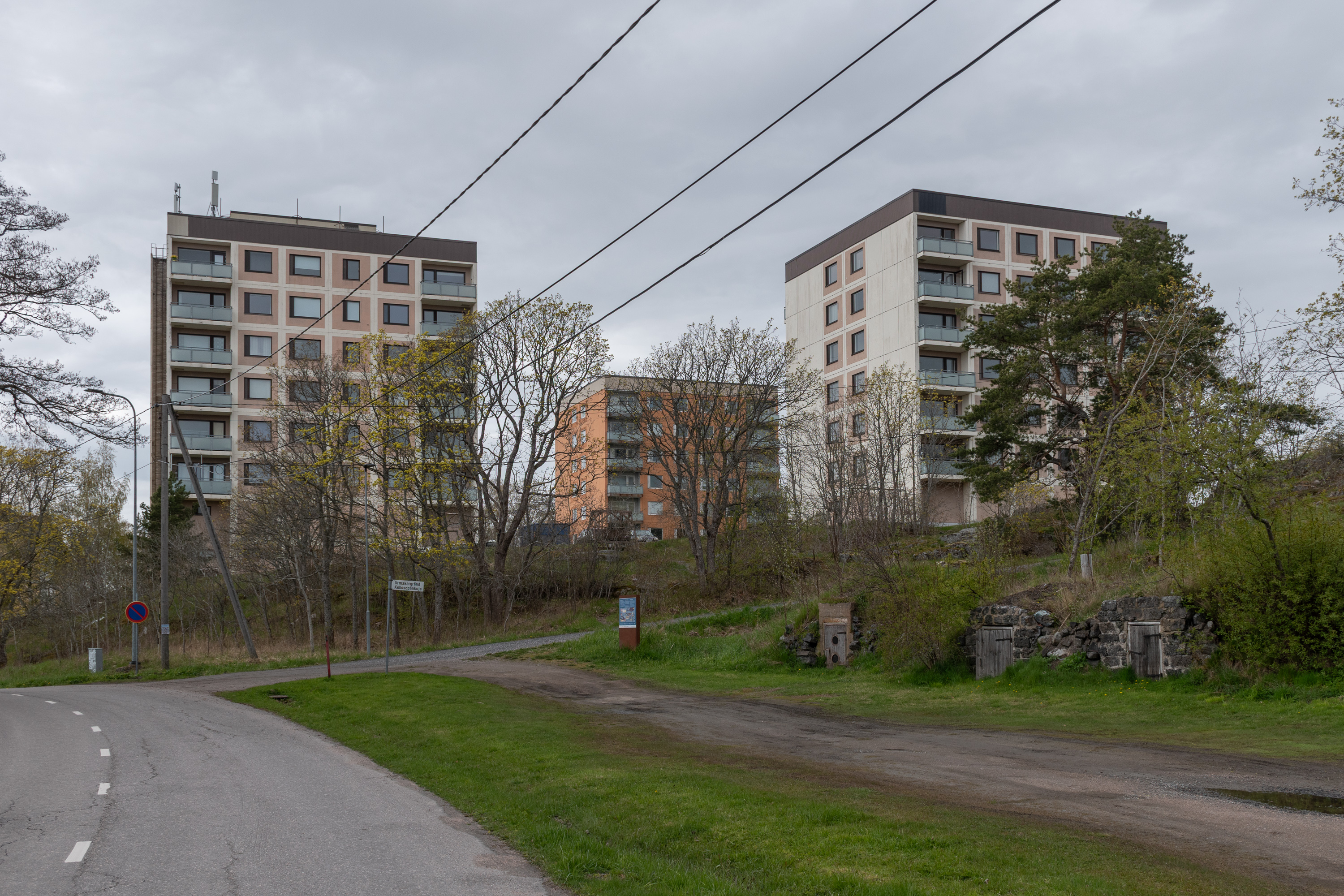 45. Подобные многоэтажки всегда создают удручающее впечатление — на момент постройки это было современное жилье, где активно селились рабочие, был большой шаг вперед по сравнению с тесными бараками; а сейчас если кто и захочет поселиться в таком поселке, то уж в отдельном доме, а если не в отдельном, то в историческом здании хоть. Квартиры в таких панельках продают за бесценок (20-30 тыс. евро), и дома стоят полупустые — много квартир без занавесок голыми окнами смотрят. И будущее их печально — такие жилтоварищества (taloyhtiö) могут просто обанкротиться, когда жильцов станет слишком мало, чтобы оплатить очередной крупный плановый ремонт, да им и банк может запросто не дать на ремонт кредит (стандартно такие ремонты делаются так, что жилтоварищество берет на свое имя кредит, и все его дольщики-жильцы потом в течение нескольких лет выплачивают, платя чувствительную прибавку к квартплате; но банки, в общем случае, не обязаны давать такие кредиты). Пока что такие банкротства очень редки, но предрекают, что в ближайшие десятилетия могут стать намного более обычным явлением. А банкротство жилтоварищества означает, что все потеряют свое жилье. Тут вот тоже видно, что фасады уже сильно пошарпанные стали...