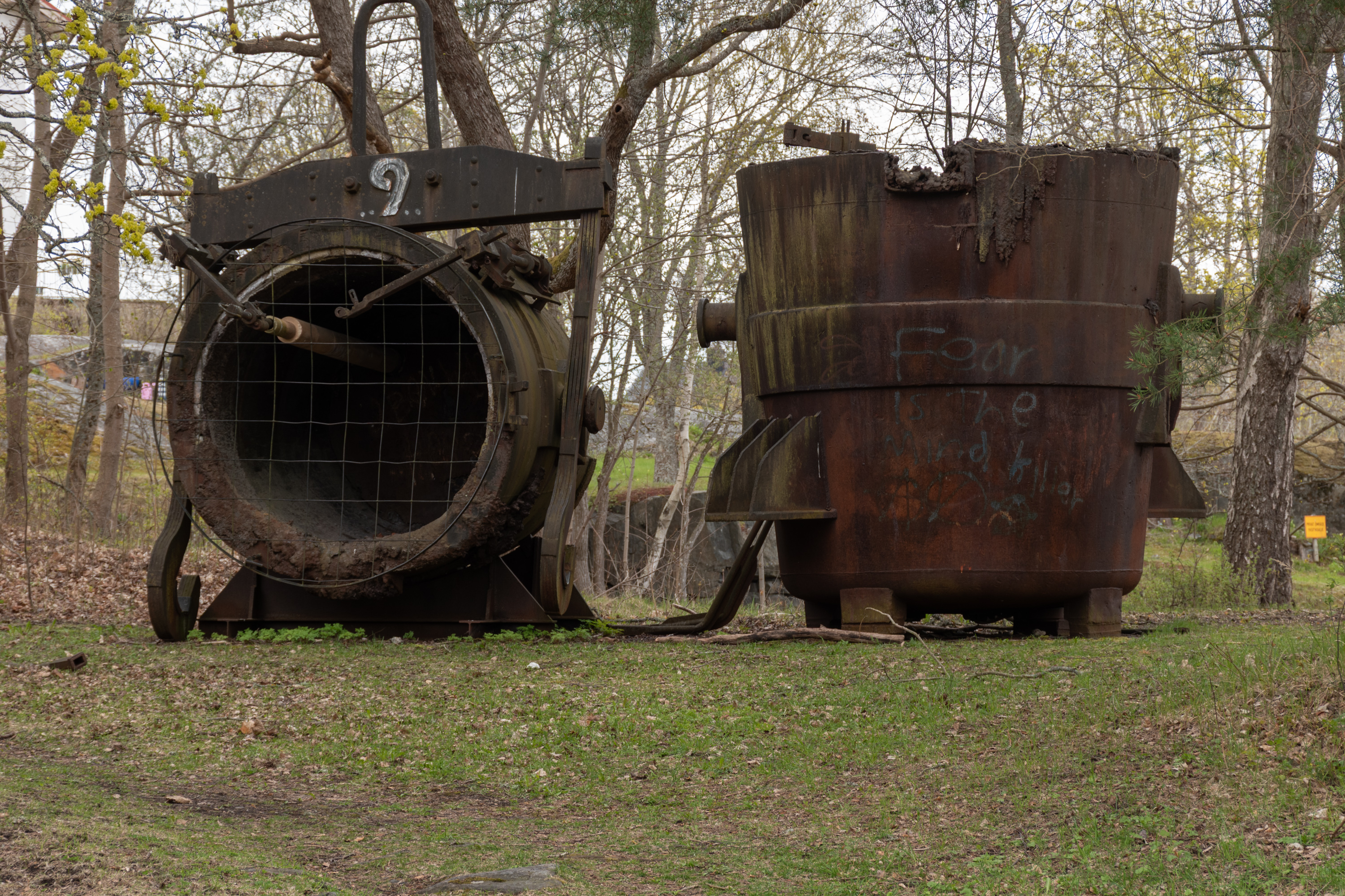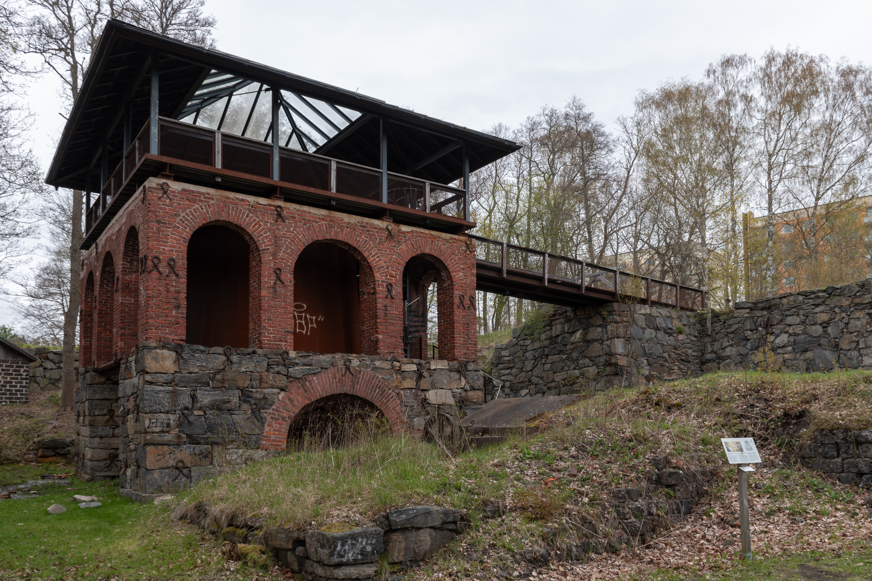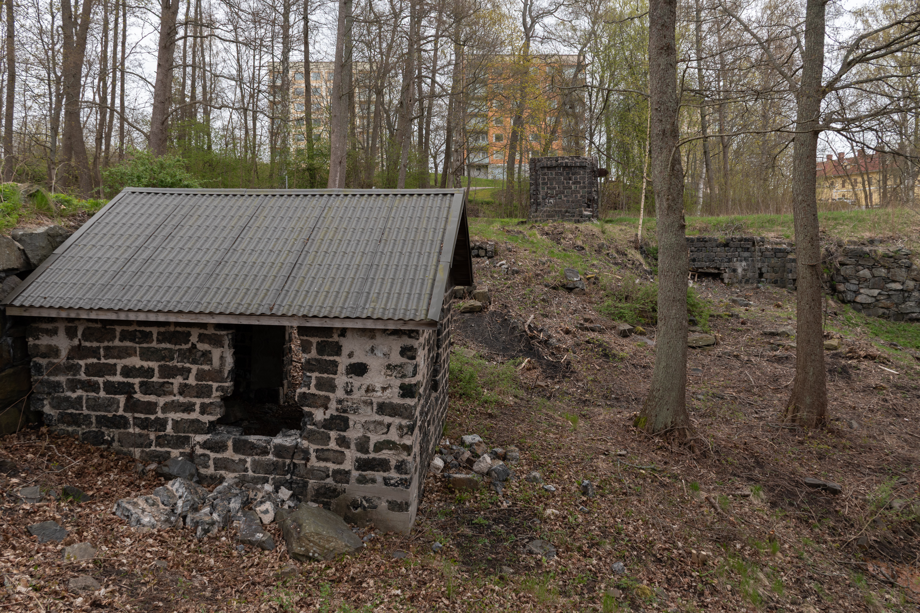 2. Печи, конечно, все равно руинированы и в наше время прикрыты крышей от осадков, а их внутреннее устройство отсюда понять особо не получается. Печи построены в 1830-х для изготовления древесного угля — топлива для завода — в более промышленных объемах; традиционно уголь выжигали в угольных ямах (miilu), не требовавших никаких капитальных построек, по технологии, очень похожей на добычу дегтя.