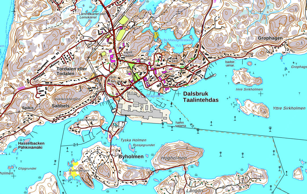 Ну а на самом Кимито самое интересное место — это, безусловно, Дальсбрук (Dalsbruk), по-фински Таалинтехдас (Taalintehdas) на юго-западном побережье, обращенный к морю; население около 1.1 тыс. Название означает "Долинный завод"; это, по-моему, единственный населенный пункт Финляндии со словом "завод" (будь то в старой форме ruukki/bruk или современной tehdas) как часть названия, что у меня в очередной раз вызывает ассоциации с родным Средним Уралом, с его названиями ж/д станций в духе "Уткинский завод" и "Михайловский завод". И завод тут действительно был, и просуществовал весьма долго: с 1686 по 2012 годы.
