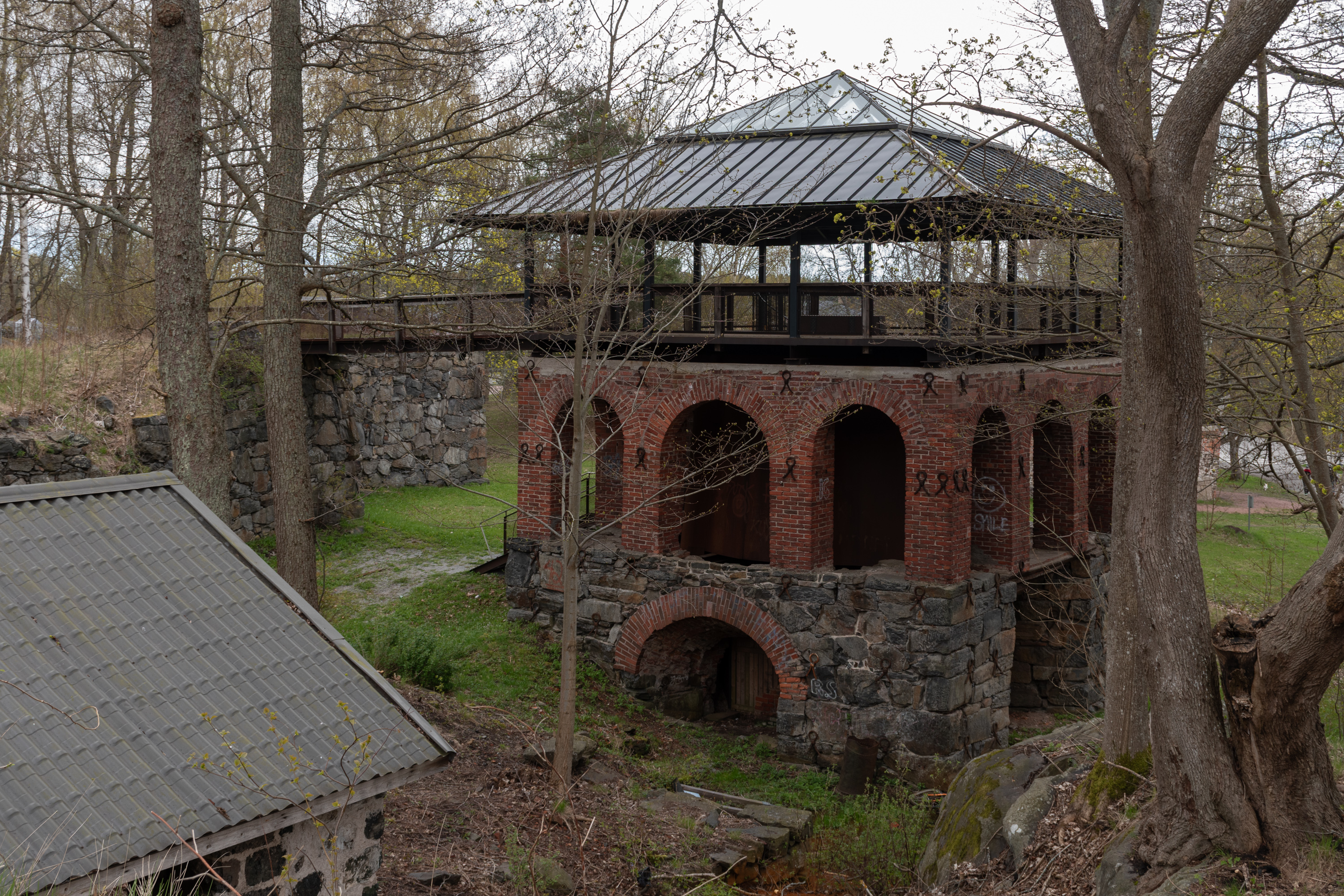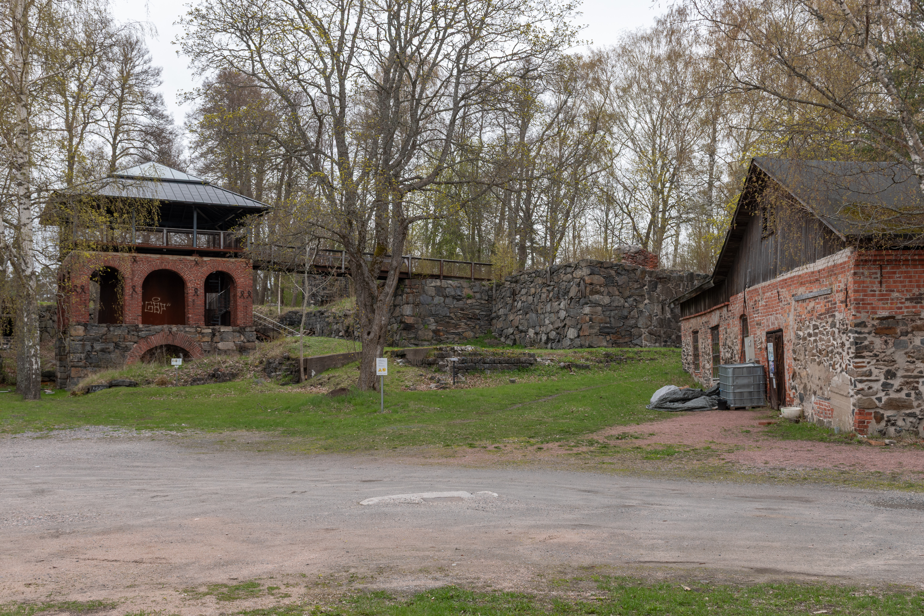 33. А дальше зато как раз идет историческая часть завода. В плане сохранности ансамбля собственно старого железоделательного завода Дальсбрук не очень поражает воображение — кроме домны, сохранилась лишь пара зданий, да и выглядит все как-то довольно неухоженно. Впрочем, целиком в любом случае такие заводы не сохранились нигде; и, к сожалению, финские заводы сохранились в среднем похуже шведских, таких, как Галтстрём, например.
