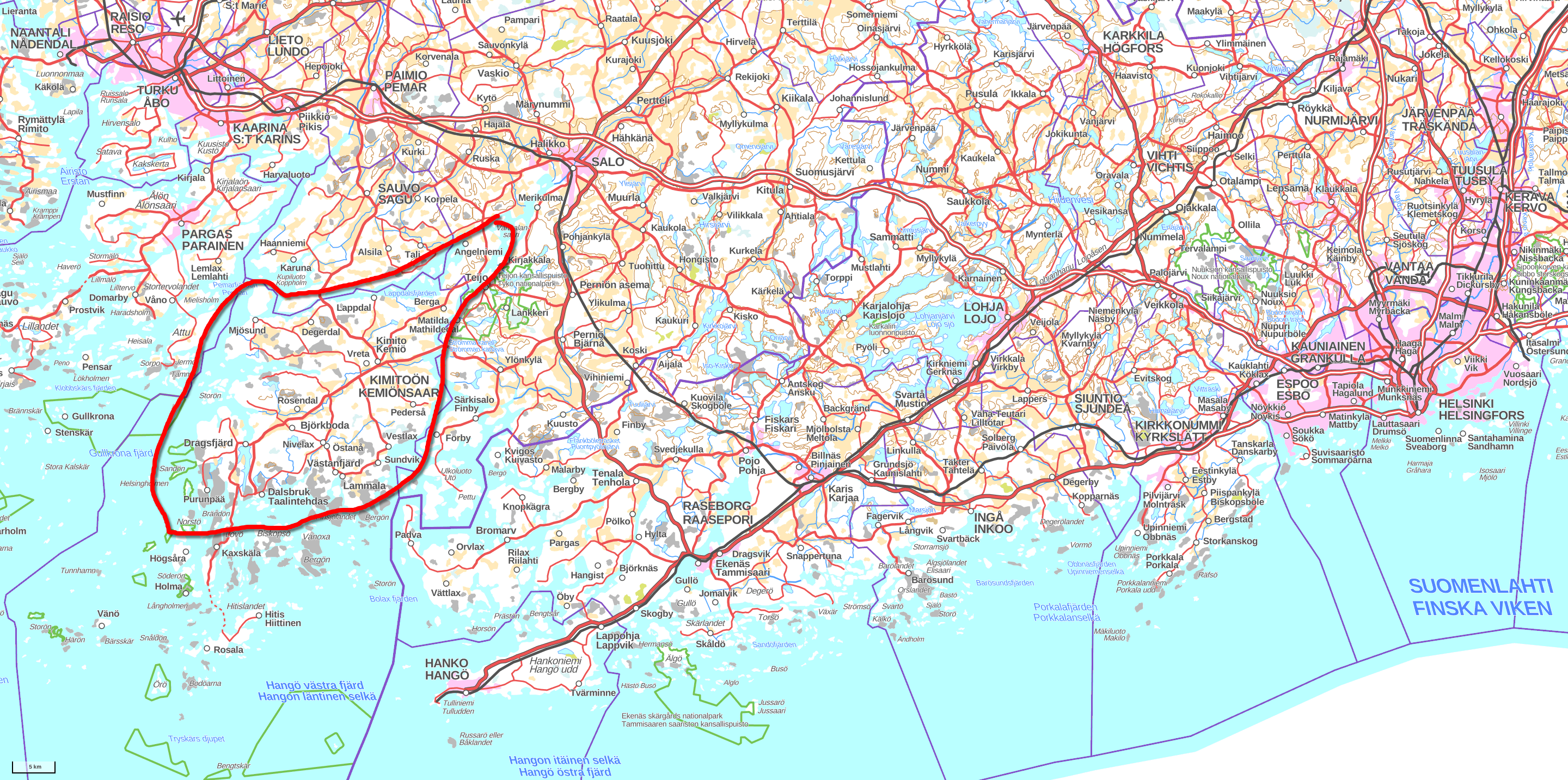 Весь остров, кроме ближайшего к Сало мыса Ангелниеми, сейчас относится к одноименному муниципалитету, образованному из нескольких других в 2009. Крупные села — Кимито в центре острова, Драгсфьерд на западе, и Дальсбрук и Вестанфьерд на южном побережье. Общее население этого муниципалитета на 2025 — 6.4 тыс. человек. Примерно 2/3 населения шведоязычно (на юго-западе Финляндии шведоязычное население сосредоточено практически исключительно на архипелагах), так что топонимика преимущественно шведская. К муниципалитету относится также внешний архипелаг с несколькими примечательными местами: обитаемый остров Хитис, про которой я уже писал; бывший остров-форт Эрё — один из интереснейших островов всей Финляндии, и вот про него почему-то до сих пор не рассказывал; и остров Бенгтшер с одним из самых известных маяков Финляндии — там я до сих пор еще и не побывал. Эрё и некоторые другие острова относятся к национальному парку Архипелагового моря (Saaristomeren kansallispuisto). До всех этих мест внешнего архипелага можно доплыть на паромах и теплоходах из гавани Каснес (Kasnäs) на южной оконечности Кимито.
