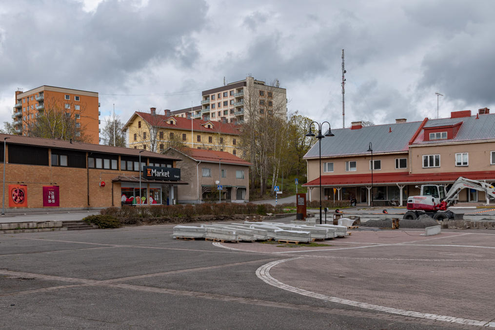 12. Центральная площадь довольно скромная, как часто бывает — магазины и бизнес тут в скучных более новых зданиях. Площадь чинят. На заднем плане выглядывает квартал многоэтажек, до которого дойдем еще.