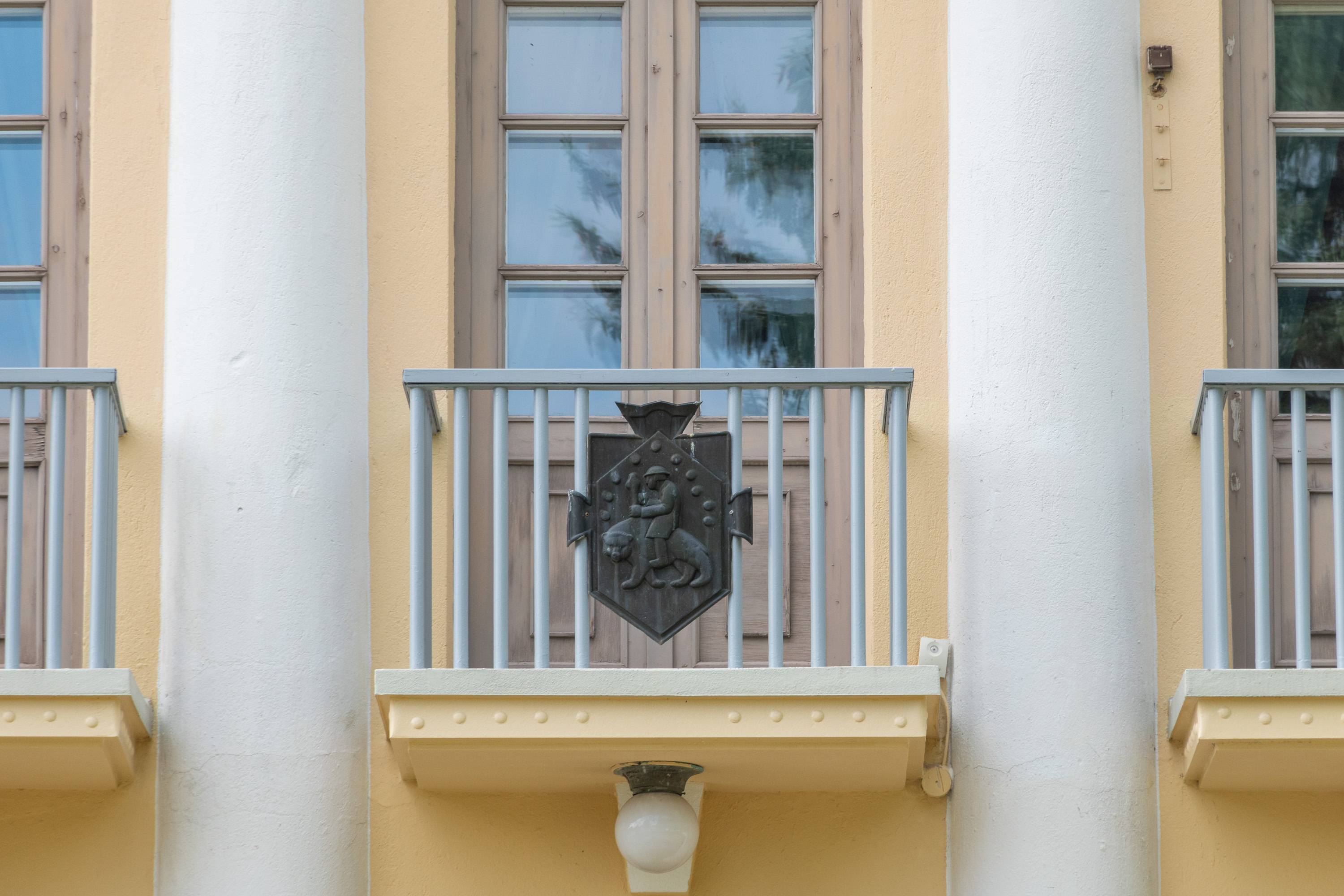 49. Герб Лапуа — один из самых запоминающихся среди финских городов и муниципалитетов: с мужиком с дубиной верхом на медведе. Этот символ использовался на печати волости Лапуа с 18 века. Медведь — популярный мотив во многих южноостроботнийских гербах (Илмайоки, Исокюрё, Каухайоки, ранее Алахярмя и Алавус), пошел изначально от печати волости Илмайоки с 1532. Но почему в Лапуа он с наездником, этого я так и не сумел выяснить. Наездник на медведе был в числе прочего также символом Лапуасского движения с 1929, и позже ее преемника, партии Патриотического народного движения (IKL). Современный герб Лапуа разработан и принят в 1950, так что герб, логотип Лапуасского движения, и вот то, что тут на балконе администрации висит, все существенно отличаются.