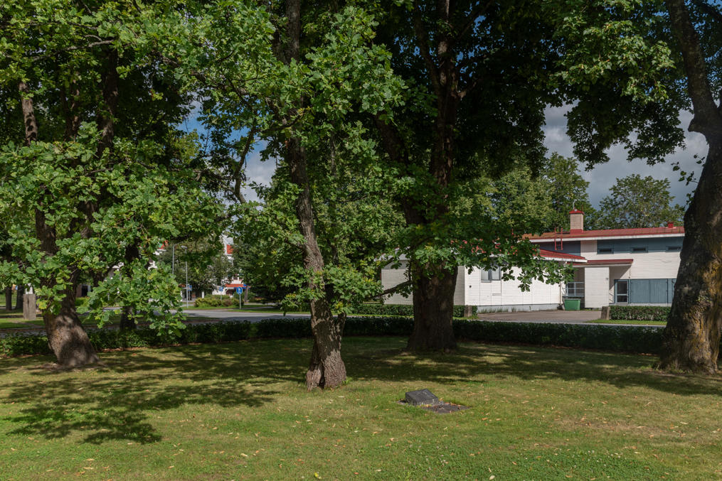 53. Олимпийский дуб в честь Лаури Коскелы (Lauri Koskela, 1907-1944), борца греко-римского стиля, выигравшего золото в Берлине-1936, а также в трех чемпионатах Европы в 1930-х. Родом был из-под Лапуа из деревни Хухталанкюля, из бедной крестьянской семьи; его отец бросил семью, жили тяжело, в школе Коскелу за это дразнили, из-за чего он и решил заниматься спортом и конкретно борьбой. Был в 1920-х коммунистом, из-за чего стал одним из тех, кого активисты Лапуасского движения похитили с улицы в машину, повозили немного, поугрожали и высадили в Алаярви. В такой атмосфере ему пришлось наступить на горло своим политическим воззрениям и сменить спортивный клуб с левого, рабочего Lapuan Ponnistus, на правый, буржуазный Lapuan Virkiä, чтобы иметь возможность продолжать спортивную карьеру. Воевал в Зимней войне, а на Войну-Продолжение его из-за возраста поначалу не взяли и призвали только в 1944, когда началось советское контрнаступление (Выборгско-Петрозаводская операция); там под Вуосалми (на Карельском перешейке, в район совр. ст. Дружное) и убит снайпером. Дуб посадили в 1939.