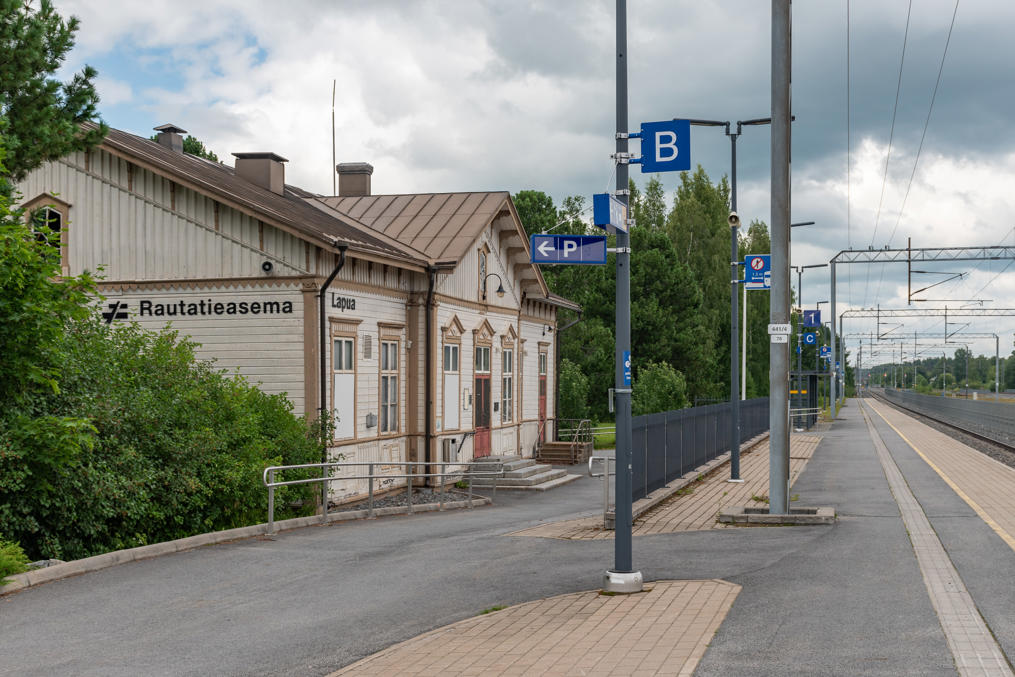 33. Но хоть платформу отремонтировали, и то хорошо. Станция еще примечательна тем, что в 1986 тут произошло сразу два крушения: в январе лобовое столкновение пассажирского и товарного поездов (пассажирский отъехал от станции с бокового пути на красный и врезался в проезжавший по главному пути товарняк, машинисты успели спрыгнуть, пострадало 15 человек); а в декабре сход именного поезда "Лаппония" — были когда-то на железных дорогах Финляндии именные поезда; "Лаппония", несмотря на название, ходил (в 1972-1994) не в Лапландию, а до Оулу, и был самым скоростным поездом на этом маршруте (Хельсинки-Оулу 6:45). "Лаппония" должна была проехать Лапуа без остановки на 120 км/ч, но из-за снегопада и проблем со стрелками все поезда отправляли через боковые пути, с ограничением в 35 км/ч на стрелке, а машинист "Лапонии" не прореагировал на соответствующий светофор и не уменьшил скорость заранее, ну и улетели на стрелке со всеми вагонами. По счастью, все вагоны остались в вертикальном положении, и пострадавших вышло всего двое из около 200 пассажиров.