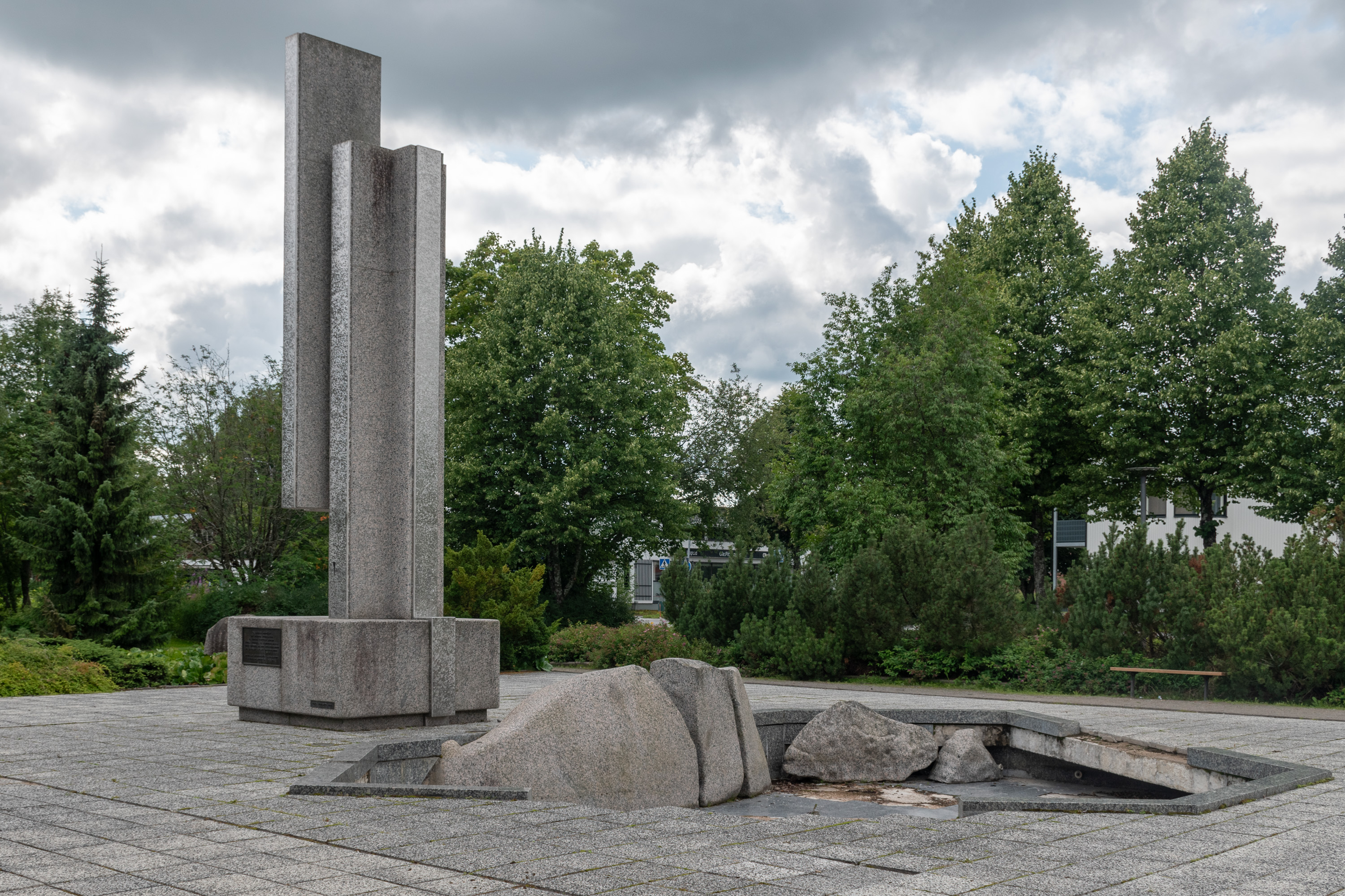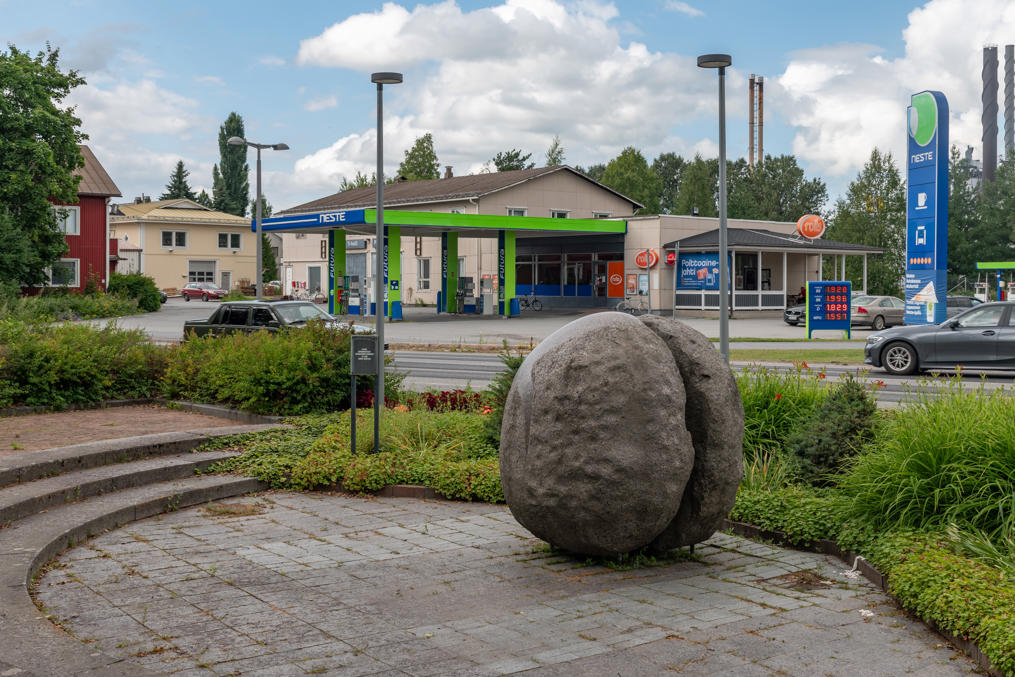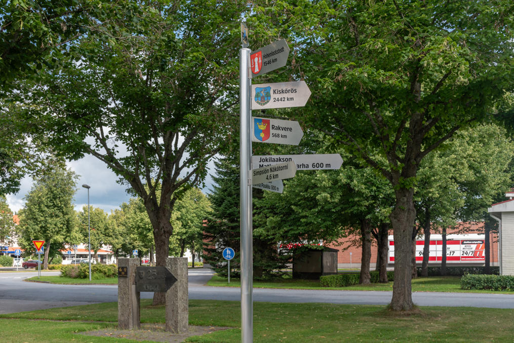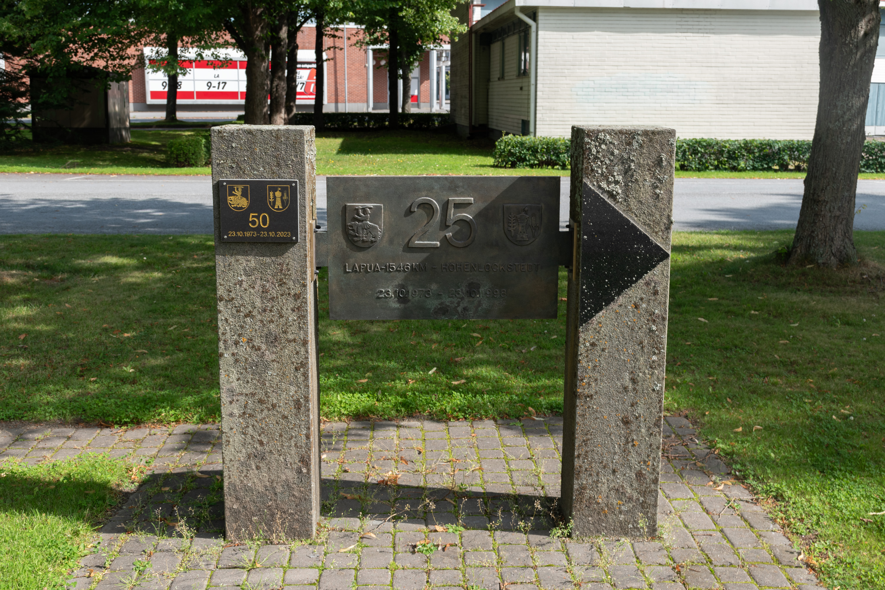 50. В сквере у городской администрации стоит несколько памятников. Это — городу-побратиму, Хоэнлокштедту, в Германии в Шлезвиг-Гольштейне на 6 тыс. человек, на 25-летие и потом 50-летие побратимских отношений. Это не случайное место; городок начался с военного полигона Lockstedter Lager, и именно там в 1915-1917 тренировали 27-й егерский батальон, собранный из финских добровольцев, тайно выехавших из страны, чтобы воевать в Первой мировой на стороне Германии — и после 1917 составивших ядро финских белогвардейцев и позже армии независимой Финляндии. Позже там нацисты обучали штурмовиков (SA), и после Второй мировой большая часть полигона была снесена; вот башенка, которая на гербе видна, осталась.