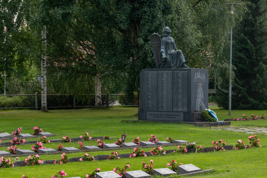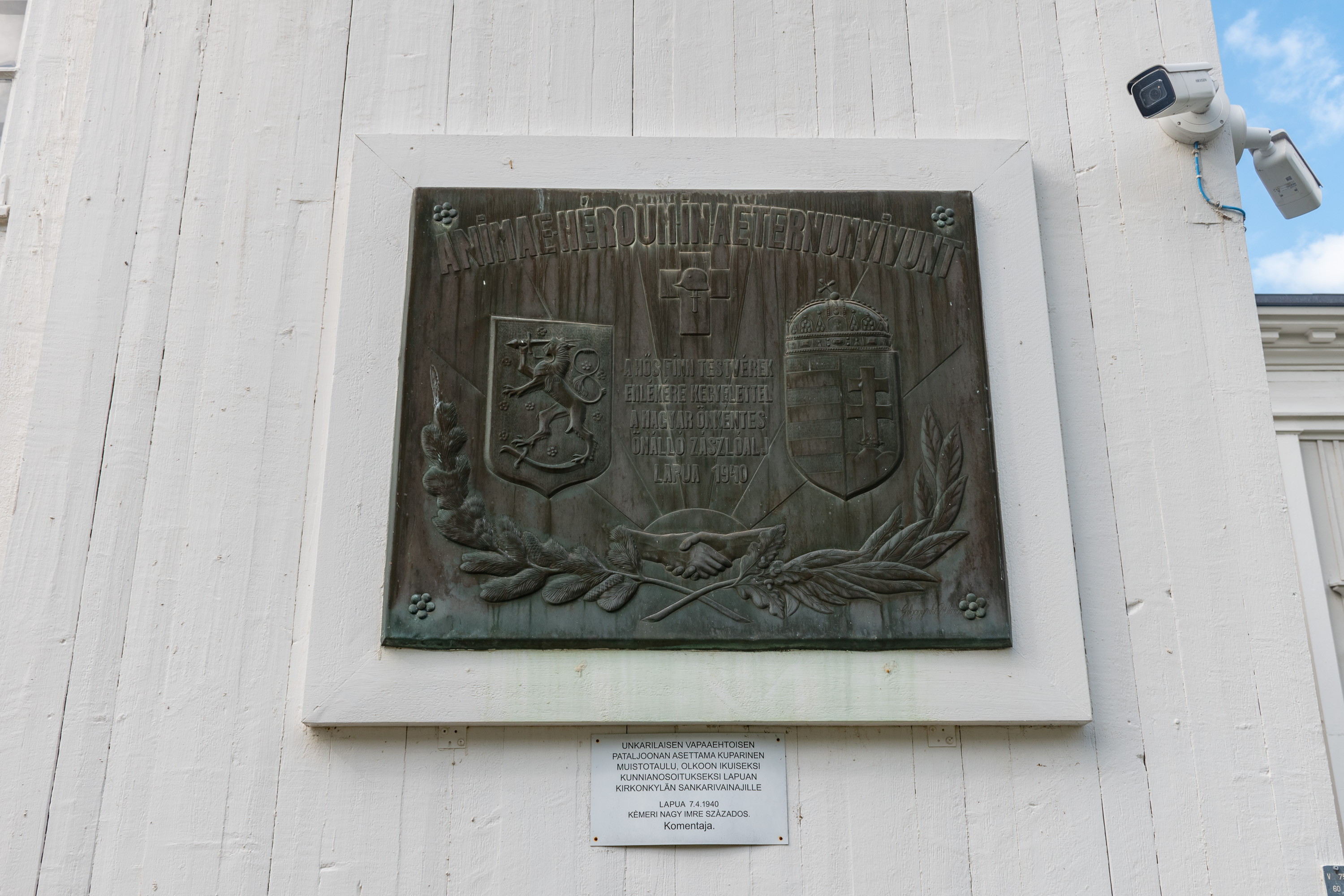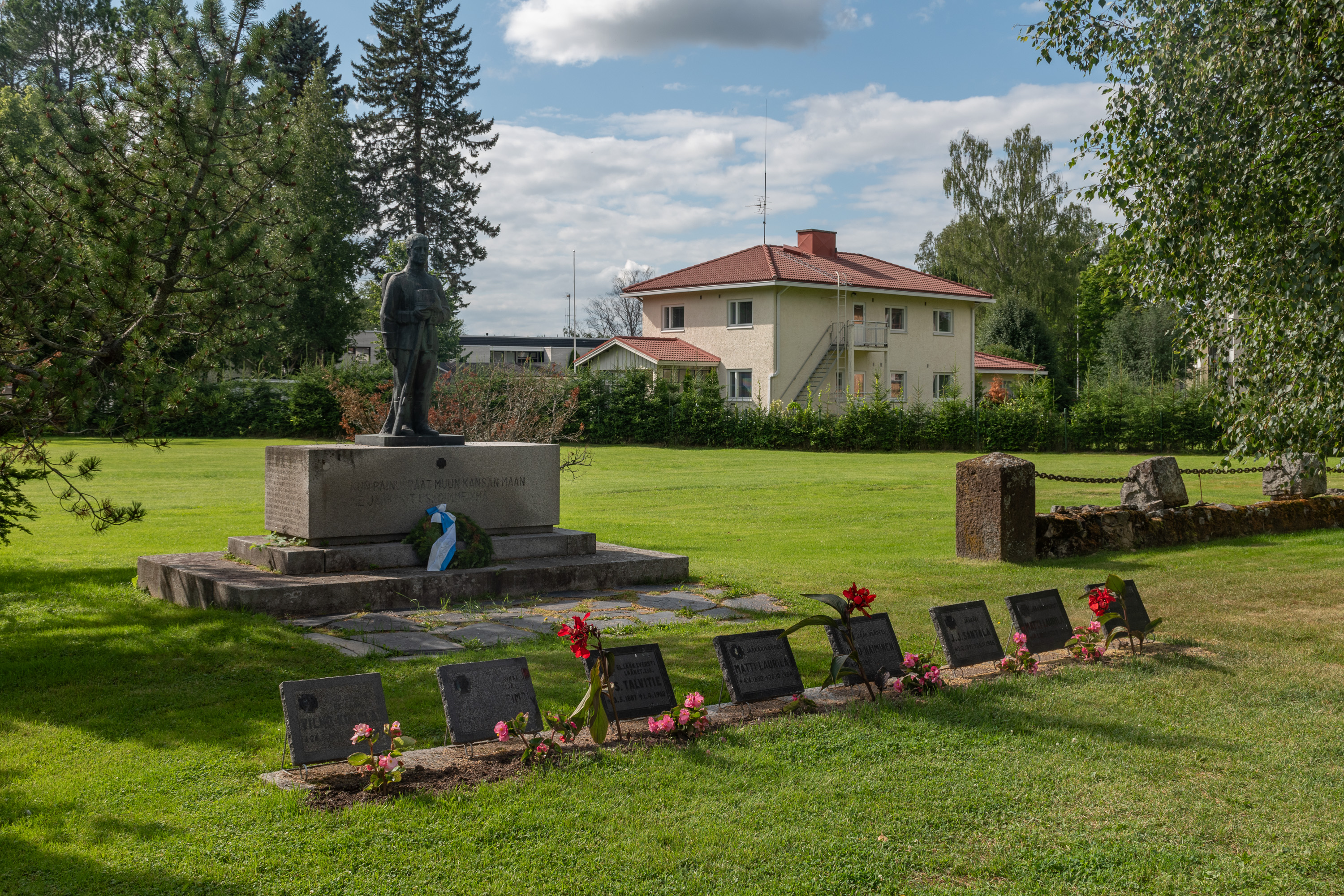 58. Воинские памятники у церкви в высшей степени основательные. Этот — местным белогвардейцам, павшим в Гражданскую войну 1918, 47 человек. На памятнике скульптора Юрьё Лиипола 1921 года написаны строки тогдашнего лапуасского пастора Вильхельми Мальмиваара: "Дома, веры нашей стражи // Битва ваша Финляндии победу принесла // Народ, что видел подвиги ваши // Рабами не станет уже никогда // Ваша память святая // До сих пор живая // Слезу и благодарность могиле вашей дала".
