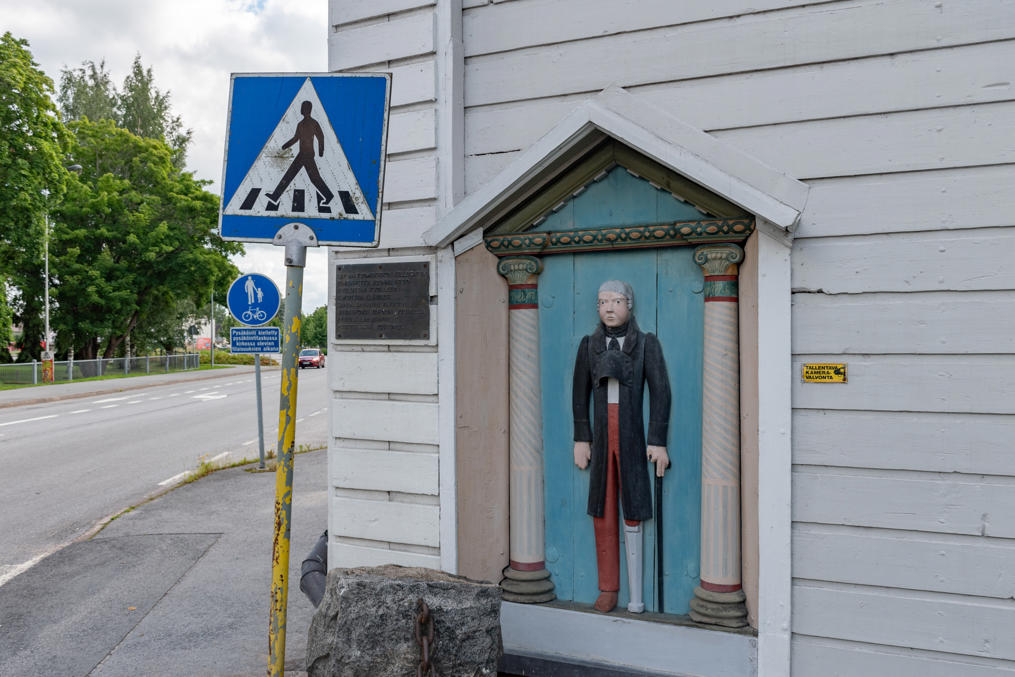 57. Колокольня, конечно, оборудована статуей инвалида-"убогого деда" (vaivaisukko) для сбора пожертвований; редкая старая остроботнийская церковь обходится без нее.