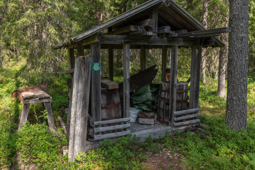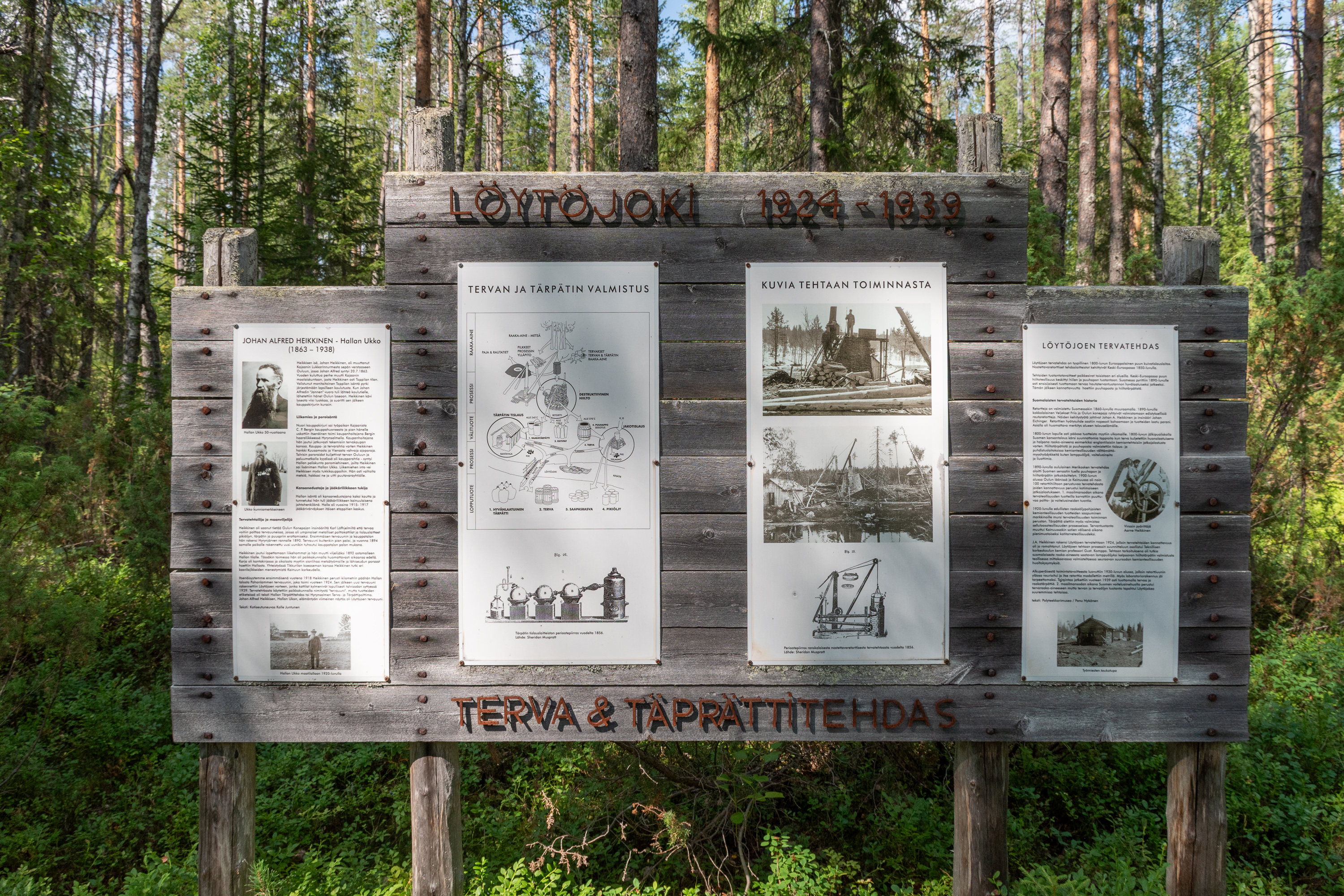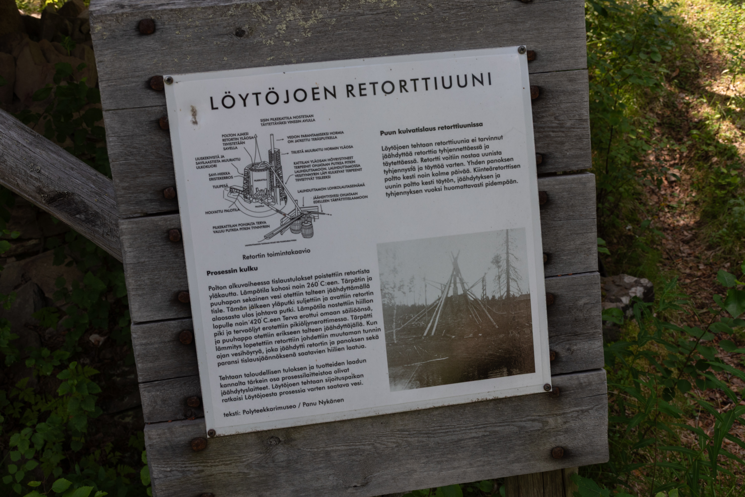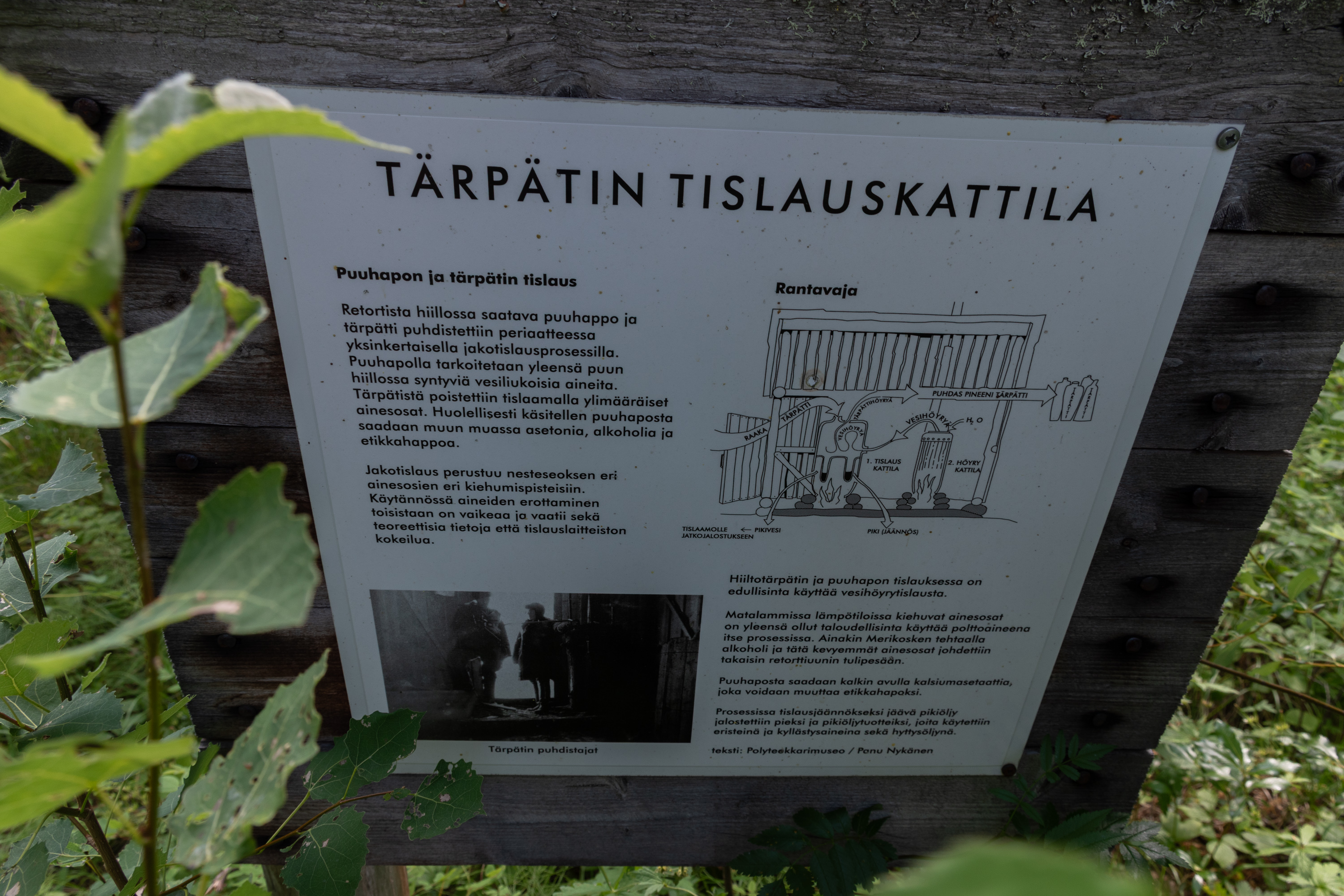 58. Дед Халла был не первым, кто выгонял деготь в реторте вместо традиционных ям (первые такие заводики появились в 1890-х, а к 1920-м были уже основным способом получения дегтя), но он стал одним из последних дегтярей. После войны эта отрасль промышленности окончательно сошла на нет, и скипидар теперь получают как побочный проект производства целлюлозы, а деготь в наши дни в Финляндии производит всего несколько маленьких предприятий, например, в Кайнуу Lentiiran Terwa, причем, как я понимаю, уже снова традиционным методом. Деготь используется до сих пор, например, для смоления деревянных крыш старых церквей, и в наши дни мировым лидером в производстве дегтя, как и почти всего остального на свете, стал Китай. Ну а заводик Деда Халлы был отреставрирован до нынешнего состояния Музейным ведомством в 2000 году, о чем рассказываатся в этой избушке для привала. Теперь он является, насколько мне известно, уникальной достопримечательностью в масштабах всей Финляндии, хоть, конечно, и не особенно визуально впечатляющей.