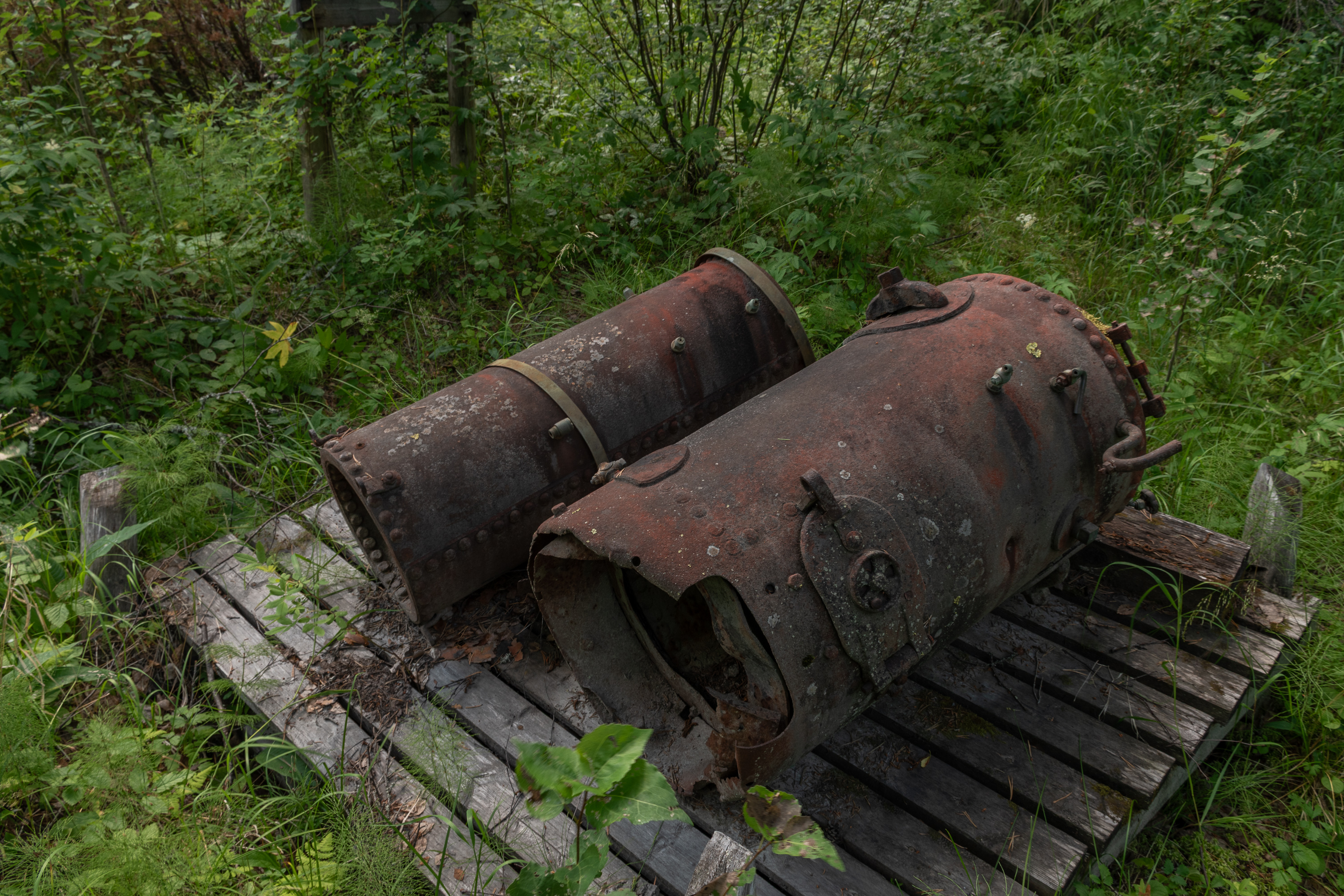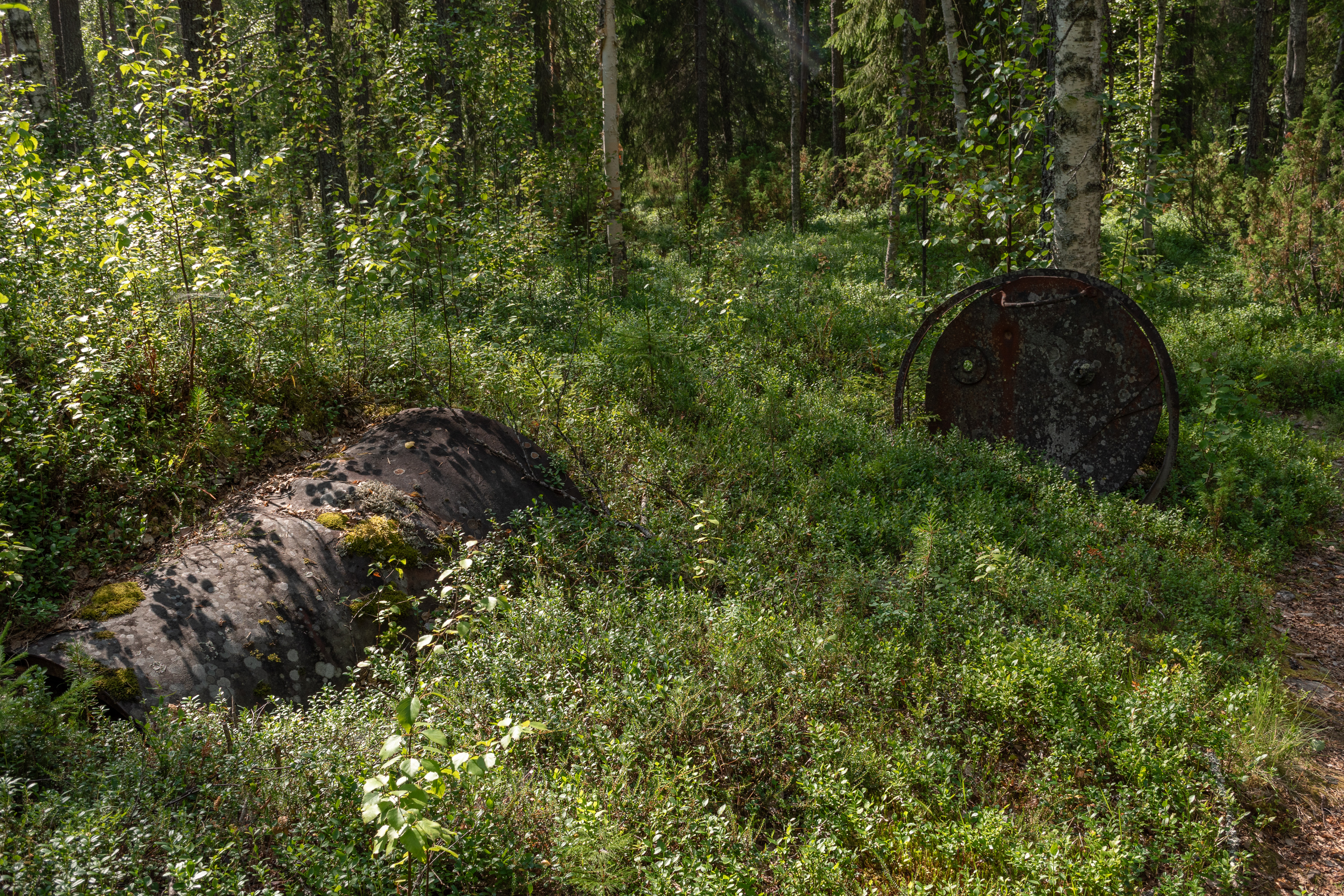 56. Восстановленный кран, вероятно, для загрузки реторты, и другие оставшиеся артефакты. Сохранилось от завода, конечно, мало что. Он проработал до Зимней войны, до осени 1939 (Дед Халла сам в 1938 умер еще), а потом в 1942 немцы, строившие полевую ж/д (она прошла всего в полукилометре отсюда, а сейчас, понятное дело, идет вместо нее современная ж/д дальше за Хюрюнсалми) растащили для своих потребностей все, что могли, в том числе медные трубки холодильника — самый ответственный с технологической точки зрения компонент.