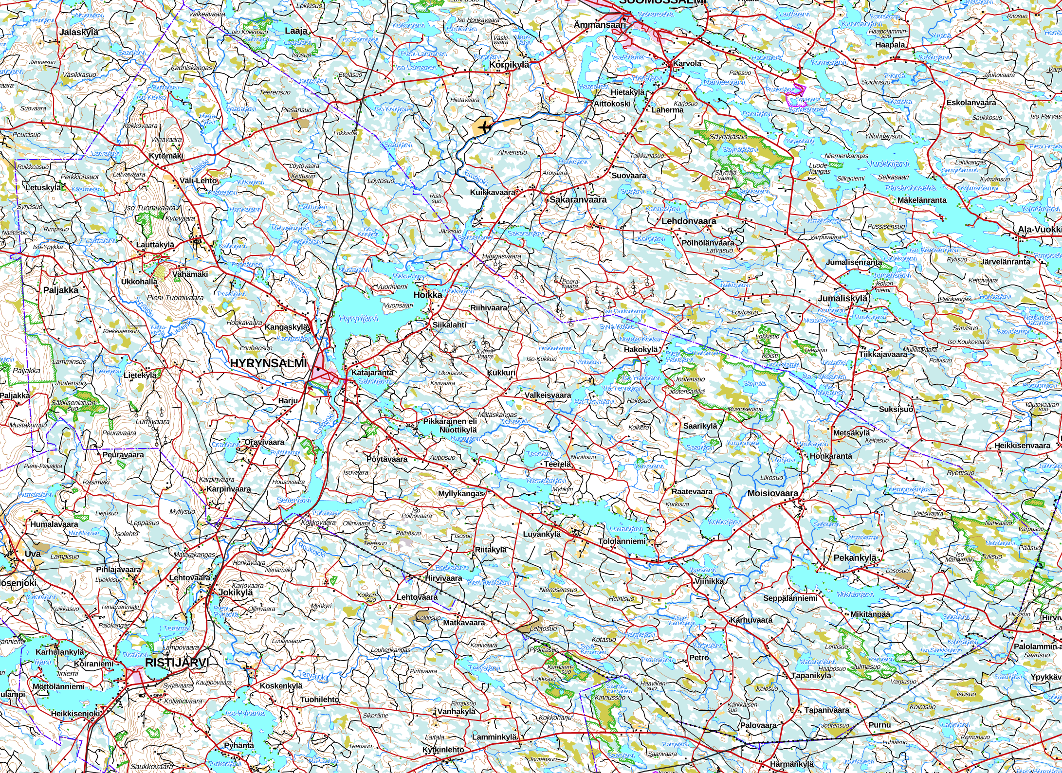 24. Основная же часть поселка располагается за проливом-стремниной между парой озер на реке Эмяйоки, который и дал всему муниципалитету свое название. Hyrynsalmi — пролив Хюрю — по-видимому, от фамилии североостроботнийского крестьянского рода (из Лиминки и Теммеса, немного к югу от нынешнего города Оулу), ходившего в эти края на промыслы, когда постоянного населения тут еще не было.