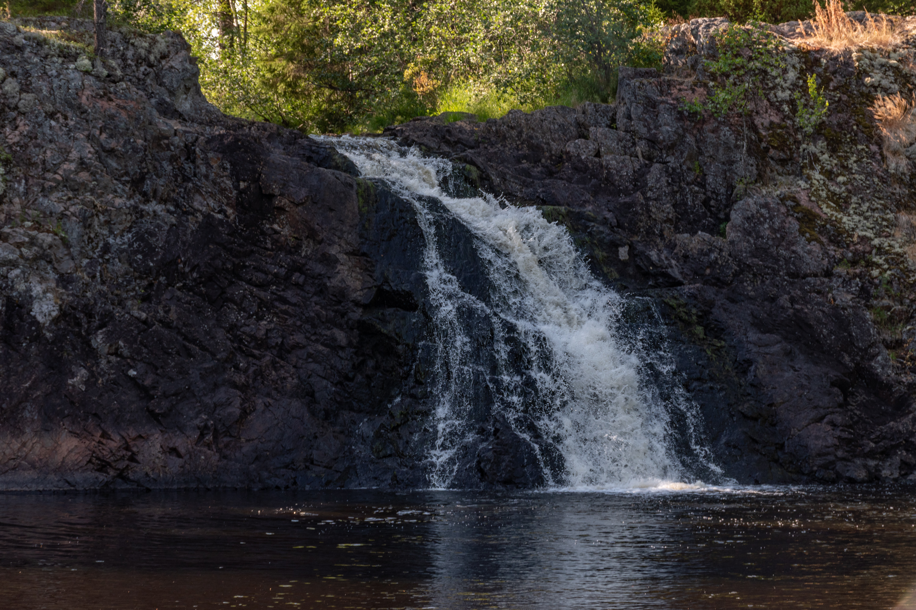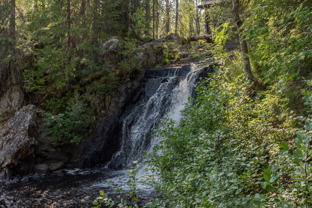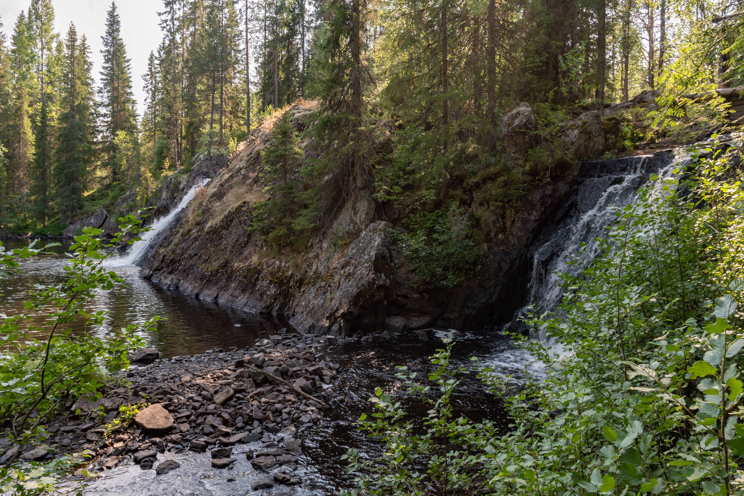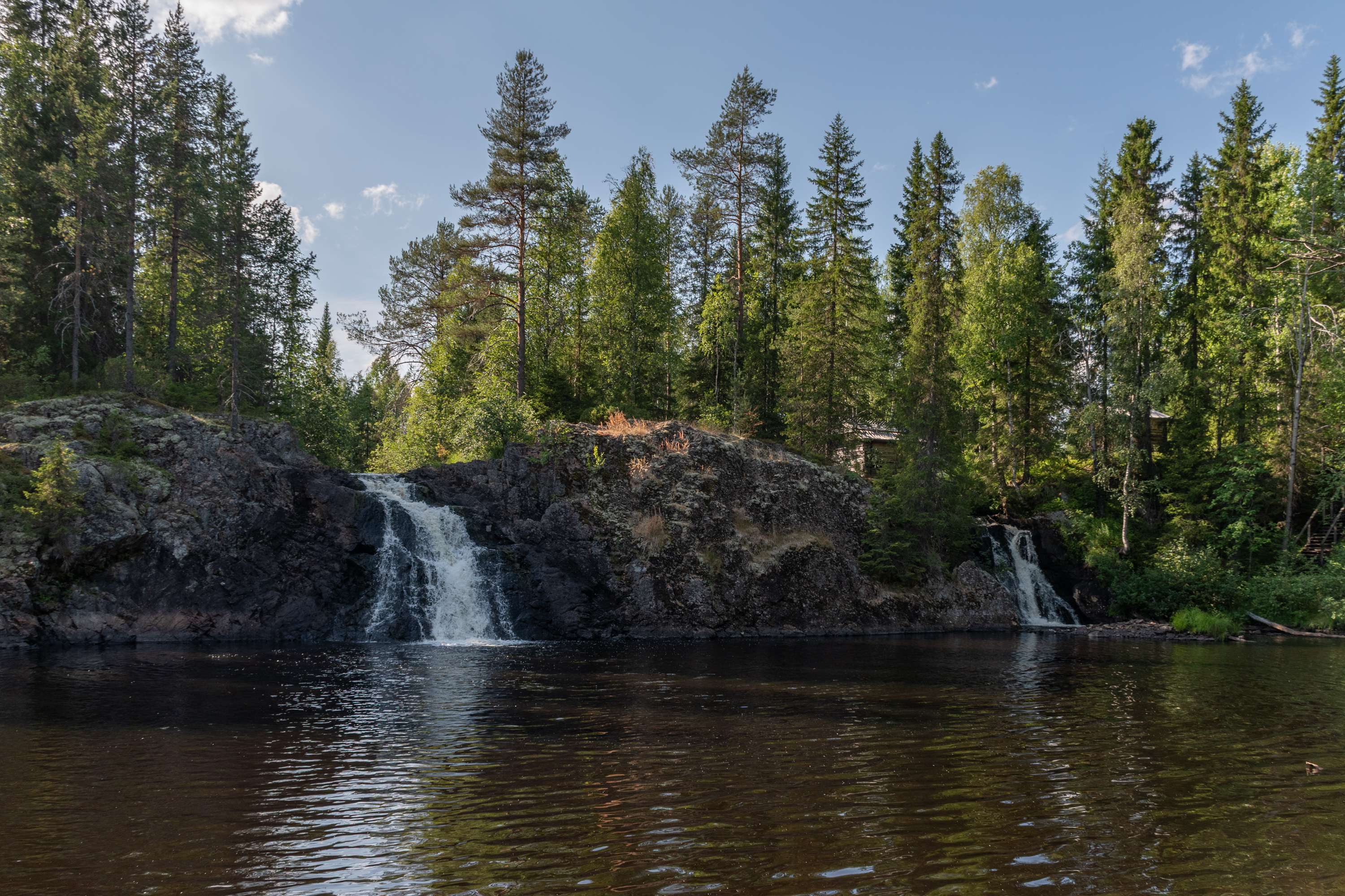 65. Ну, так мы плавно перешли к природе. Еще одна хорошая природная достопримечательность в пешей доступности от Уккохаллы (тропка идет в 4.5 км, хотя на машине еще проще доехать) — водопад Комуланкёнгяс (Komulanköngäs). Водопад высотой 6 м особо известен тем, что это водопад двойной — река Сювяйоки над водопадом делится на два русла, которые в паре десятков метров друг от друга по отдельности падают в этот прудик. Больше таких сколько-нибудь крупных/известных двойных водопадов в Финляндии я и не припомню.