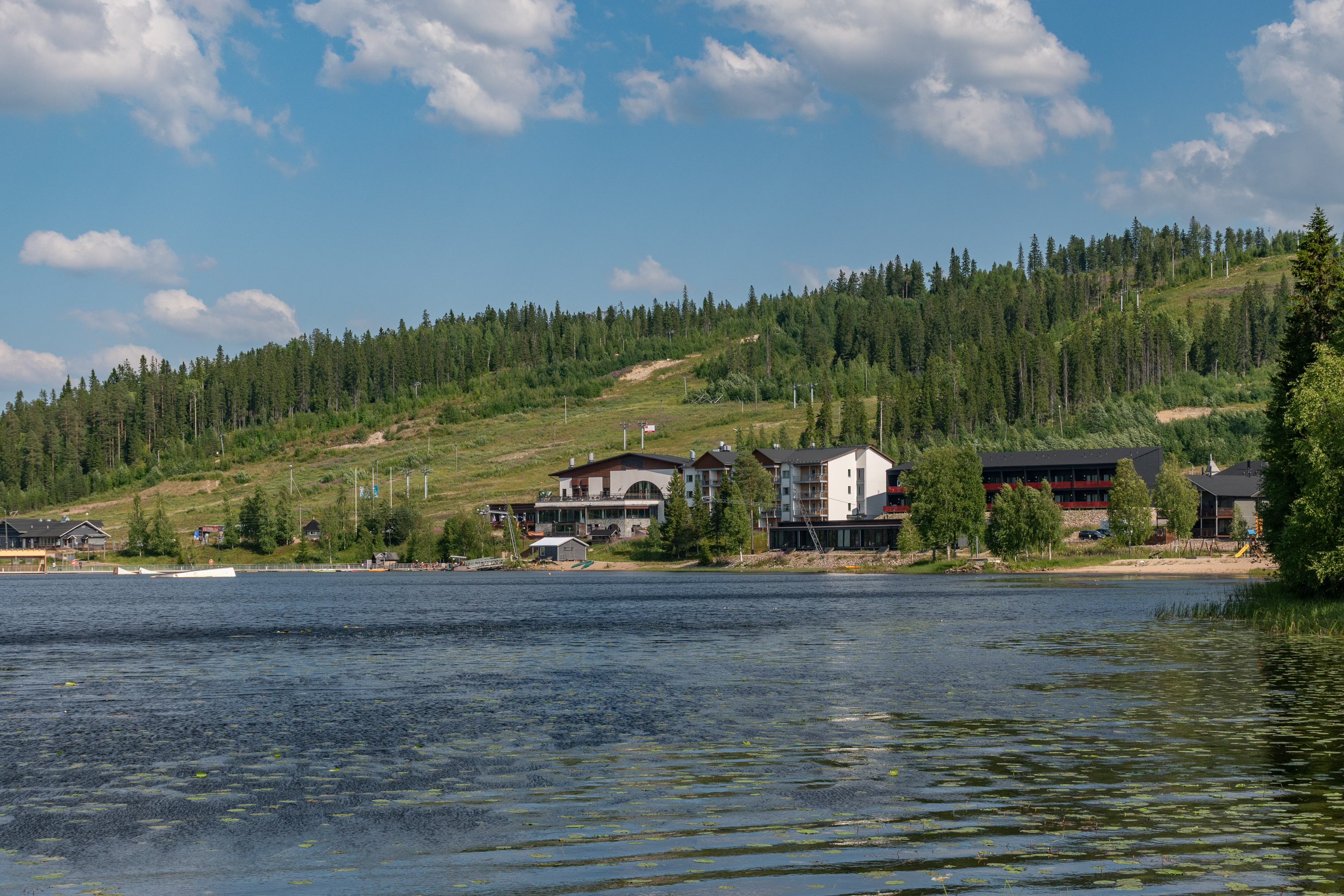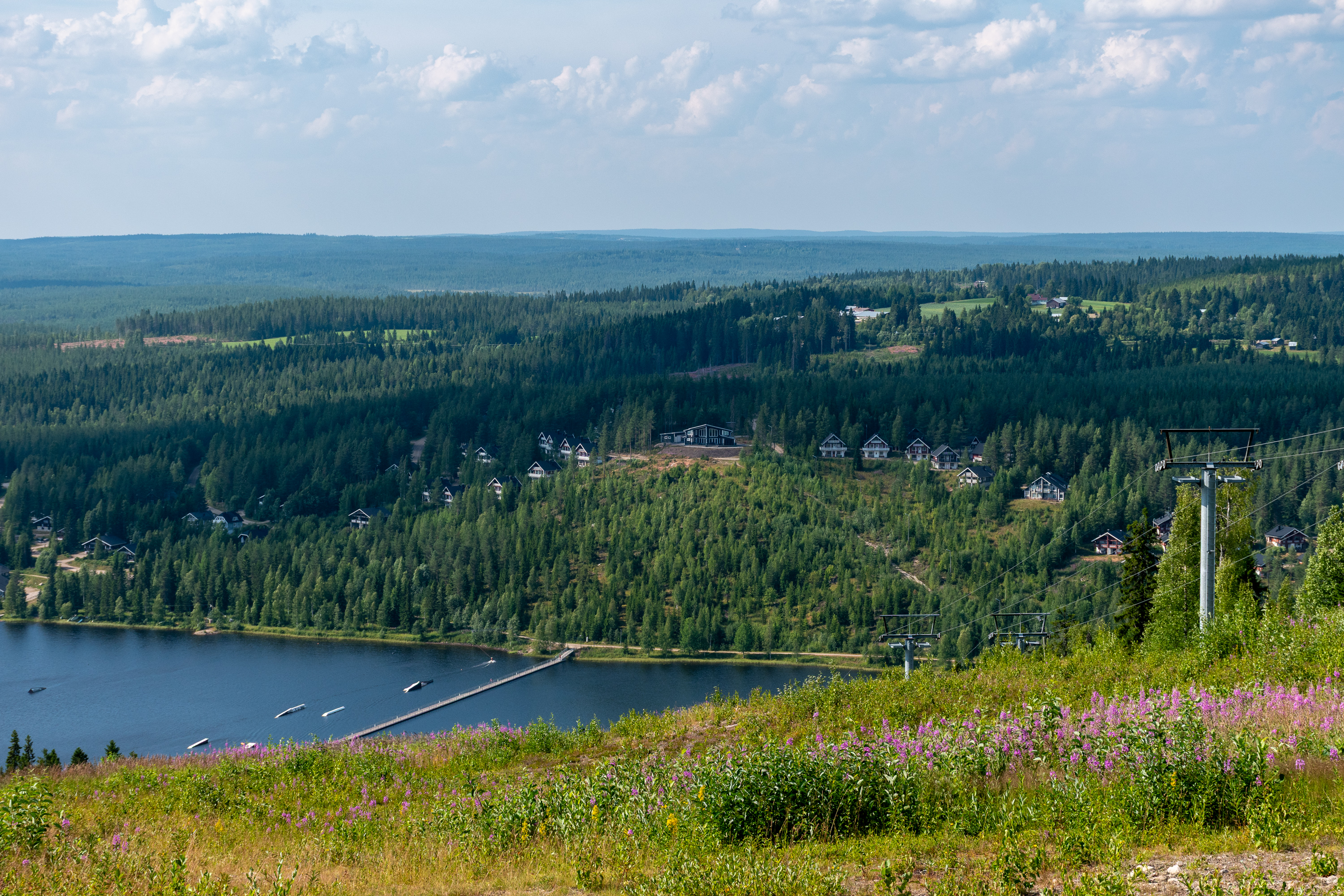 61. Тут видны большие коттеджи на склоне Исо-Туомиваары, а на заднем плане, чуть повыше на сопке, еще несколько хуторов такого же типа, как Халла. А в озере видны трамплины — летом тут занимаются вейкбордингом. Но, конечно, летом тут все равно довольно малолюдно; эти все горнолыжные центры — весьма приятные места, где можно без проблем и без толп, но с хорошим комфортом остановиться летом-осенью в ходе такой краеведческой или походной поездки.