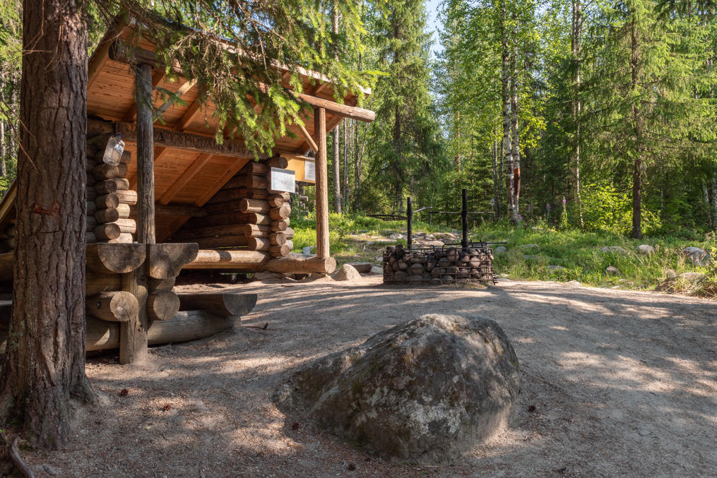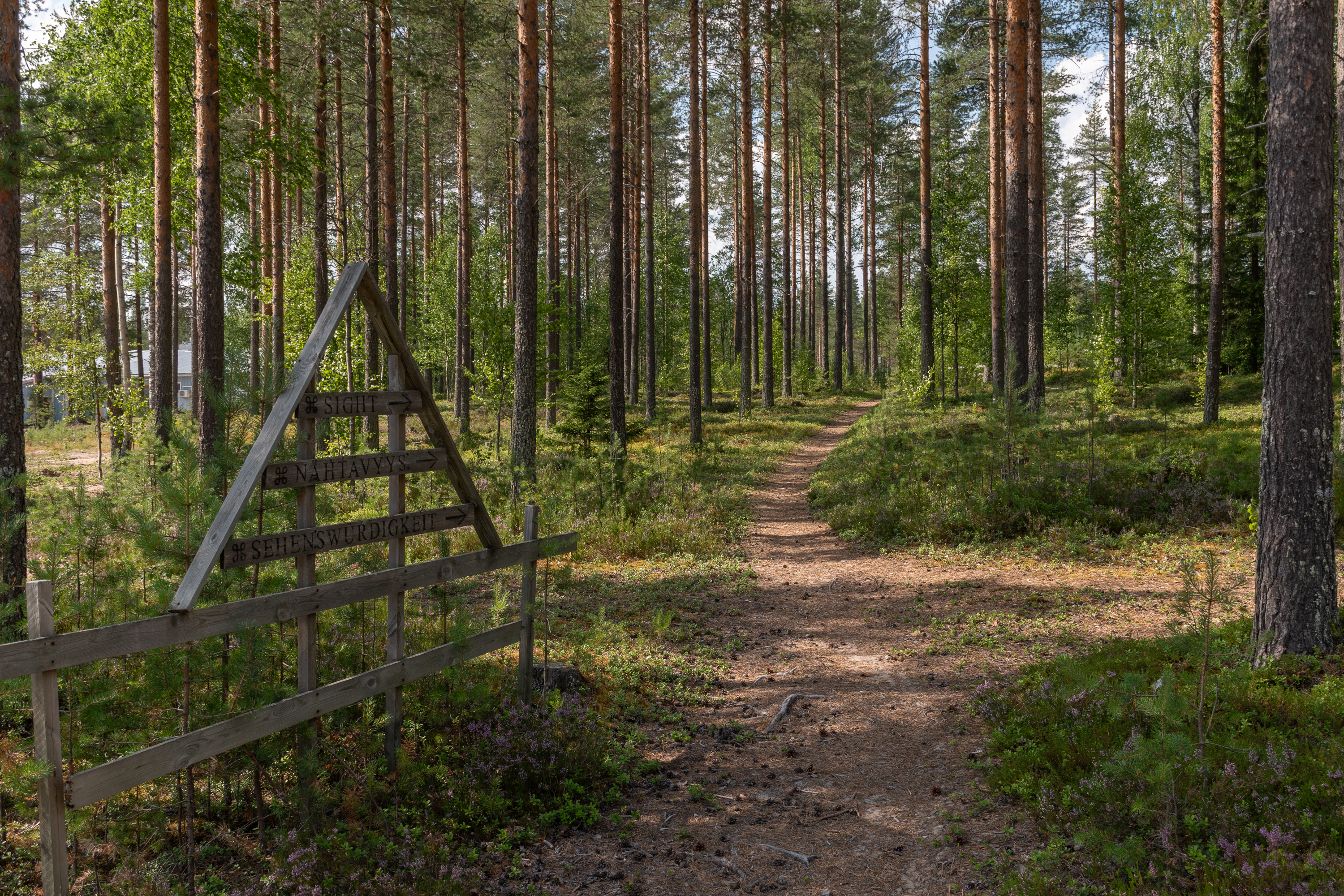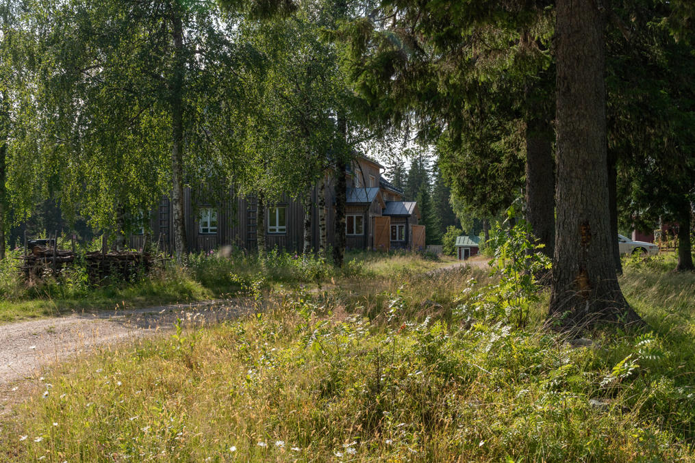 71. Пейзажем сопок же можно полюбоваться еще чуть дальше на запад, на тропе Мустаринда (Mustarinda). Название означает буквально "черная грудь", но на современном финском это было бы Mustarinta. Mustarinda — это на карельский манер, и это было на самом деле одно из старых имен для медведя. Как известно, финны (и карелы) избегали называть медведя его истинным именем, которым, скорее всего, было oksi, в карельском ohto, в современном финском otso; а наиболее распространенное слово для медведя karhu просходит от karhea, "грубый, шершавый" (о шерсти). Тропу так назвали и оборудовали какие-то местные деятели искусства, которые также рядом с ее началом построили тут себе такое вот ателье Мустаринда и живут тут по очереди.
