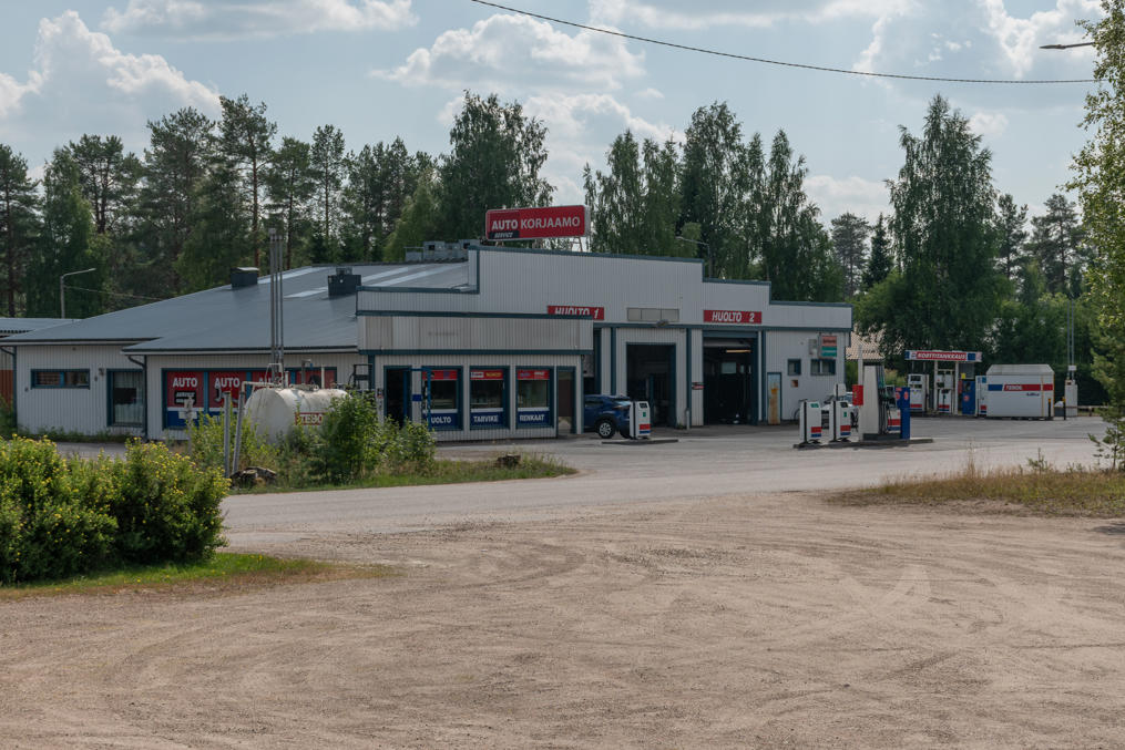 1. Современная станция Хюрюнсалми находится на окраине поселка, в добрых полутора километрах от центра. Станция достаточно крупная — это один из основных центров погрузки леса в Кайнуу, регионе, который сам по себе является довольно значимым для лесного хозяйства. Железная дорога с юга, от узловой станции Контиомяки дотянулась сюда одновременно с началом Зимней войны, 1.12.1939. Здание вокзала, соответственно, типовое для мелких станций в 1930-х, довольно унылое и минималистичное. На неиспользующеся пассажирской платформе перед ней поставили сейчас какой-то старый маленький локомобиль.