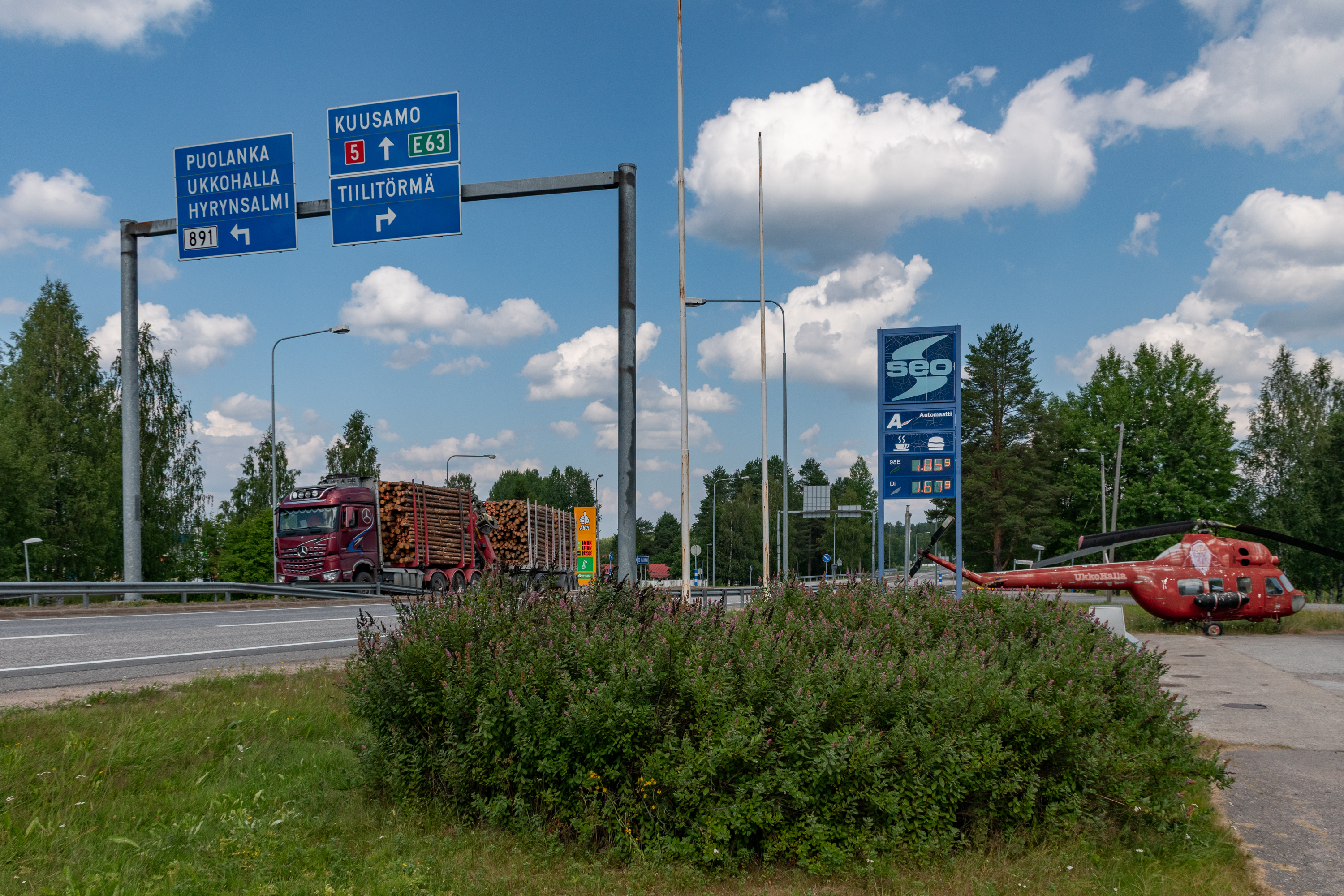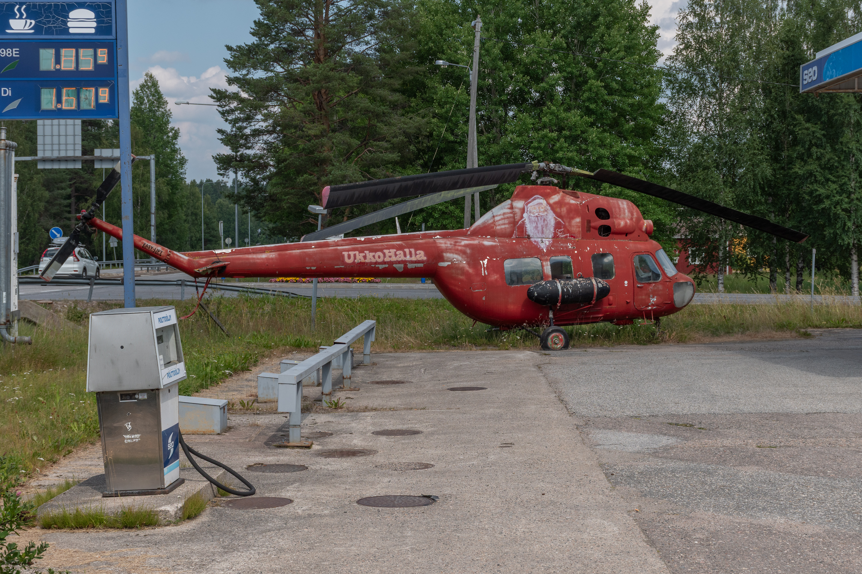 19. Но пора поговорить и про остальной Хюрюнсалми и его достопримечательности, не все же про станцию и военнопленных. Если вы просто проезжаете мимо Хюрюнсалми на север, в сторону Куусамо и Восточной Лапландии, то на заправке у въезда в поселок можно заметить вертолет. Это вертолет Деда Мороза (Йоулупукки) :) Дело в том, что Хюрюнсалми — самая южная в Финляндии территория оленеводства, так что, если Деду Морозу надо ехать дальше на юг, то тут с оленей придется пересаживаться на вертолет!