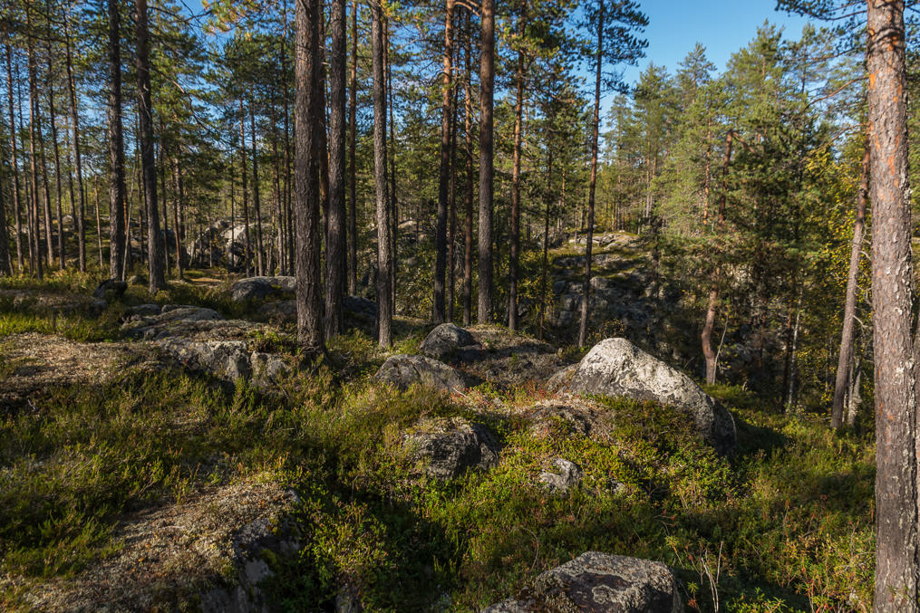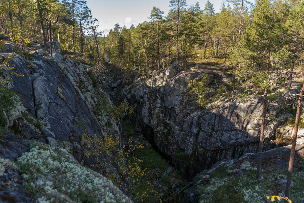 76. Несмотря на то, что большая часть всего региона Кайнуу расположена на возвышенностях с сопками, обводы этих сопок почти неизменно очень плавные, и выходов скал на поверхность, типичных в Южной Финляндии, тут как раз-таки на удивление мало. Но зато на удивление много довольно эффектных ущелий. Самые известные — Хииденпортти в одноименном национальном парке в Соткамо и совершенно огромное Юлма-Элккю в национальном парке Хосса в Суомуссалми. В Хюрюнсалми же можно упомянуть это Хииденкиркко, а также ущелье Вортикка (Vortikka) на южном склоне Пиени-Туомиваары.