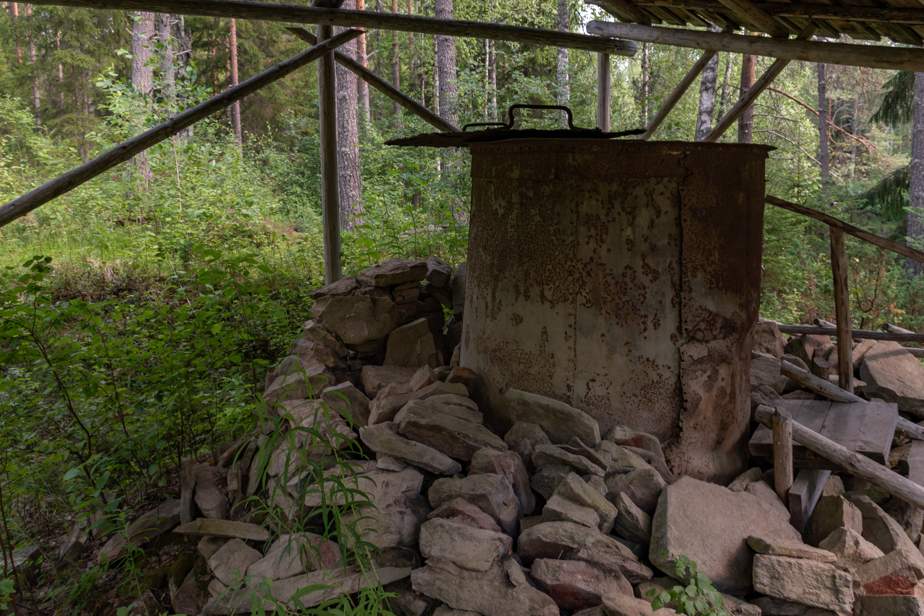 49. Егери егерями, но еще одно интересное место в округе — остатки одного из дегтярных заводиков Деда Халла. Обычно его зовут "скипидарным заводом", tärpättitehdas — скипидар на нем тоже гнали. Заводик находится близко к началу 14-километрового пешего маршрута вокруг заповедного озера Саариярви (Saarijärvi, фин. Островное озеро) — того самого, на острове на котором была хижина егерей, да и остается тоже, только попасть на этот остров возможности особой нет, иначе как зимой по льду. Это совсем недалеко от хутора Халла, по той же лесной гравийке следующая своротка. Весь маршрут я не проходил, но на заводик было интересно посмотреть.