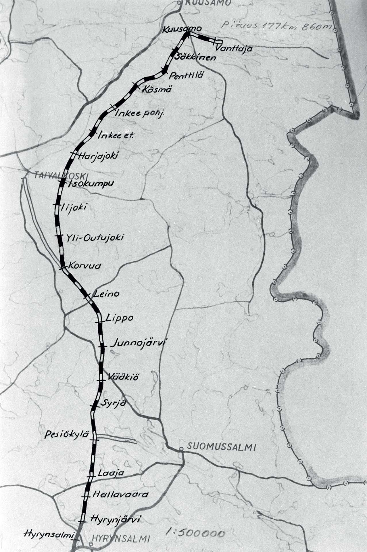 17. Немцы уничтожили железную дорогу в сентябре 1944. Отступали из этих районов немцы без спешки, и все, что нельзя было забрать с собой, удалось вывести из строя крайне основательно; все мосты и здания были взорваны, подвижной состав уничтожен. Начали они это дело еще до заключения перемирия между Финляндией и СССР, так как русские перешли в наступление под Кестеньгой 7.9.1944. К 17.9 они перешли границу с Финляндией и к 27.9 заняли Куусамо, тоже сожженный немцами, но самих немцев там уже не было. (Оккупация Куусамо и Суомуссалми продлилась совсем недолго, советские войска отошли к границе, когда финские прибыли с юга.)