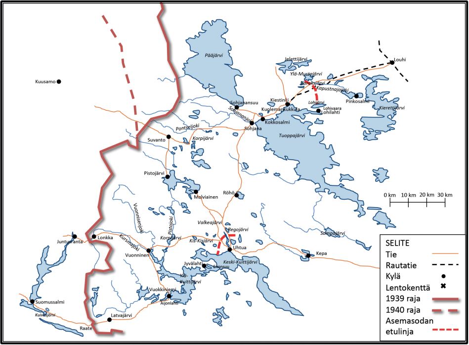 10. В Войну-Продолжение — финляндско-советскую войну 1941-1944 — Северная Финляндия, от широты Оулу и дальше, была зоной ответственности немцев, которые разместились там перед войной и напали на СССР с территории Финляндии. Под командование Германии также был передан финляндский 3-й армейский корпус генерал-майора Ялмара Сииласвуо (Hjalmar Siilasvuo), героя Раатской дороги в Зимнюю войну. Немцы атаковали севернее, на Печенгу и через Саллу на Кандалакшу, а Сииласвуо достались направление на Ухту (т. н. группа F, от имени командовавшего ей полковника Фагернеса) и на Кестеньгу-Лоухи (группа J, подполковника Юсси Туртолы). Наступление началось 1.7.1941.