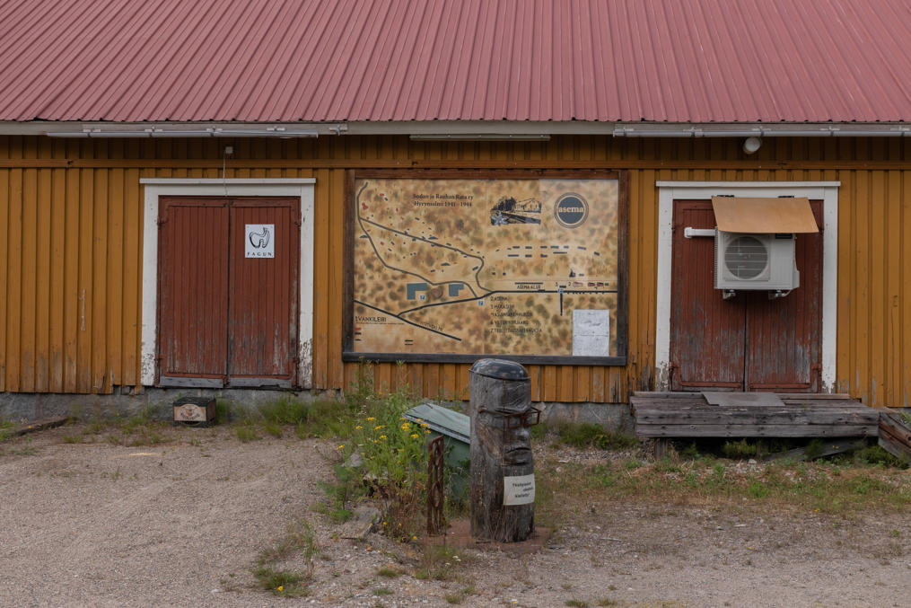 Так оно, конечно, часто бывает, что от мест, где происходила самая мрачная жесть, осталось меньше всего. Вообще тут в Хюрюнсалми было много инфраструктуры, целый поселок немецкий, здесь же перегружали грузы с основной финской ж/д сети на эту полевую дорогу; в лесу за станцией, судя по одной из висящих схем, можно найти какие-то еще фундаменты депо и проч., но тоже очень мало что. А ж/д путь за станцией к нынешней лесопилке до сих пор зовется "Берлинским" (Berliinin raide).