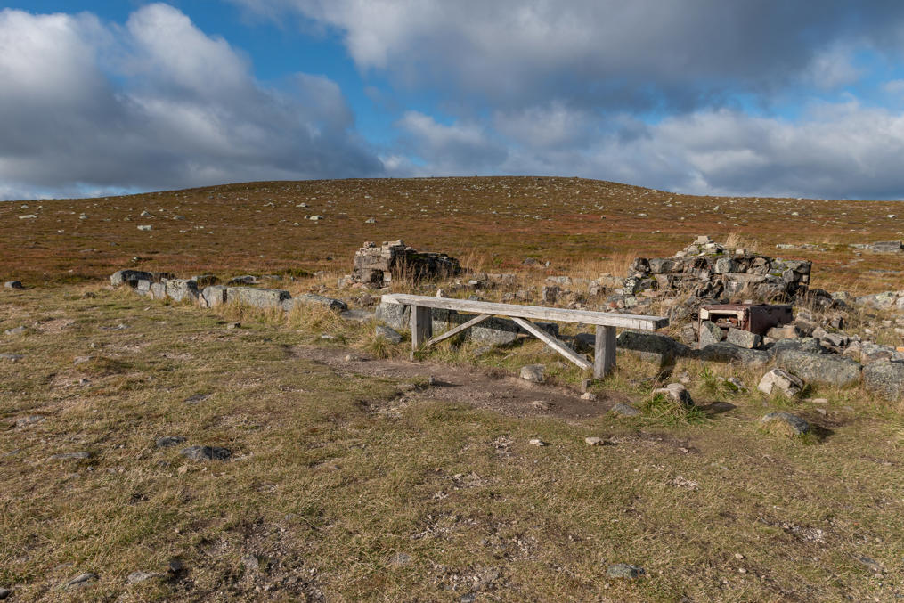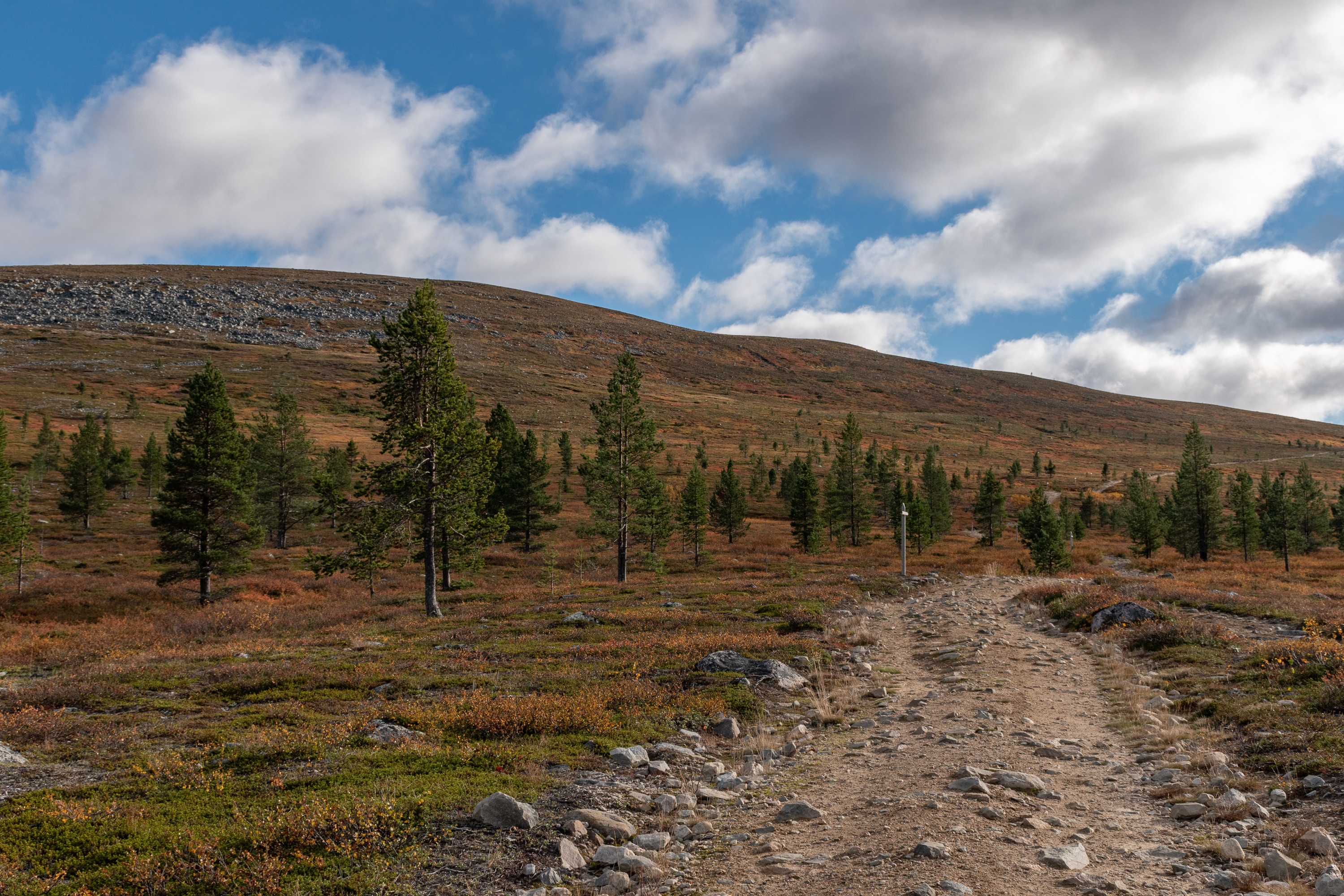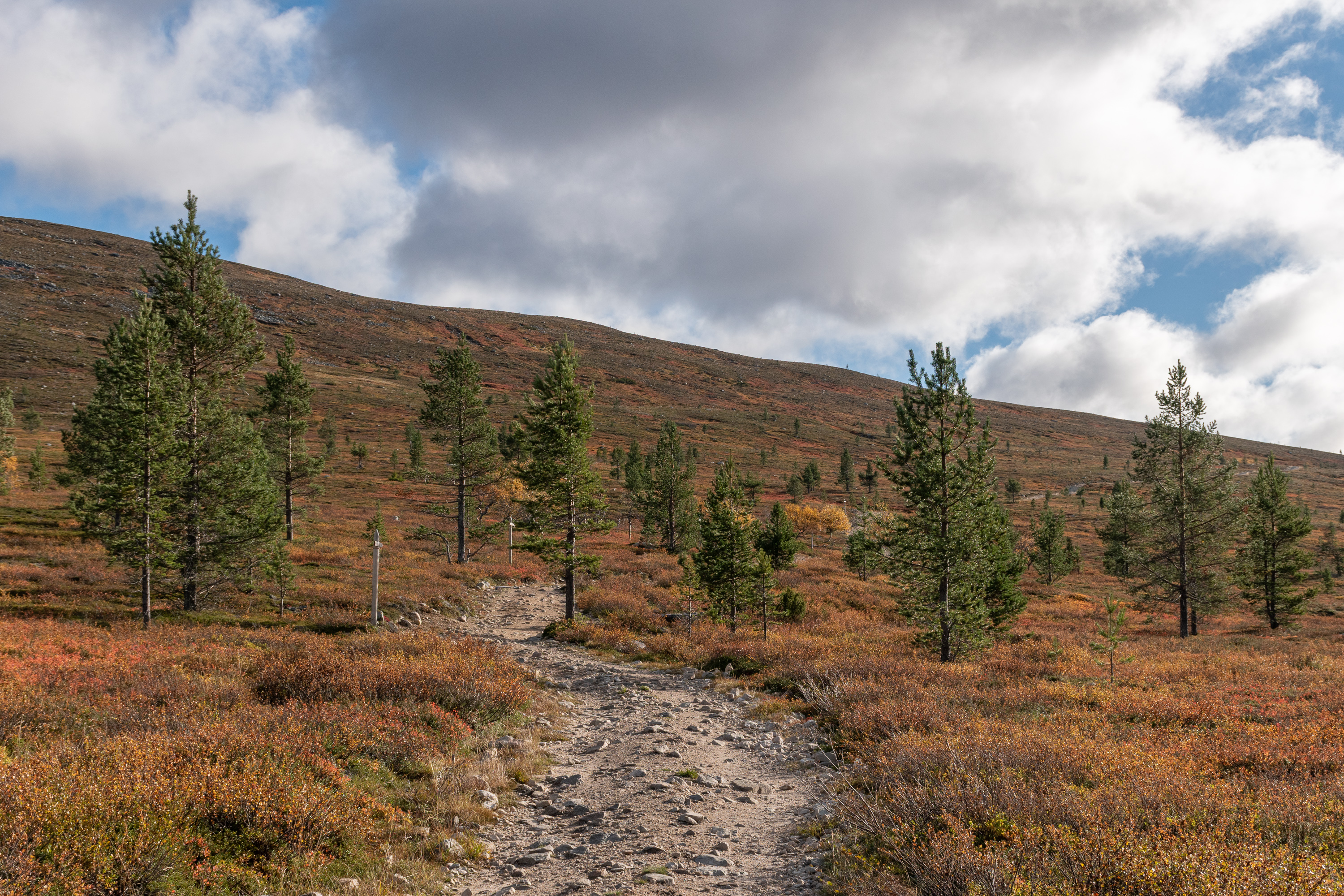26. Оставшиеся километры проходят по плавному спуску к распадку Сиоскуру (Sioskuru), месту первой ночевки. Многие из этих мест тут называются на -kuru — этим словом обозначается распадок между тундрами, иногда крутое ущелье с каменным осыпями, но чаще относительно плавная форма рельефа. В этих распадках на Оунасе и Палласе текут ручьи и растут худо-бедно деревья, прикрывающие от ветра, так что для ночевки самое то. Минус только в том, что из-за этого рельефа телефон может ловить хуже или не ловить вообще, но на этом маршруте более-менее все-таки у меня везде ловил.