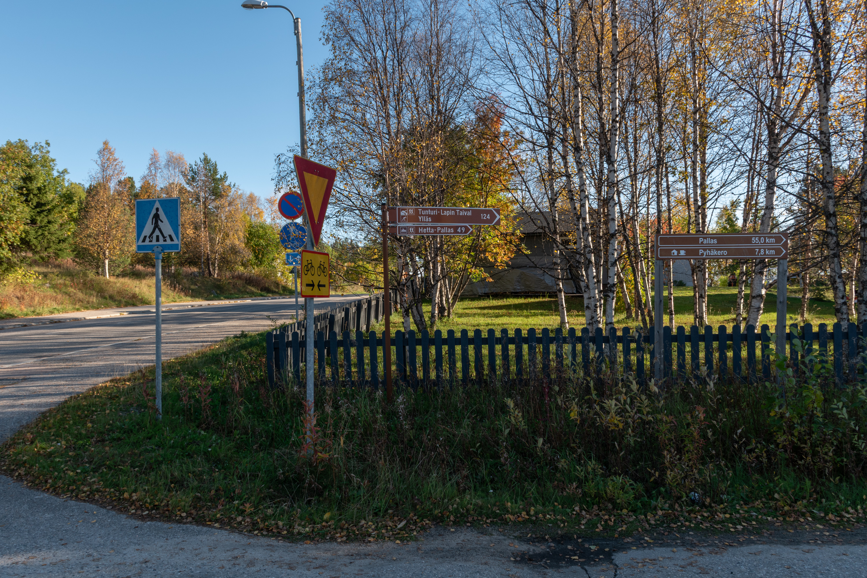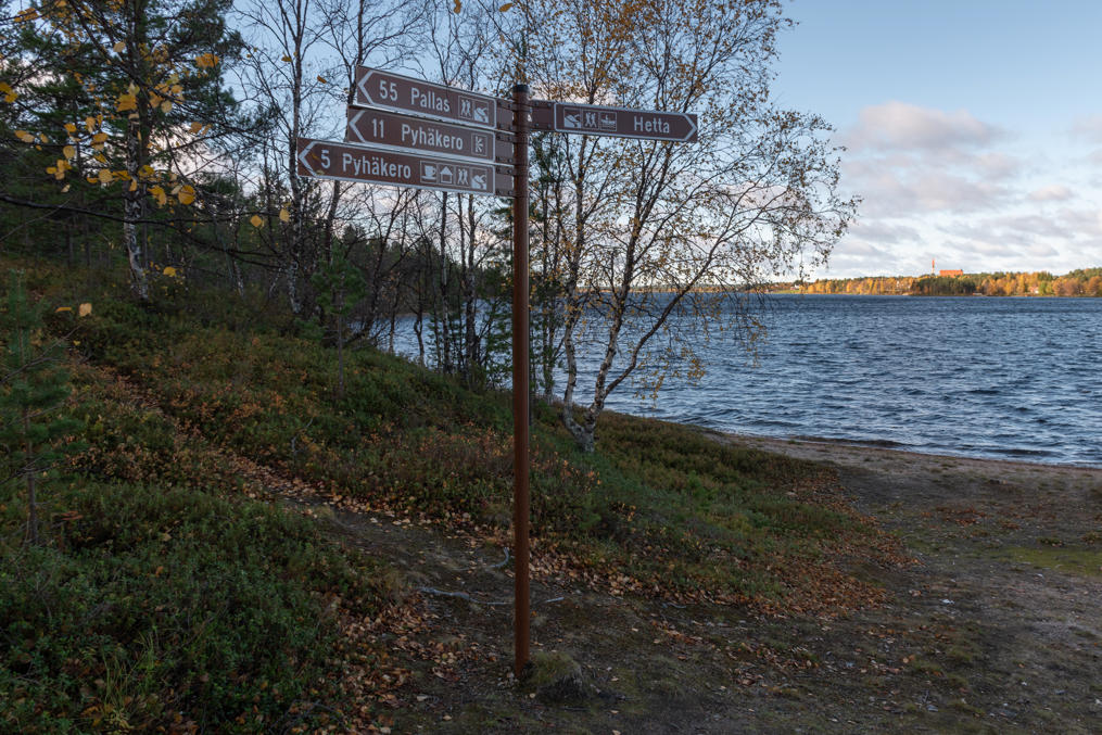 4. А такие указатели из центра, с главной улицы, показывают на небольшую озерную пристань, откуда и перевозят туристов на лодках к маршруту занимающиеся этим предприниматели. Вот прямо тут видно, что указатели на Паллас сильно расходятся между собой, один показывает традиционные 55 км, а другой 49 км (по факту 48, но тут, видимо, прибавили километр на собственно пересечение озера). Насколько точен указатель с 124 км до Юлляса, сказать не могу.
