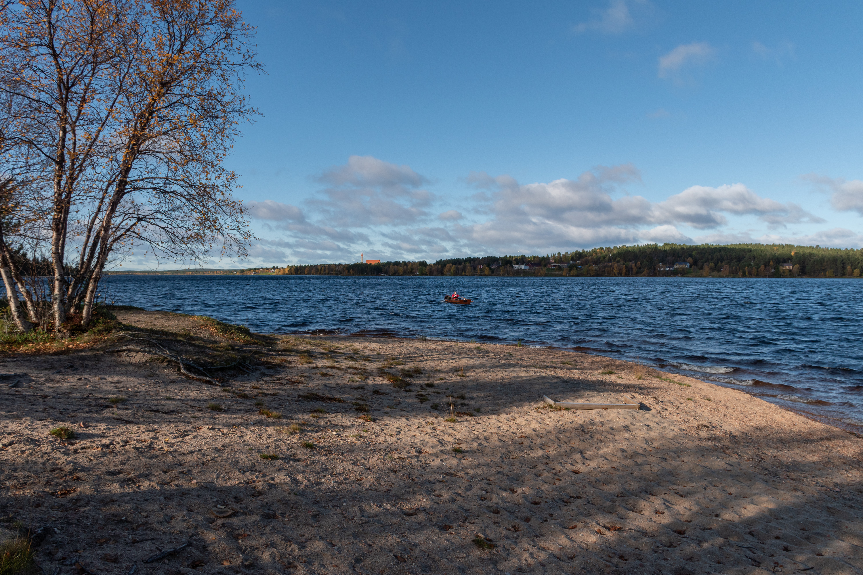 7. И уже в 11:45 я стоял на небольшом пляже на южном берегу Оунасъярви, у совсем маленькой пристани, с которой начинается собственно маршрут на Паллас. Геральд гребет обратно, за озером видна Хетта — церковь и выходящие к берегу дома.